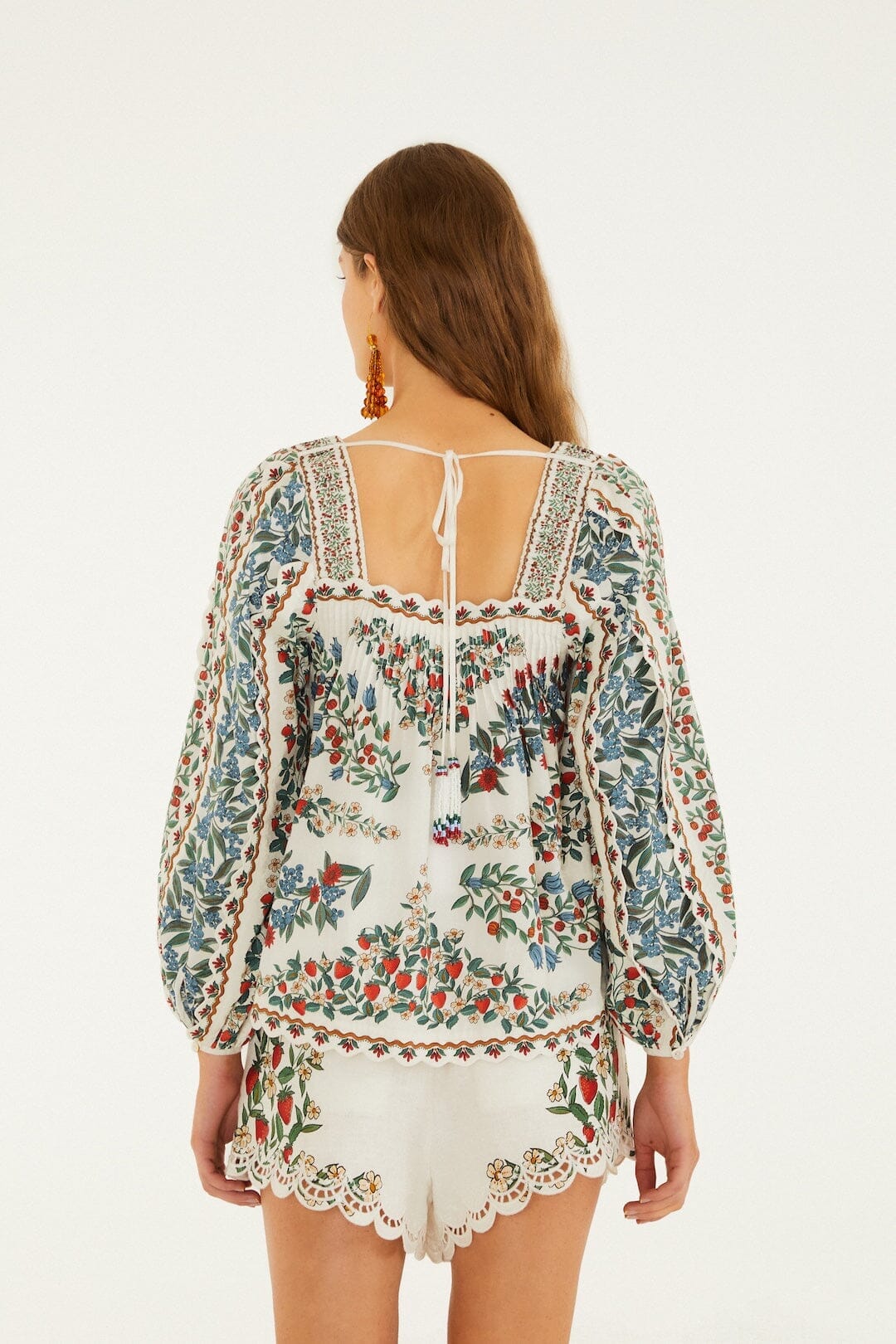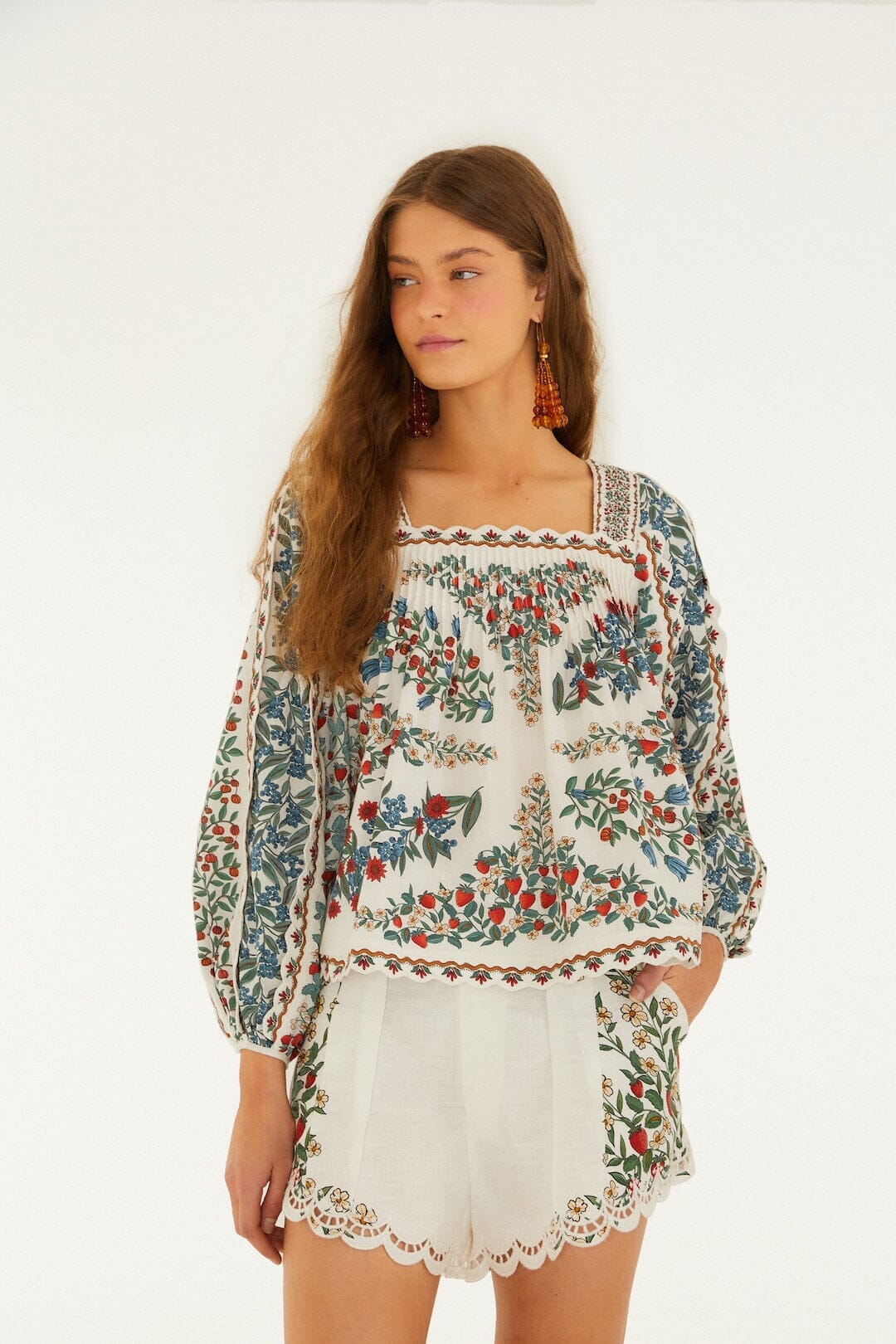 Mit der Off-White Fruit Beauty Scarf Bluse von FARM Rio verleihen Sie Ihrem Look mühelos Charme. Die Bluse aus Bio-Baumwolle besticht durch ihren weichen, cremeweißen Stoff und ist mit lebendigen, verspielten Fruchtmustern verziert, die jedem Outfit eine fröhliche Note verleihen. Der schmeichelhafte, eckige Ausschnitt betont das Schlüsselbein, während die langen Ärmel für eine luftige, entspannte Passform sorgen. Diese Bluse vereint Komfort und Verspieltheit – perfekt für alle, die sich einen Hauch brasilianischer Wärme in ihrer Garderobe wünschen.