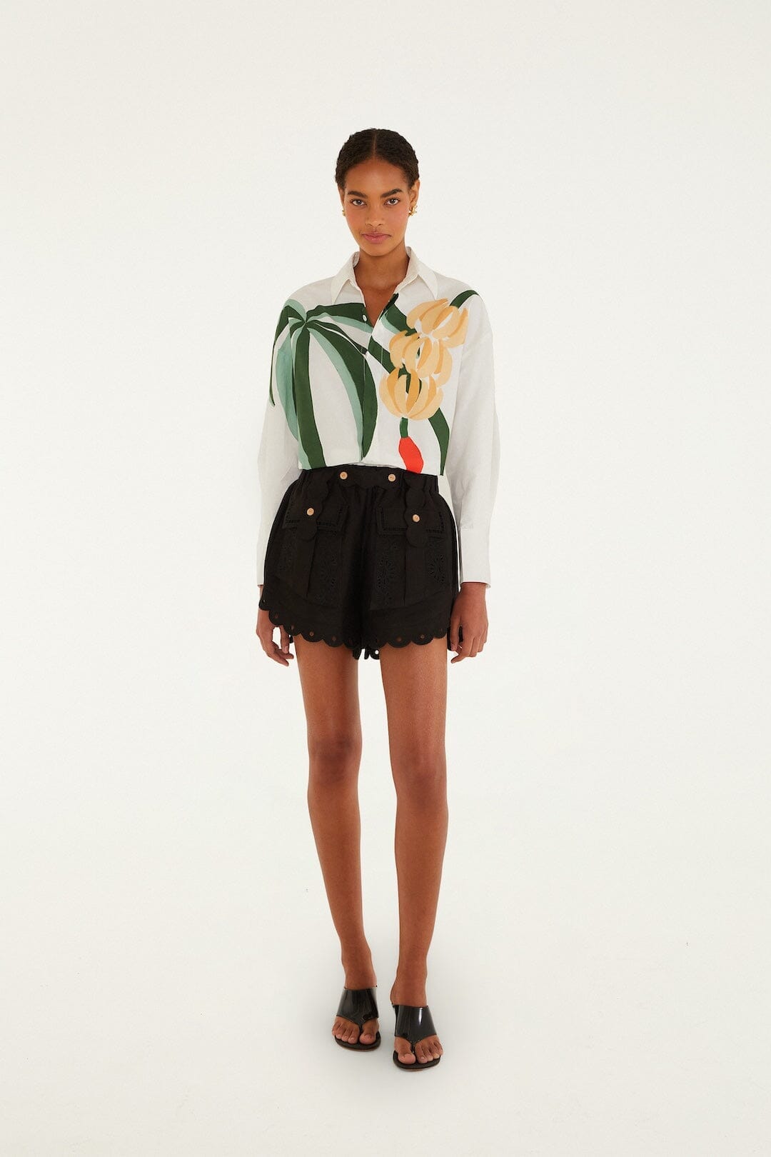 Mit dem Bio-Baumwoll-Applikationshemd „Graphic Banana Tree“ von FARM Rio versprühen Sie tropischen Charme. Das verspielte Oberteil aus weicher Bio-Baumwolle besticht durch farbenfrohe Bananenbaum-Applikationen, die den Dschungel zum Leben erwecken. Der elegante Kragen sorgt für Struktur, während die lockere Silhouette höchsten Tragekomfort garantiert. Voller Farbe und verspielter Details ist es ein fröhliches Statement-Piece, das die Natur mit einem frischen, künstlerischen Touch feiert.