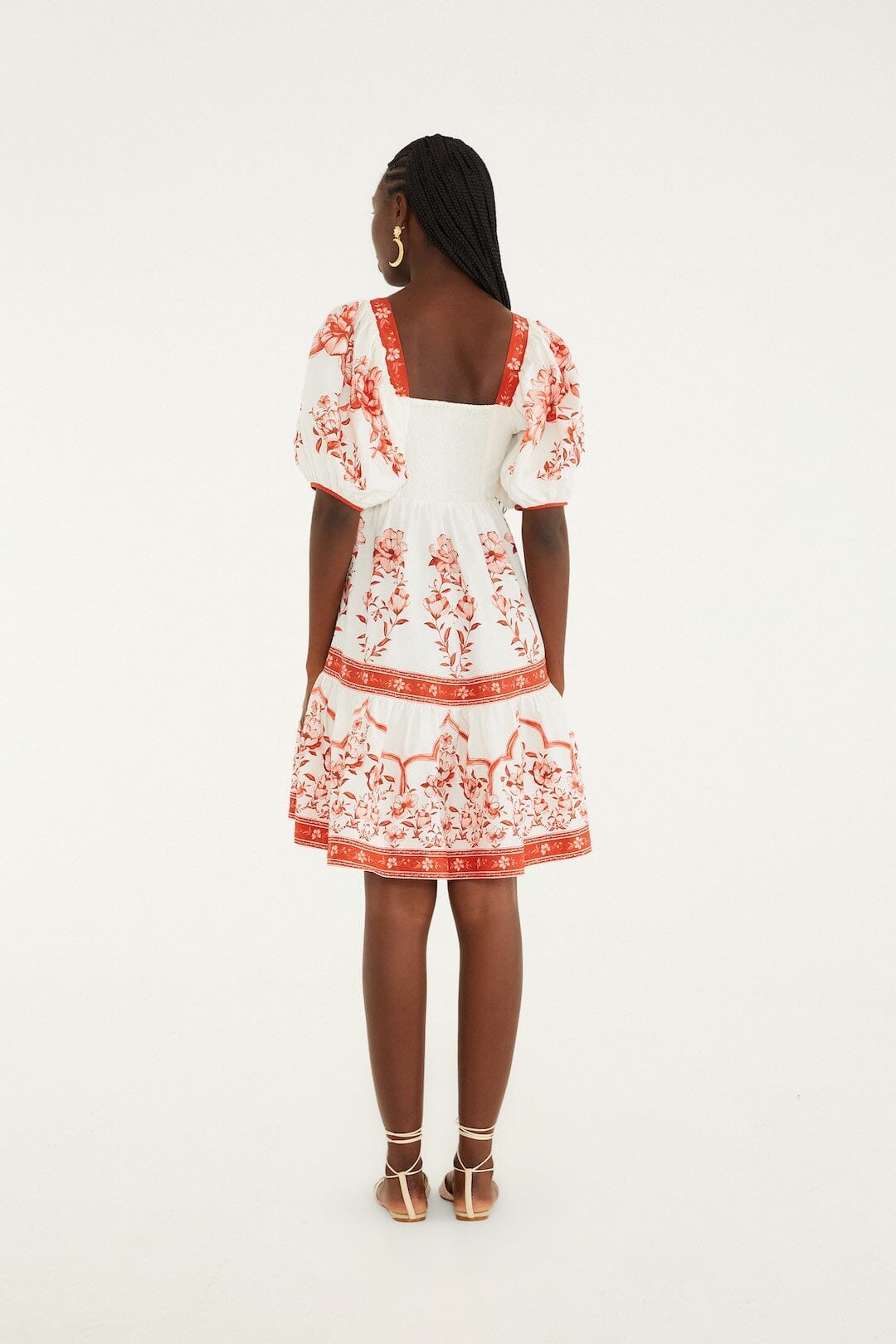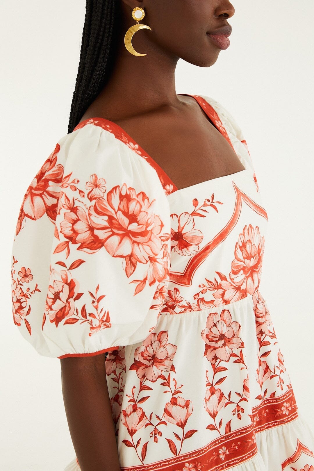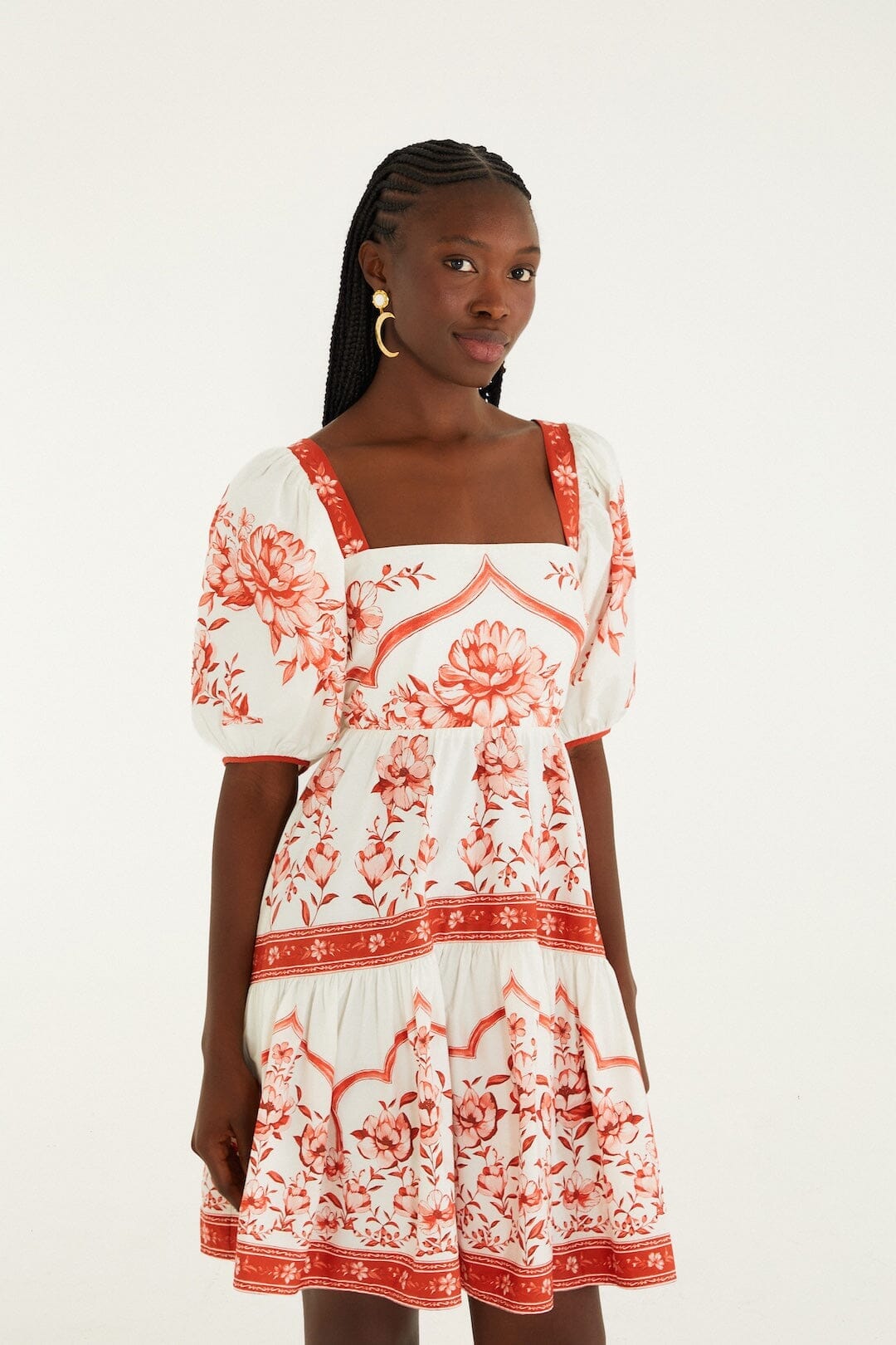 Erleben Sie fröhliche Eleganz mit dem roten Minikleid „Porcelain Garden“ aus Bio-Baumwolle von FARM Rio. Dieses verspielte Kleid besticht durch ein lebendiges Blumenmuster in satten Rot- und zarten Weißtönen auf atmungsaktiver Bio-Baumwolle. Der schmeichelhafte eckige Ausschnitt und die leicht gepufften Ärmel zaubern eine leichte, luftige Silhouette, während dezente Raffungen für einen Hauch von Romantik sorgen. Dieses vielseitige Kleid fängt die Stimmung unbeschwerter Nachmittage und fröhlicher Gartenfeste perfekt ein.