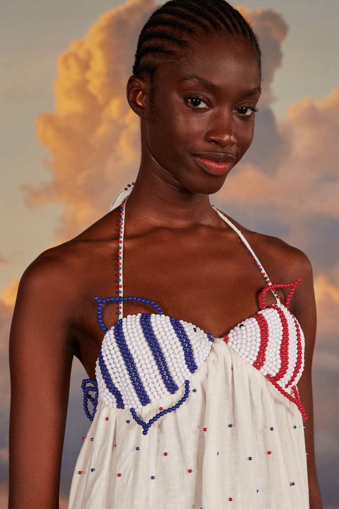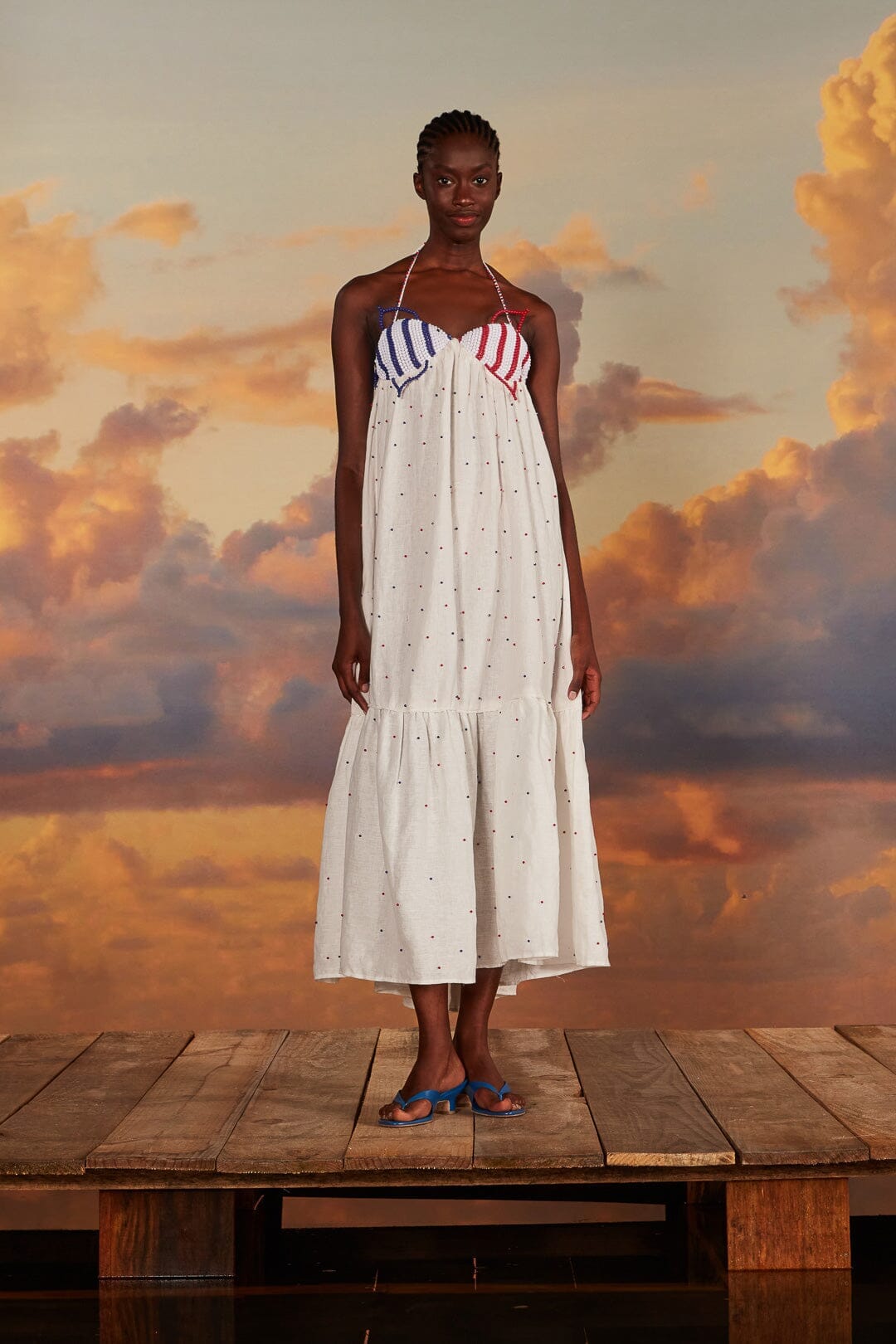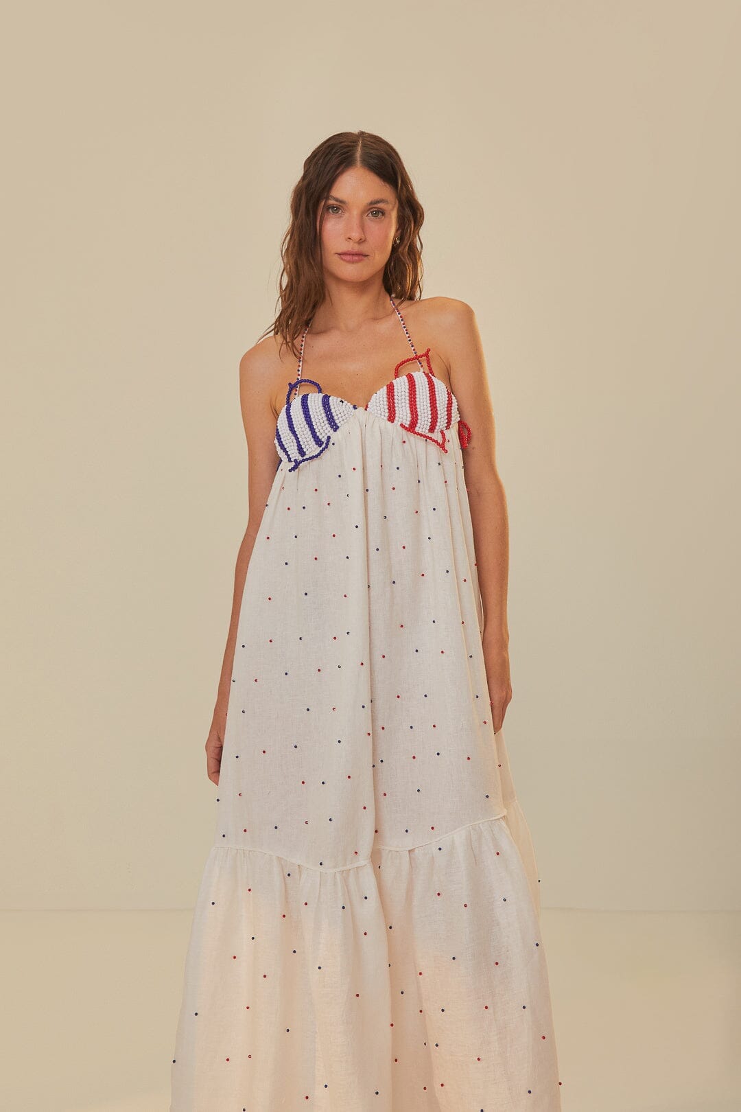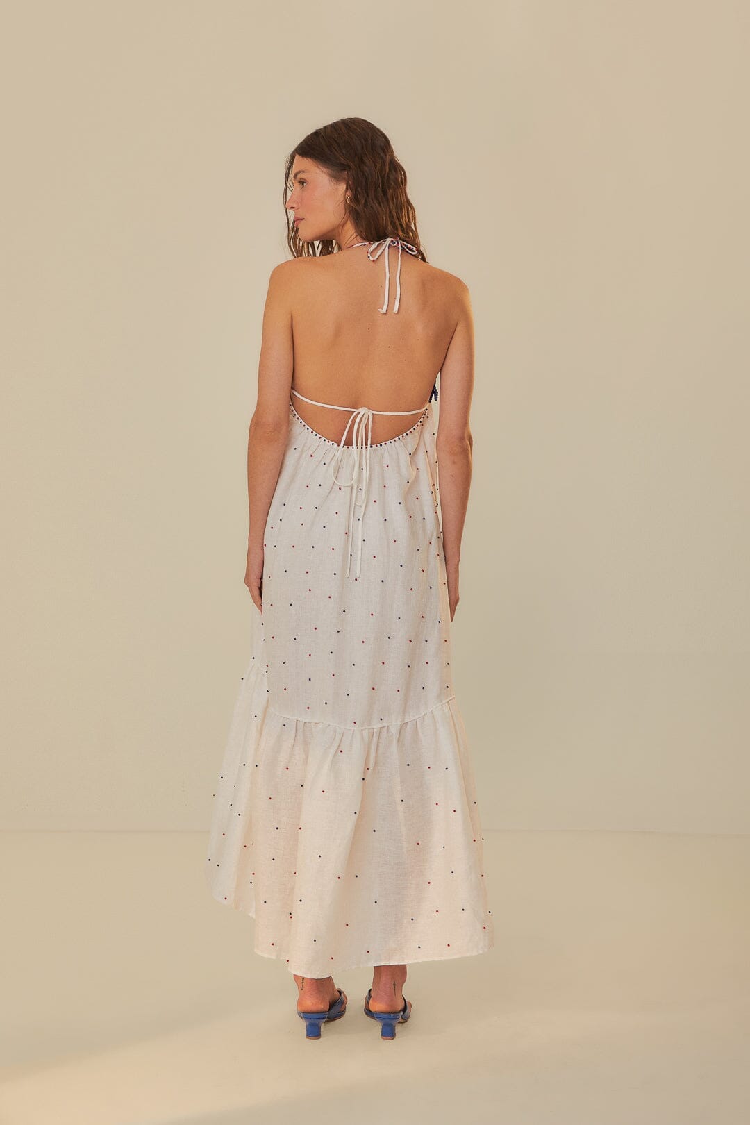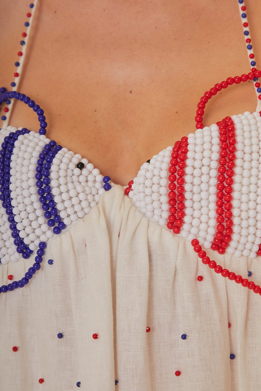 Adorn your summer with the White Beaded Fishes Sleeveless Maxi Dress, beautifully crafted with intricate beaded fish motifs in patriotic hues. This airy piece floats effortlessly with its tiered skirt, while delicate multicolored beading adds a playful touch. Its open back design is tied with charming tassel details, perfect for balmy evenings. Crafted from carefully selected materials, this dress is as gentle on the earth as it is on the skin.