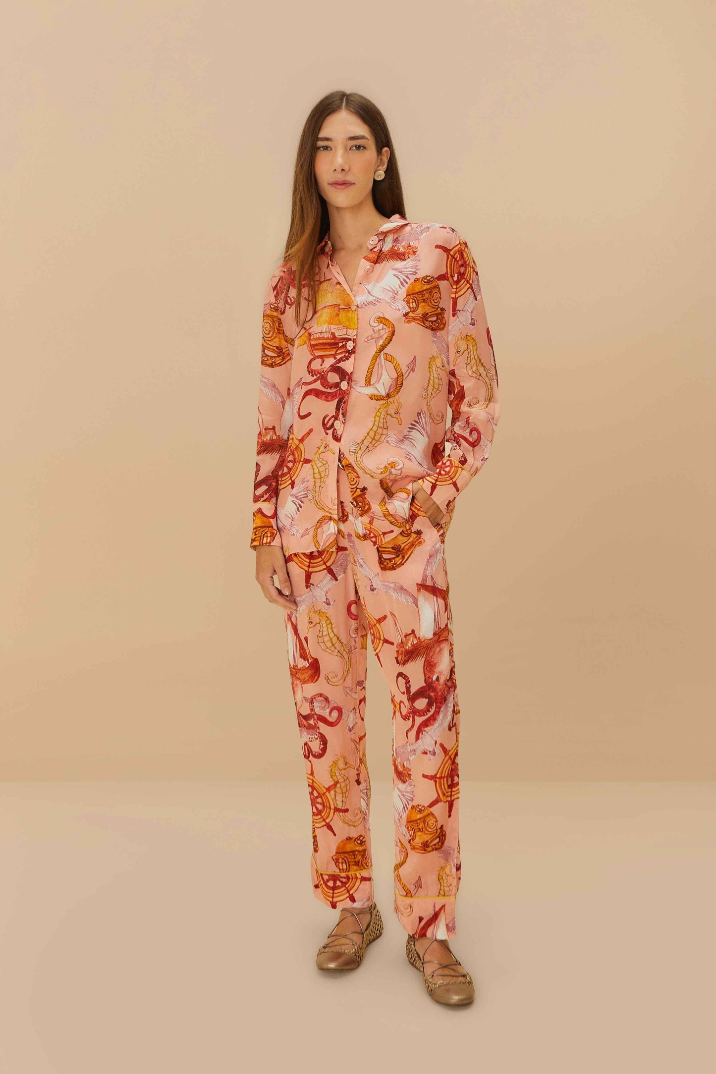 Dive into serene dreams with the Pink Nautical Wonder Pajama Pants from FARM Rio. Featuring whimsical nautical motifs in vibrant reds and golds on a soft pink canvas, these pants blend playful elegance with comfort. The relaxed silhouette drapes effortlessly, making them not just sleepwear but a statement piece. Perfect for cozy nights or lazy mornings, let these pants whisk you away on a sea of tranquility.