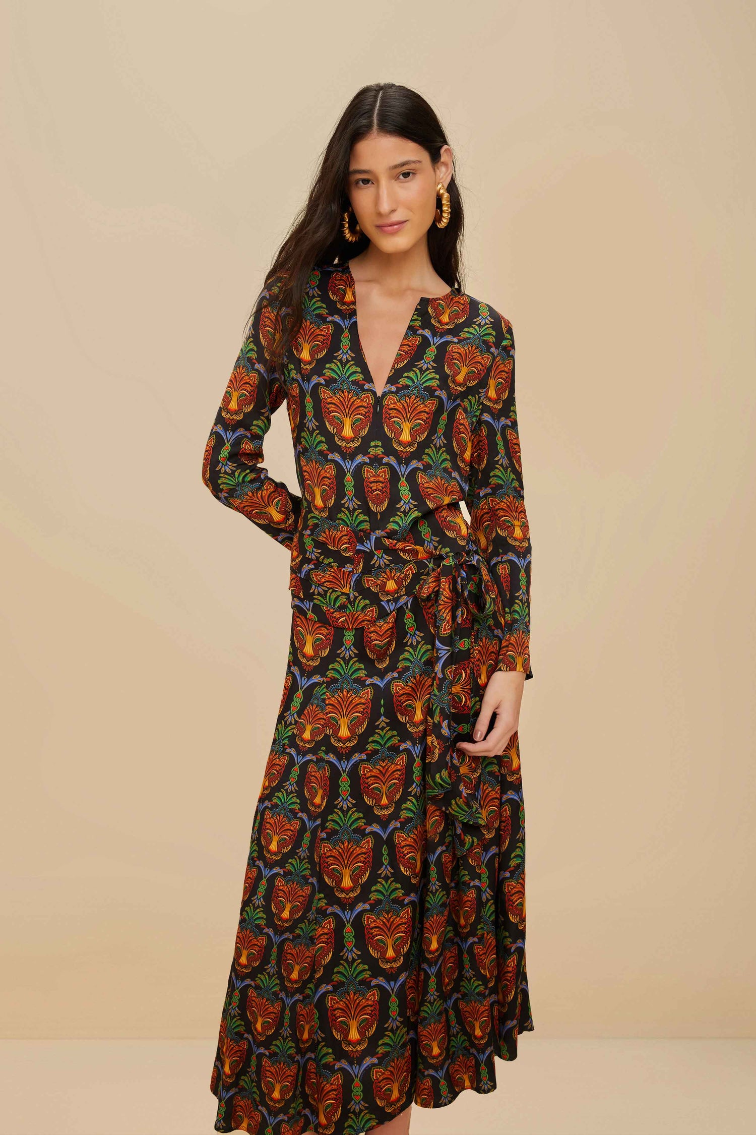 The Black Boho Panther LENZING™ ECOVERO™ Viscose Midi Dress enchants with its bold panther pattern and rich earthy tones. The fluid silhouette cascades gracefully to a midi length. Its round neckline and long sleeves bring an air of relaxed elegance. Crafted from responsible materials, this dress captures a playful spirit while ensuring effortless comfort and unique style.