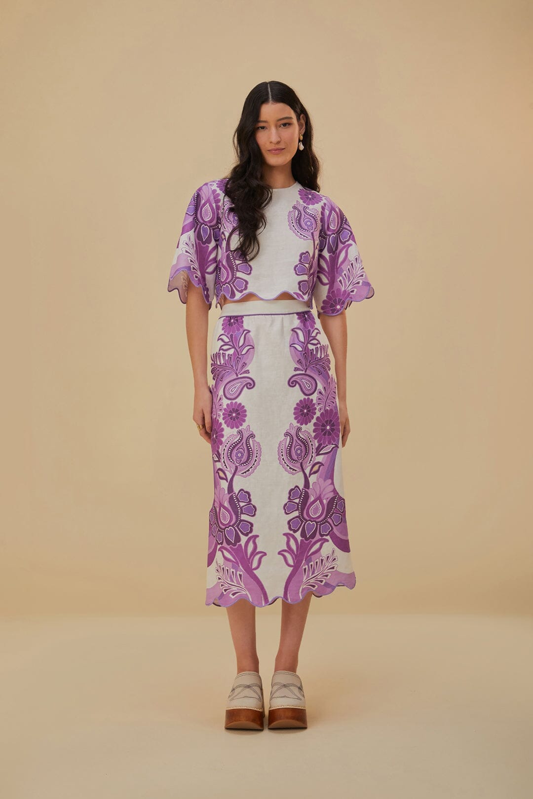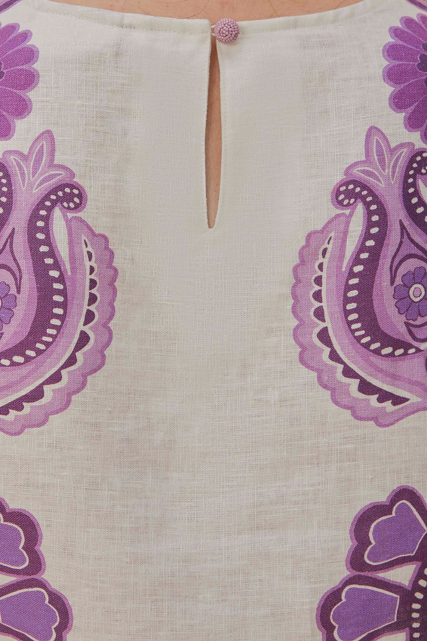 Adoptez le dynamisme du chemisier court Color Festival Cream Euroflax™, une toile crème ornée de motifs cachemire et floraux violets vifs. Son encolure ronde et sa silhouette courte sont un clin d'œil ludique à la féminité moderne, tandis que ses manches cloche fluides ajoutent une touche d'élégance. Fabriquée à partir de matériaux Euroflax™ consciencieusement choisis, cette pièce ajoute non seulement une touche de joie à votre garde-robe, mais s'aligne également sur des choix de mode conscients.