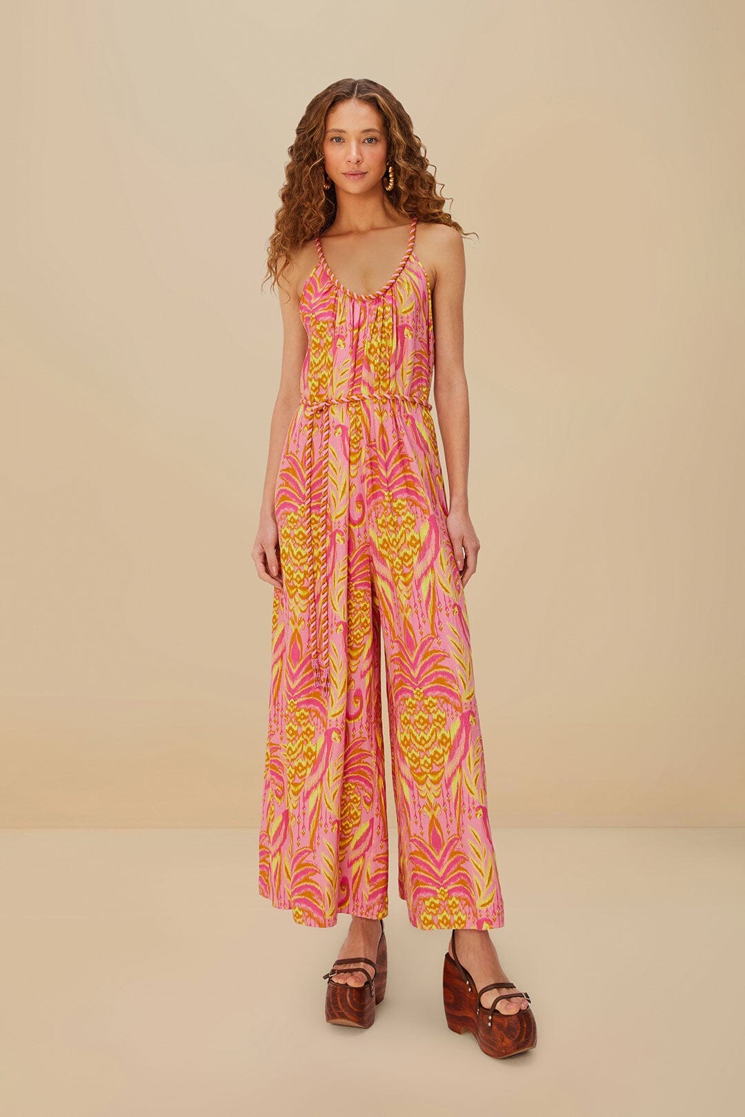The Pink Pineapple Tapestry LENZING™ ECOVERO™ Euroflax™ Jumpsuit is a vibrant celebration of color and comfort. Embrace its playful pineapple pattern in shades of pink and yellow, designed to delight. The flowing silhouette and round neckline enhance every movement, while the braided straps add a touch of whimsy. Crafted from responsible materials, this jumpsuit effortlessly combines style with thoughtful elegance for a joyful addition to any wardrobe.