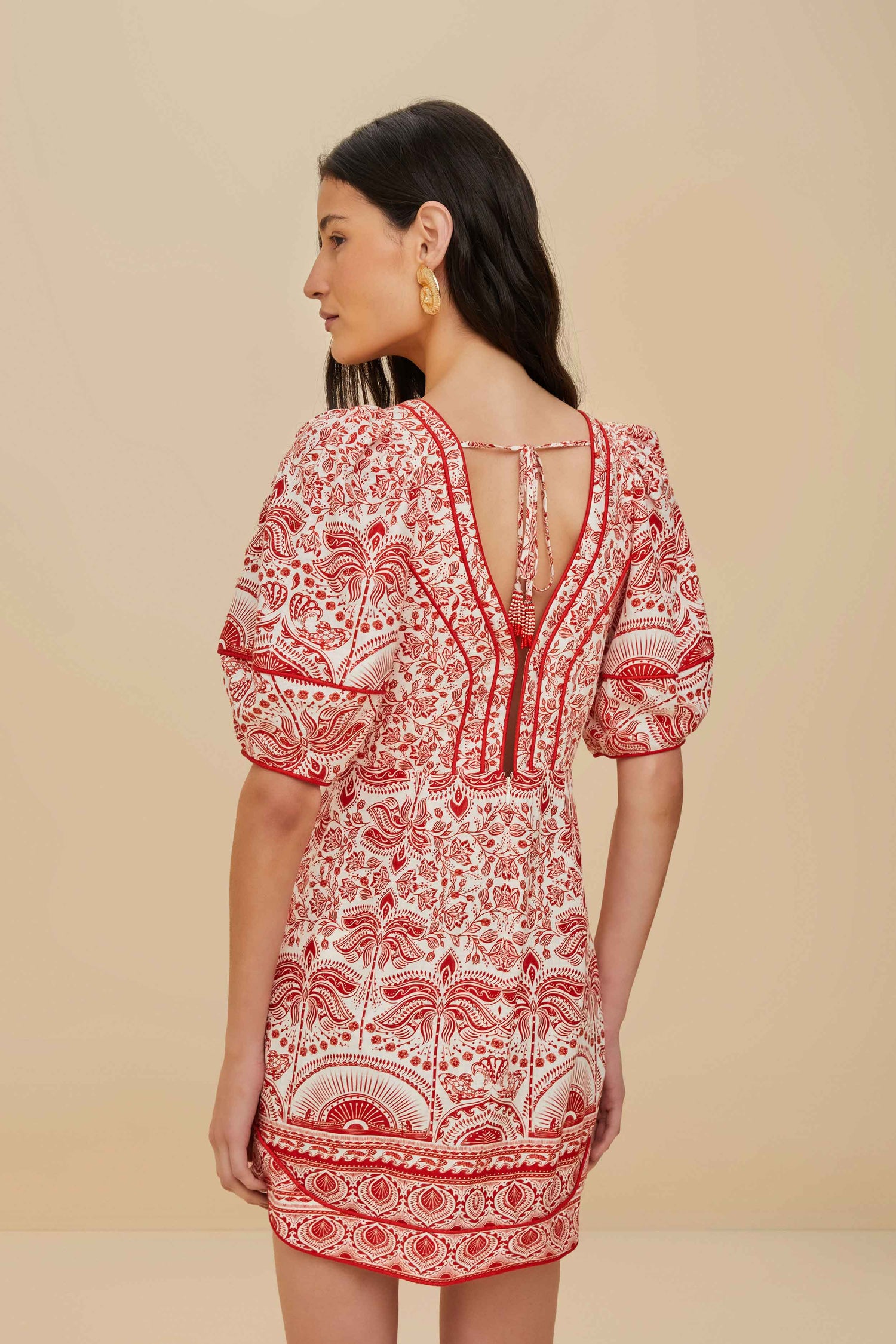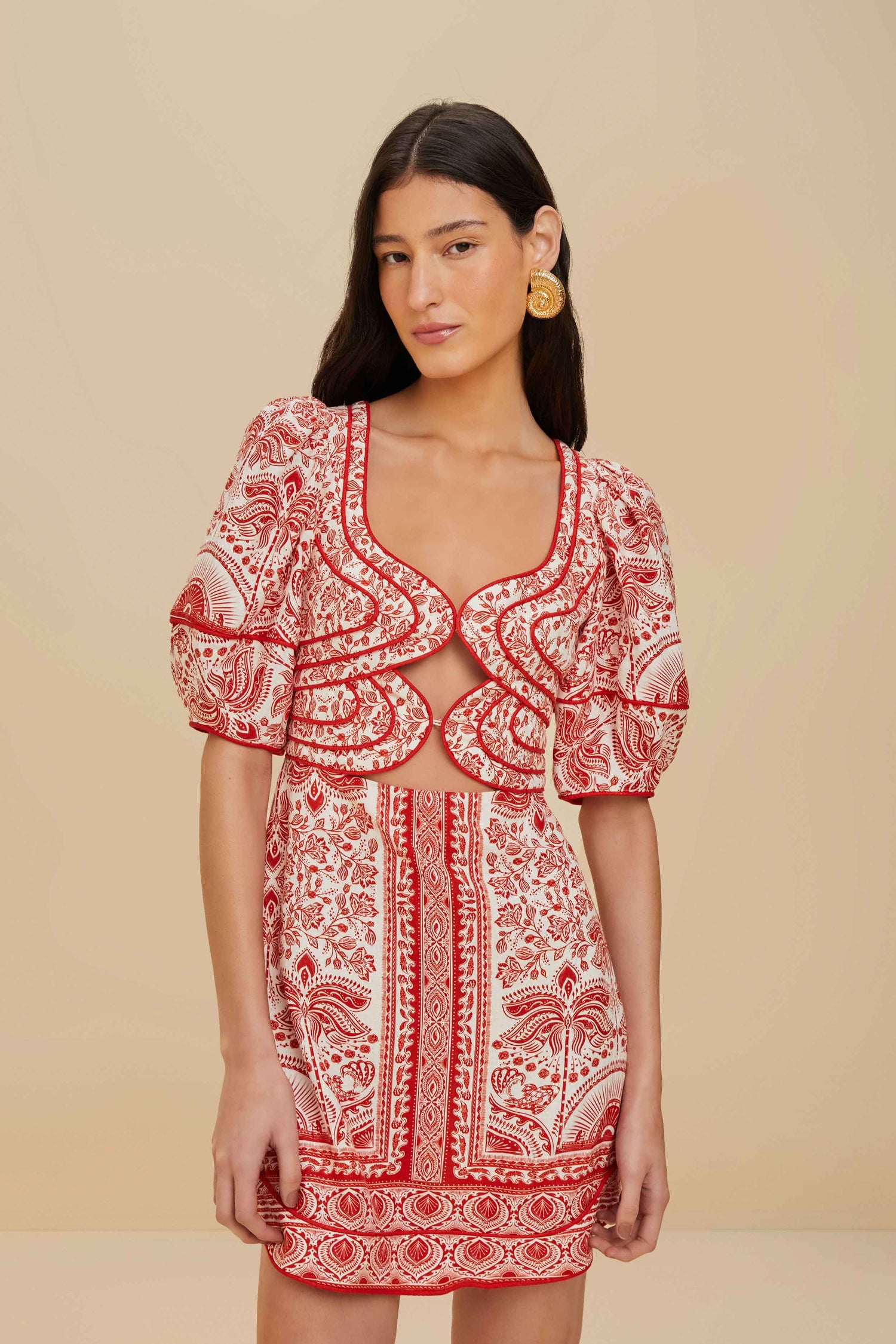 Discover the effortless charm of the Red River Ride LENZING™ ECOVERO™ Euroflax™ Mini Dress. Embraced with a sweetheart neckline, this dress blossoms in vivid red patterns, delicately intertwining floral motifs with playful shapes. The voluminous sleeves add a touch of whimsy, while the carefully crafted cutout design creates a playful silhouette. Made from responsible materials, it promises both style and conscious comfort. Let your wardrobe be a canvas.