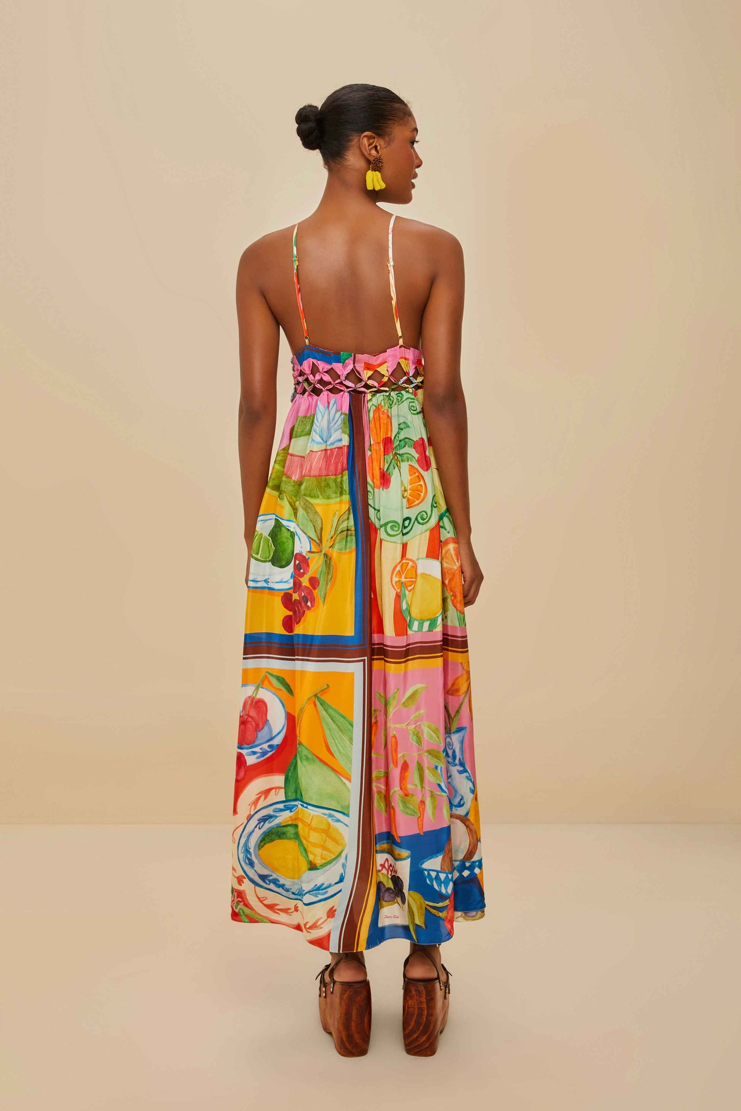 The multicolor summer picnic macrame yoke maxi dress by FARM Rio is a vibrant celebration of tropical joy. Its enchanting V neckline flows into a captivating macrame yoke, while the playful array of colors and picnic-inspired patterns evoke warmth and adventure. The flowing silhouette captures the essence of leisurely summer days, adding a playful charm that effortlessly captures attention and hearts alike.