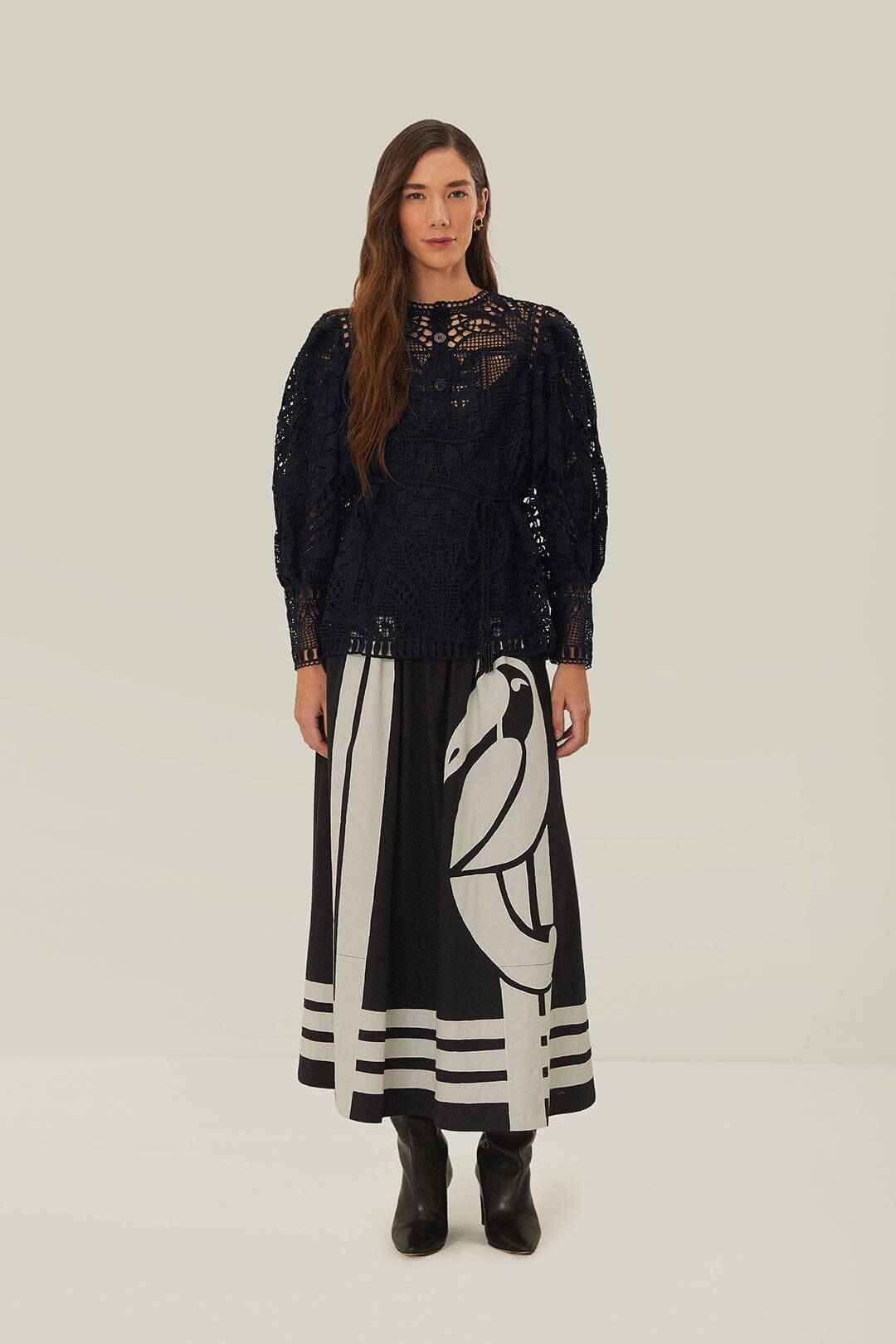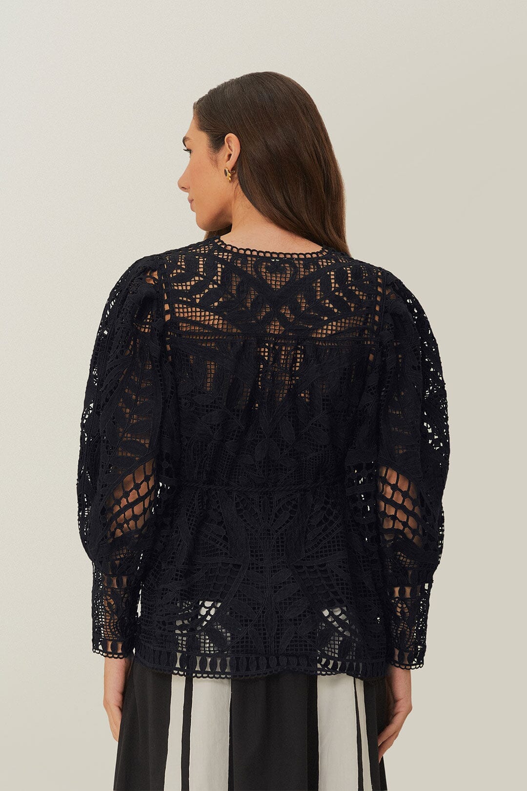 Adoptez la complexité artistique du chemisier à manches bouffantes en guipure noire de FARM Rio. Cette pièce charme par son artisanat délicat en dentelle guipure et ses manches bouffantes spectaculaires, créant une silhouette à la fois romantique et affirmée. L'encolure ronde encadre le visage avec élégance, tandis que la taille cintrée avec cordon de serrage ajoute une touche de structure gracieuse. Vêtu d'un noir intemporel, c'est un ajout enchanteur à toute garde-robe, parfait pour celles qui convoitent une touche de style brésilien.