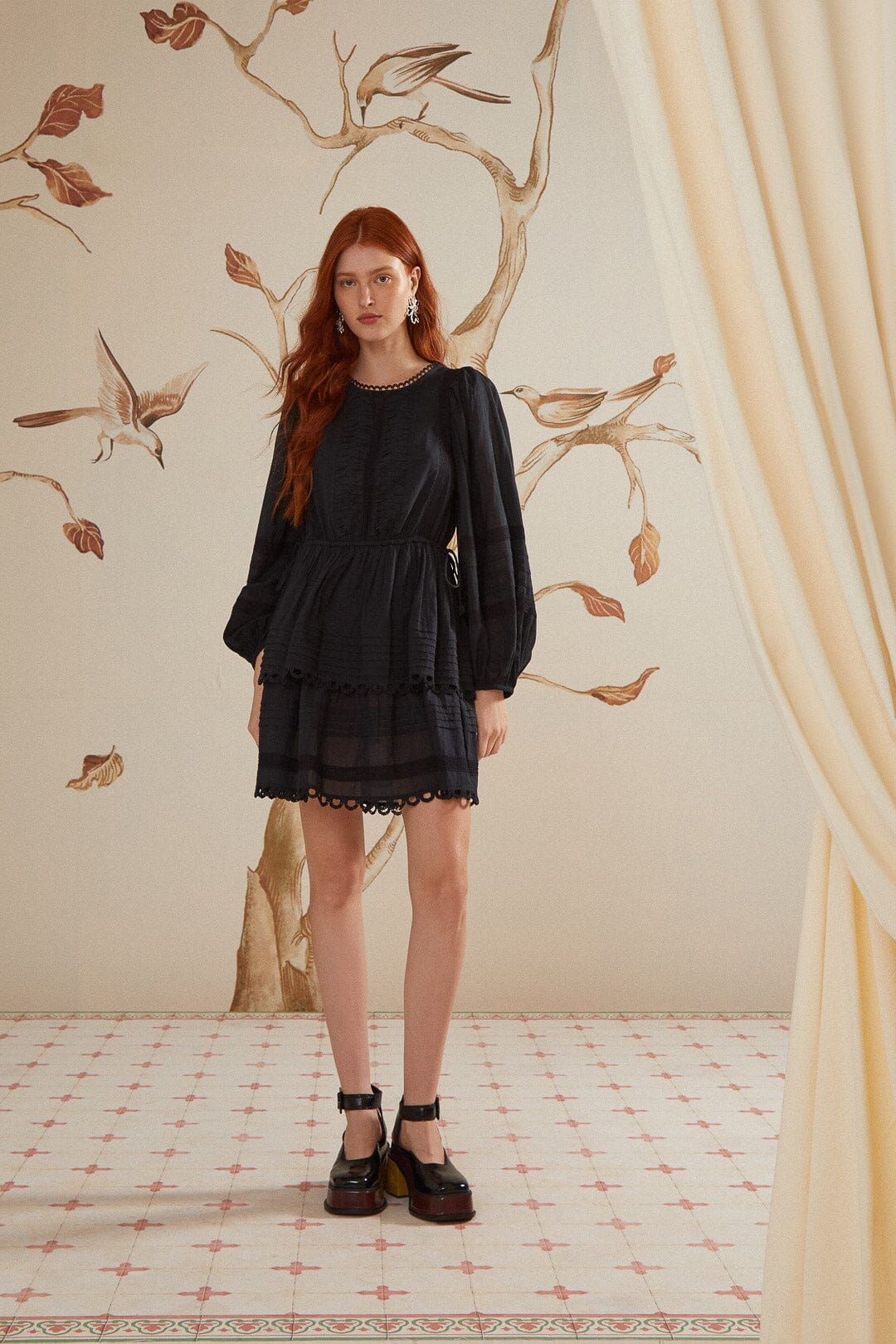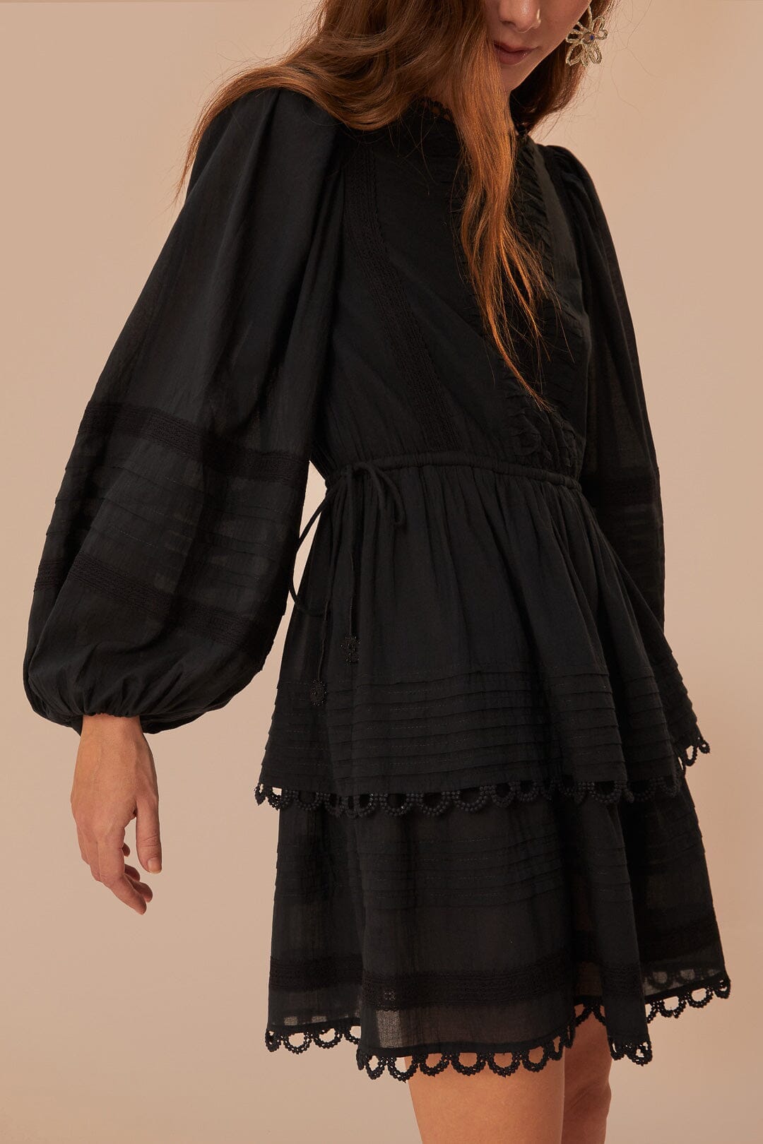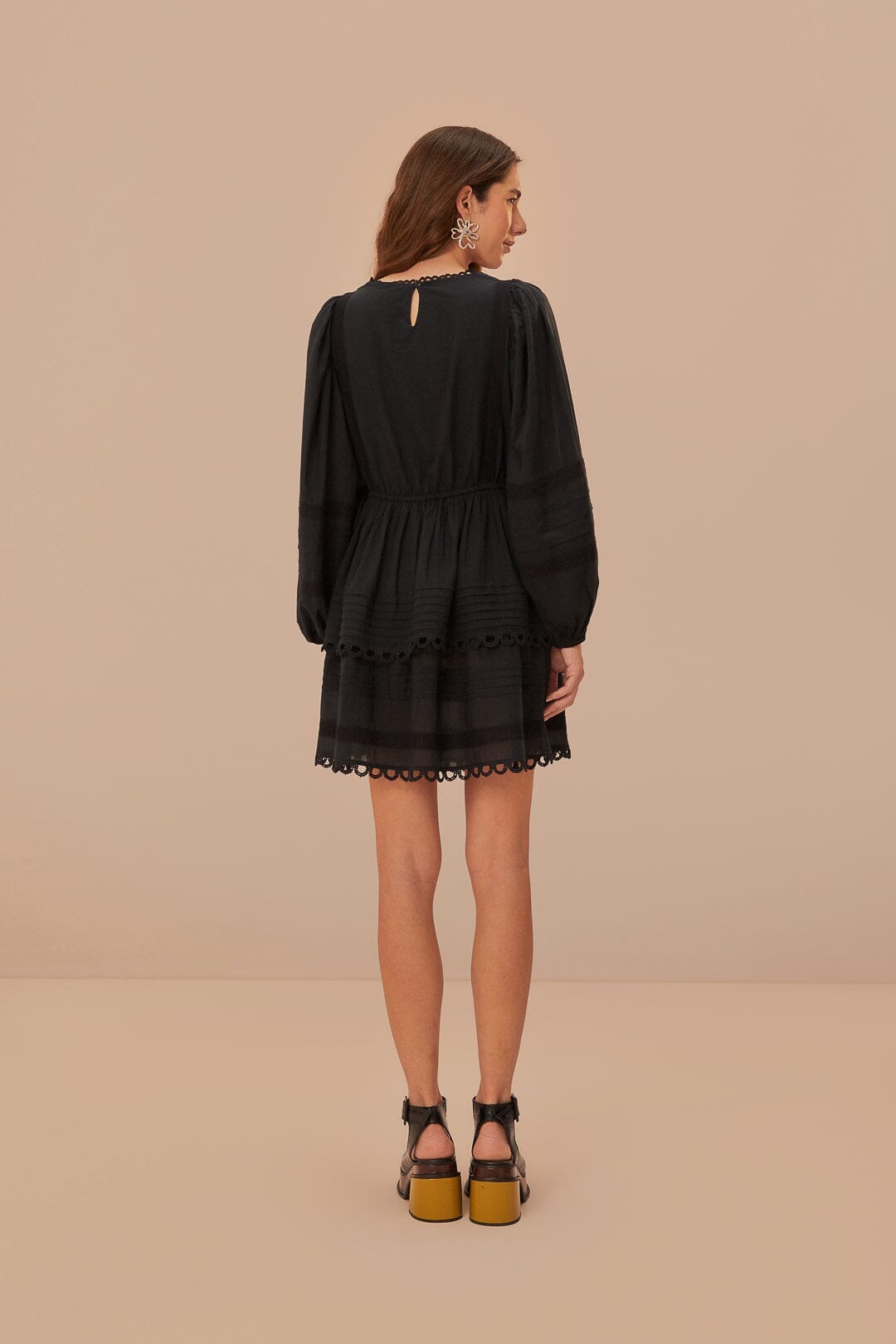 Adoptez l'élégance sans effort avec la mini-robe à manches longues en dentelle noire de FARM Rio. Cette pièce charme par sa combinaison unique de mosaïques subtiles et de motifs de dentelle circulaires, créant une danse harmonieuse sur une luxueuse toile noire. Les longues manches ballon et la taille cintrée laissent place à une jupe ludique ornée de détails de dentelle fantaisistes. Avec une encolure ronde captivante, cette robe captive par sa sophistication discrète et sa silhouette décontractée mais raffinée.