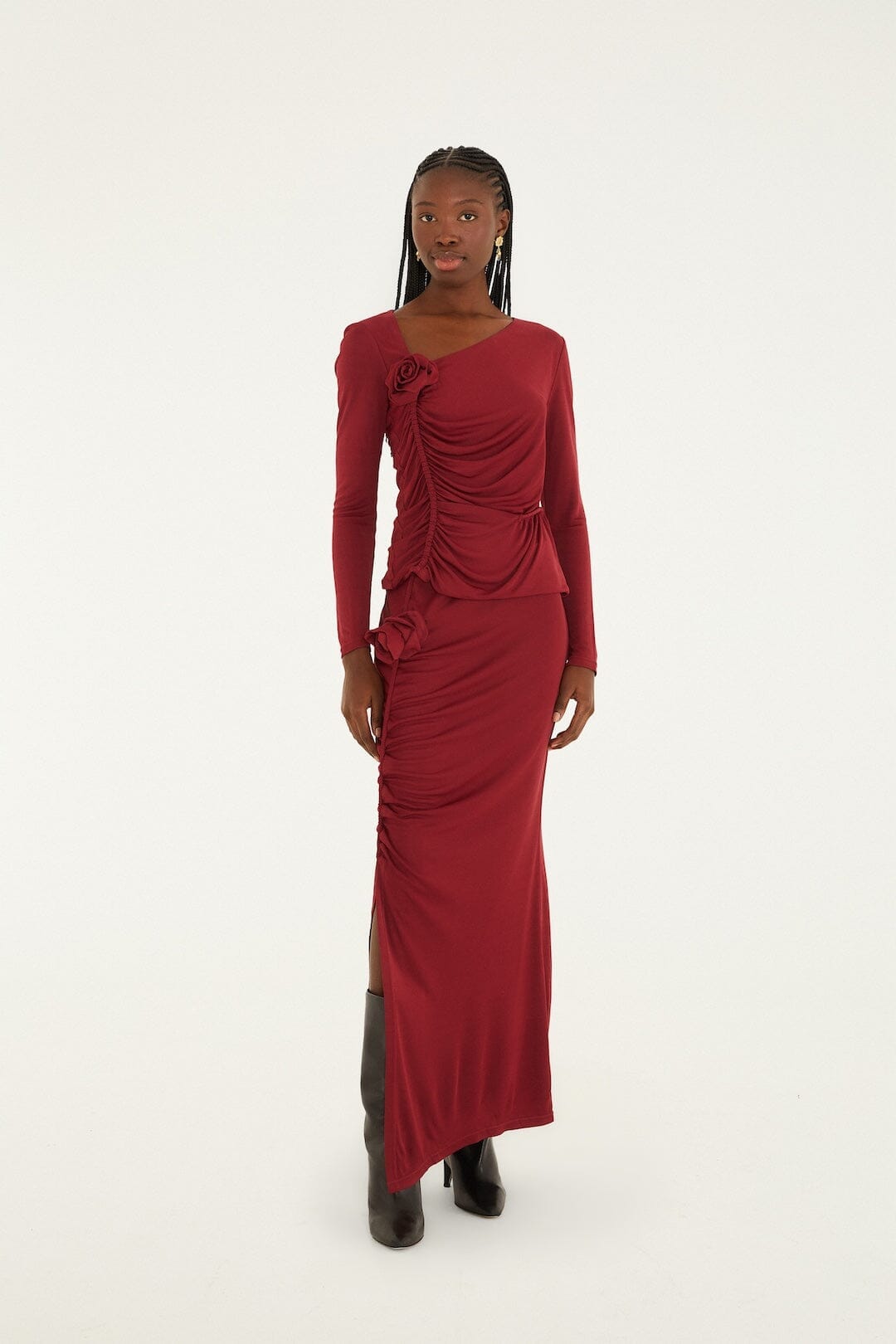 Embrace the charm of the Burgundy 3D Flower Draped Long Sleeve Blouse by FARM Rio, where playful elegance meets vibrant spirit. This blouse features an asymmetrical neckline that gracefully frames the collarbone, while richly textured 3D floral appliqués add a tactile allure. Draped sleeves create a soft, flowing silhouette, blending comfort with artistic detail. Bathed in deep burgundy, it invites warmth and bold expression into your everyday wardrobe.