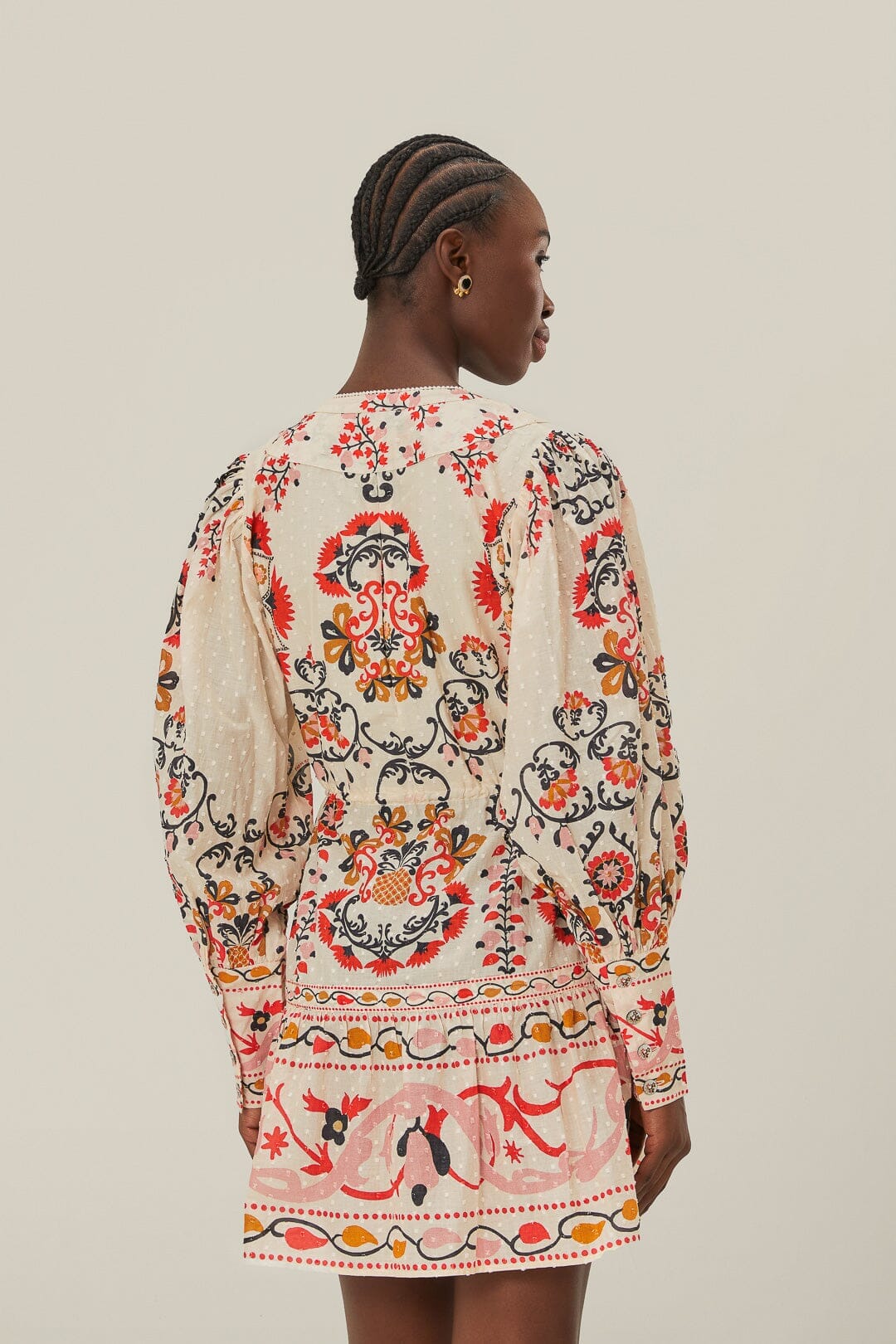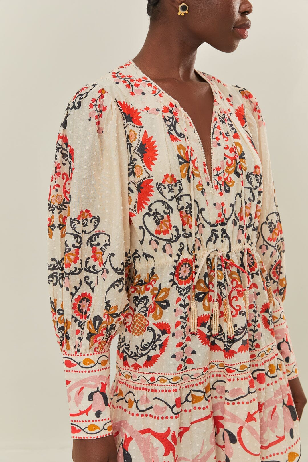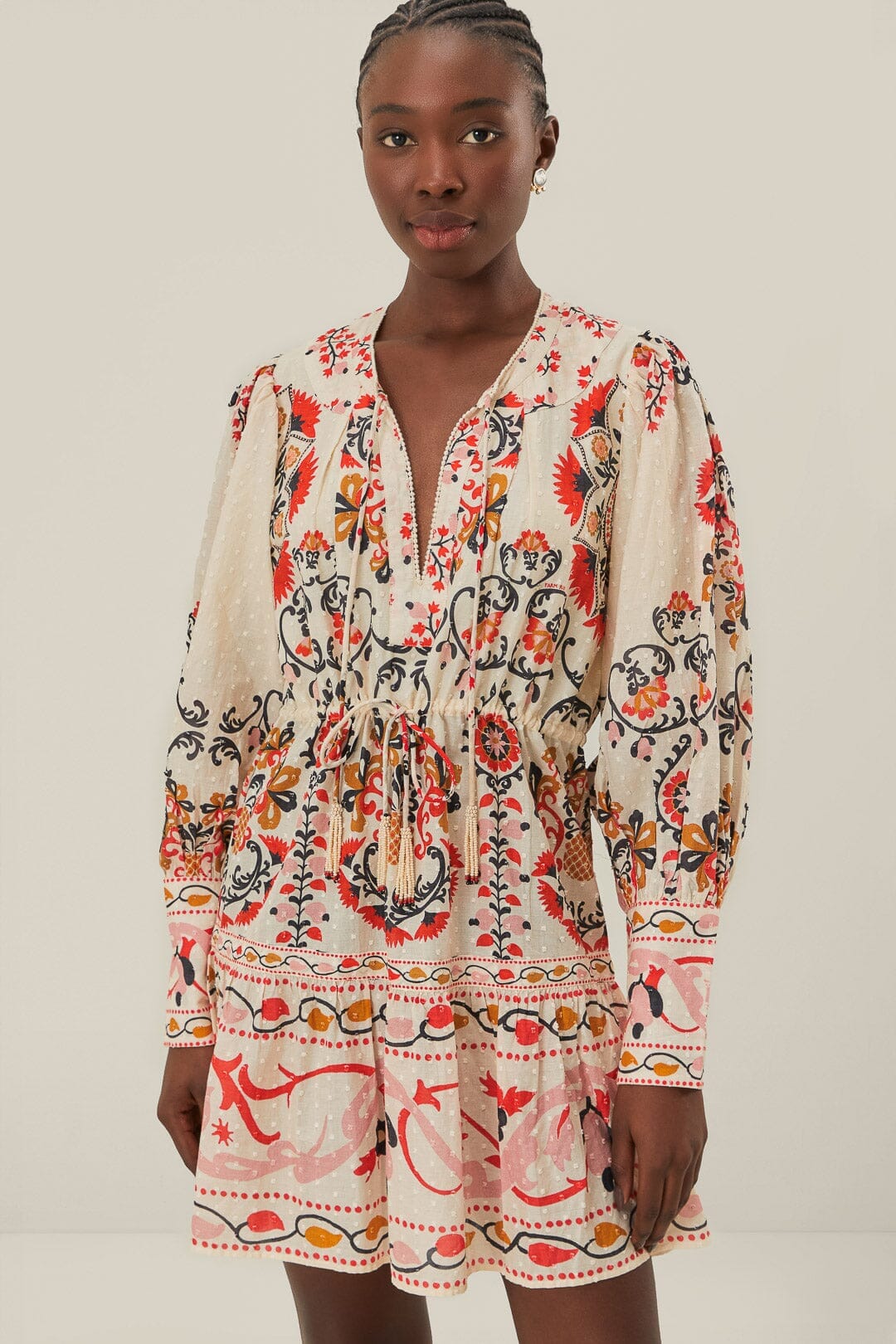 Découvrez l'esprit ludique de la mini-robe mandala Cream Cashew, une pièce qui capture l'essence de la fantaisie tropicale. Ornée d'un imprimé vif inspiré du mandala dans des tons rouges riches, oranges frais et tons terreux, cette robe présente une encolure ronde flatteuse et une silhouette trapèze décontractée. La taille légèrement froncée ajoute une touche de féminité, tandis que les manches longues fluides assurent une grâce confortable et sans effort. Un mélange parfait de couleur et de charme, c'est une célébration de l'habillement artistique.