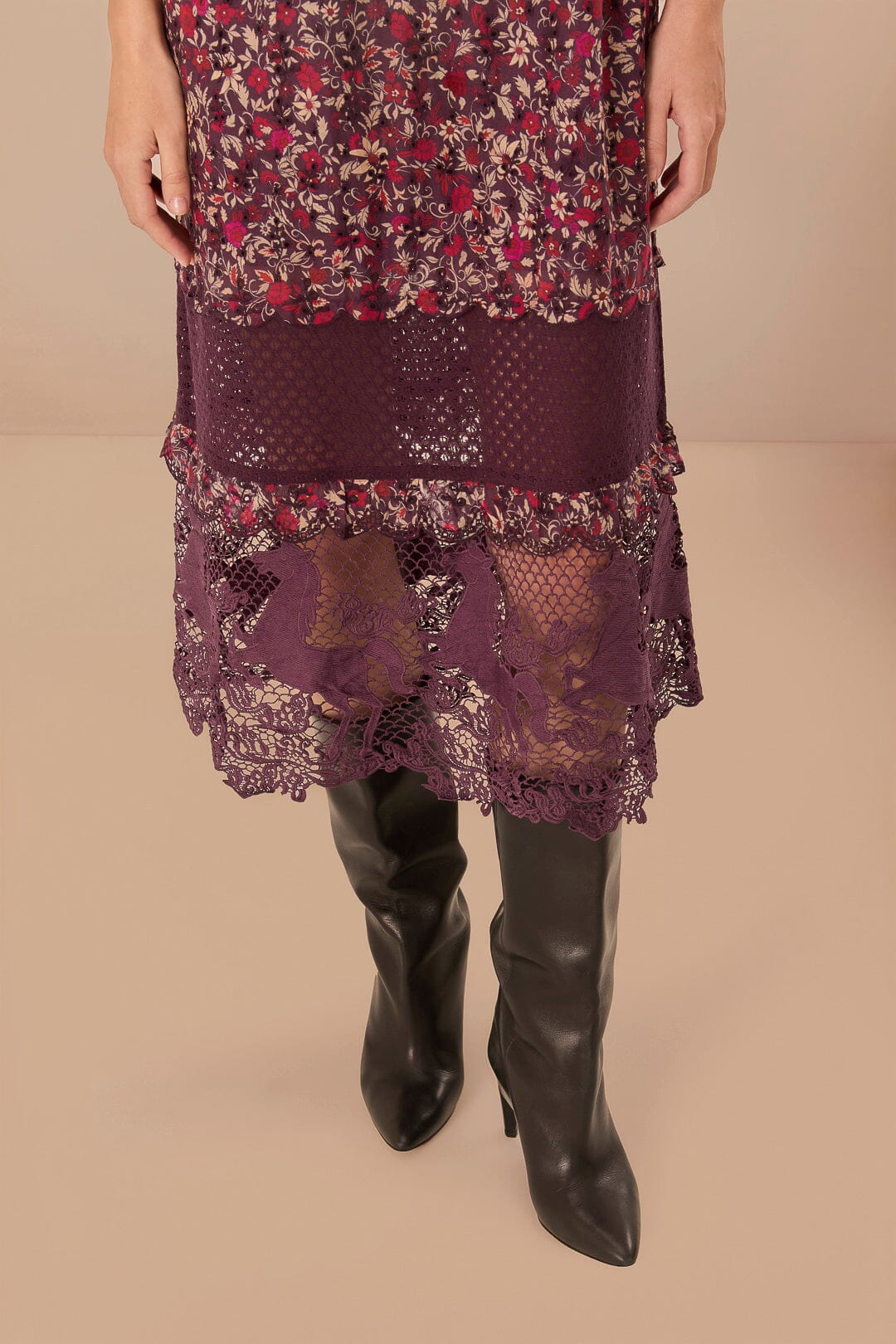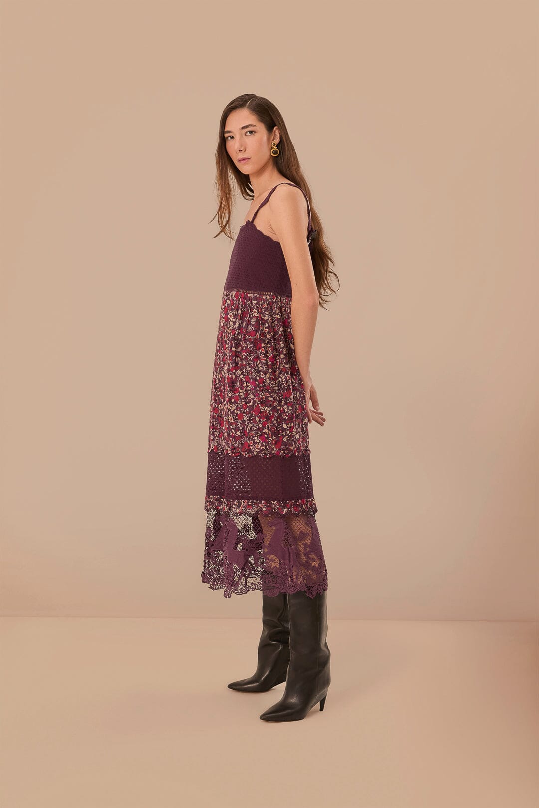 Adoptez le charme envoûtant de la robe mi-longue en dentelle brodée Chelsea Garden violette, dotée d'une encolure carrée fantaisiste qui encadre magnifiquement le décolleté. Une broderie en dentelle délicate rencontre des motifs floraux vibrants, dansant ensemble sur un fond de teintes violettes, créant une symphonie visuelle. L'ourlet en dentelle à plusieurs niveaux ajoute une touche d'élégance bohème, vous invitant à bouger avec grâce et confiance. Cette pièce est une véritable expression de charme poétique et de sophistication.