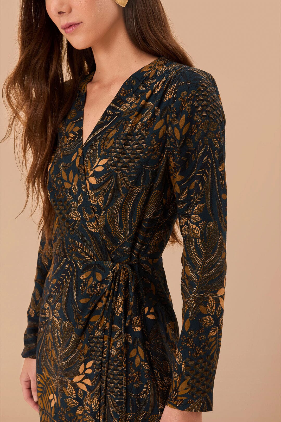 Adoptez la chaleur de la forêt avec la mini-robe portefeuille en viscose LENZING™ ECOVERO™ Teal Dotted Forest. Son mélange séduisant de teintes bleu sarcelle profondes, entrecoupées de délicats motifs de feuillage à pois, jette un sort enchanteur. La silhouette portefeuille flatteuse, cintrée par un lien à la taille, et le gracieux décolleté en V se combinent pour respirent l'élégance. Confectionnée à partir de matières soigneusement sélectionnées, c'est un hommage charmant à la splendeur de la nature qui murmure doucement un charme éco-responsable dans votre garde-robe.