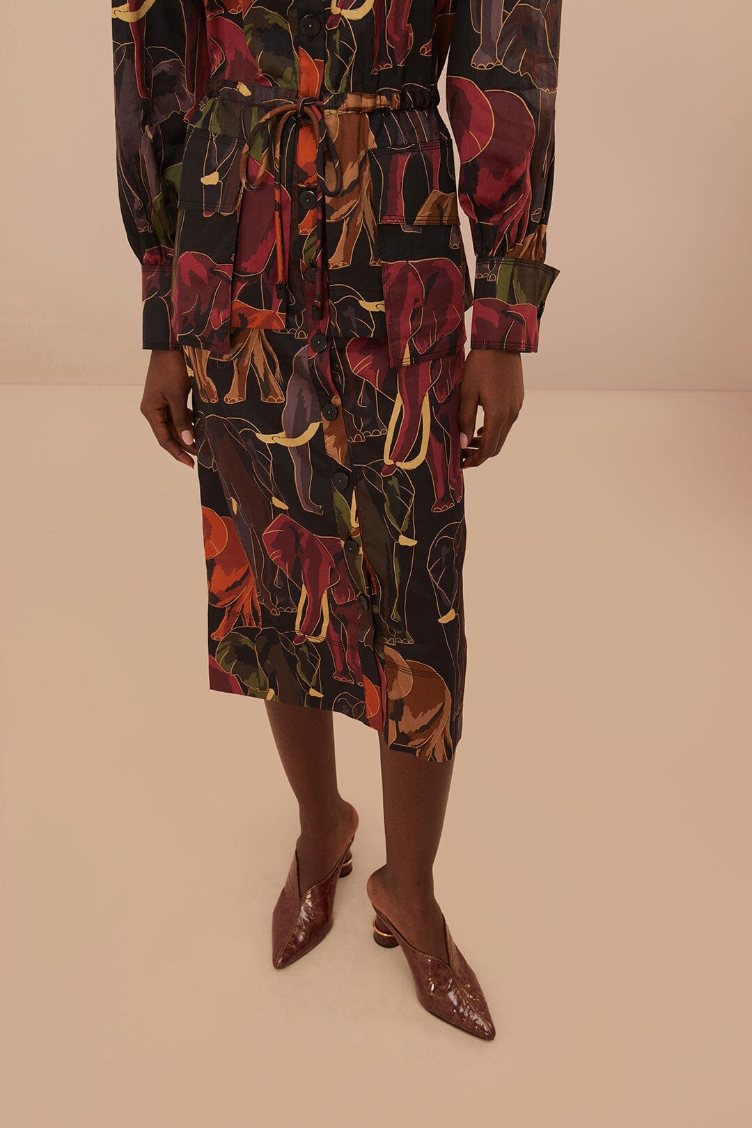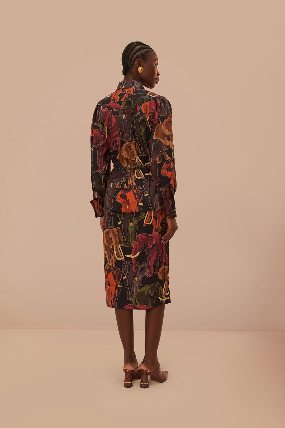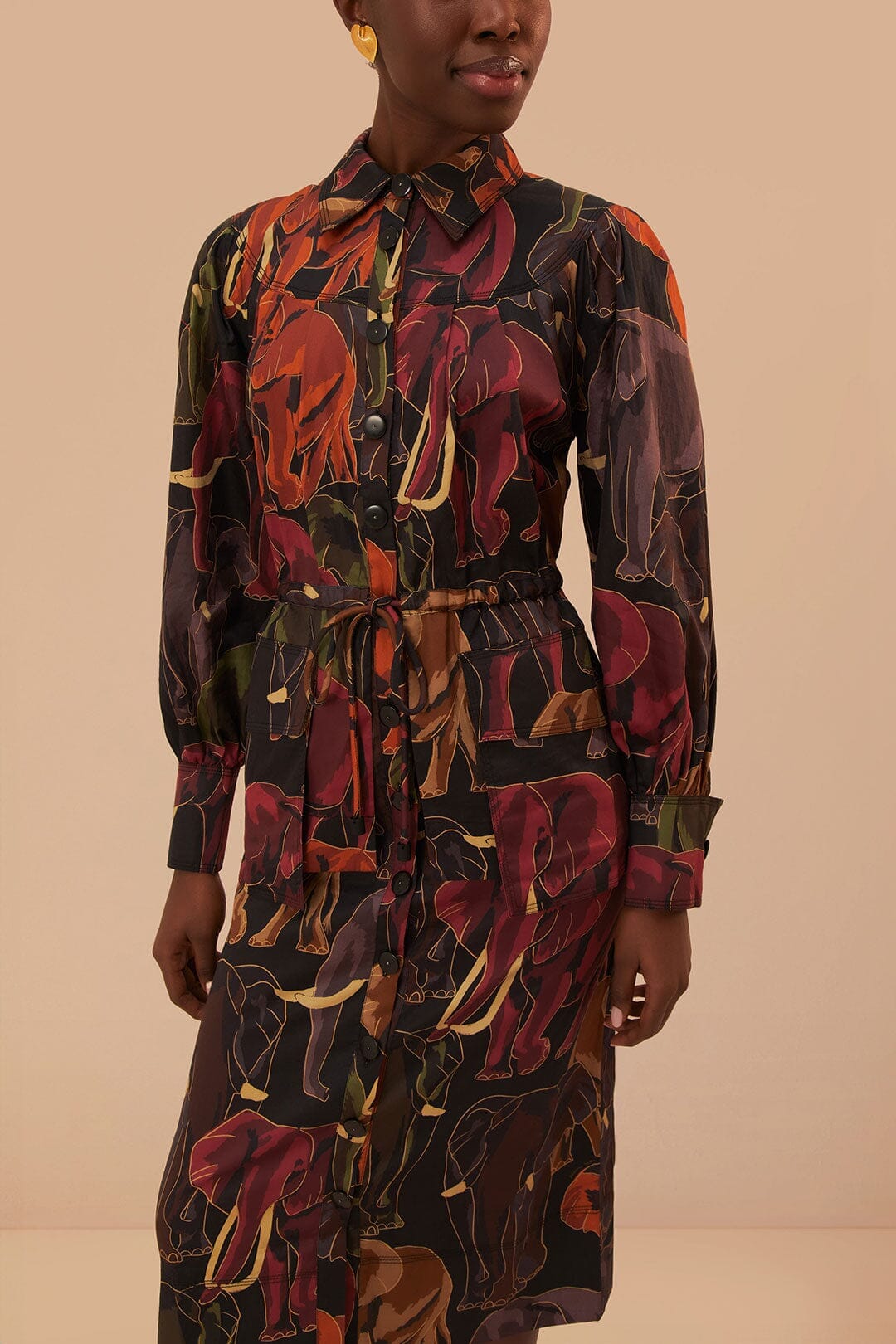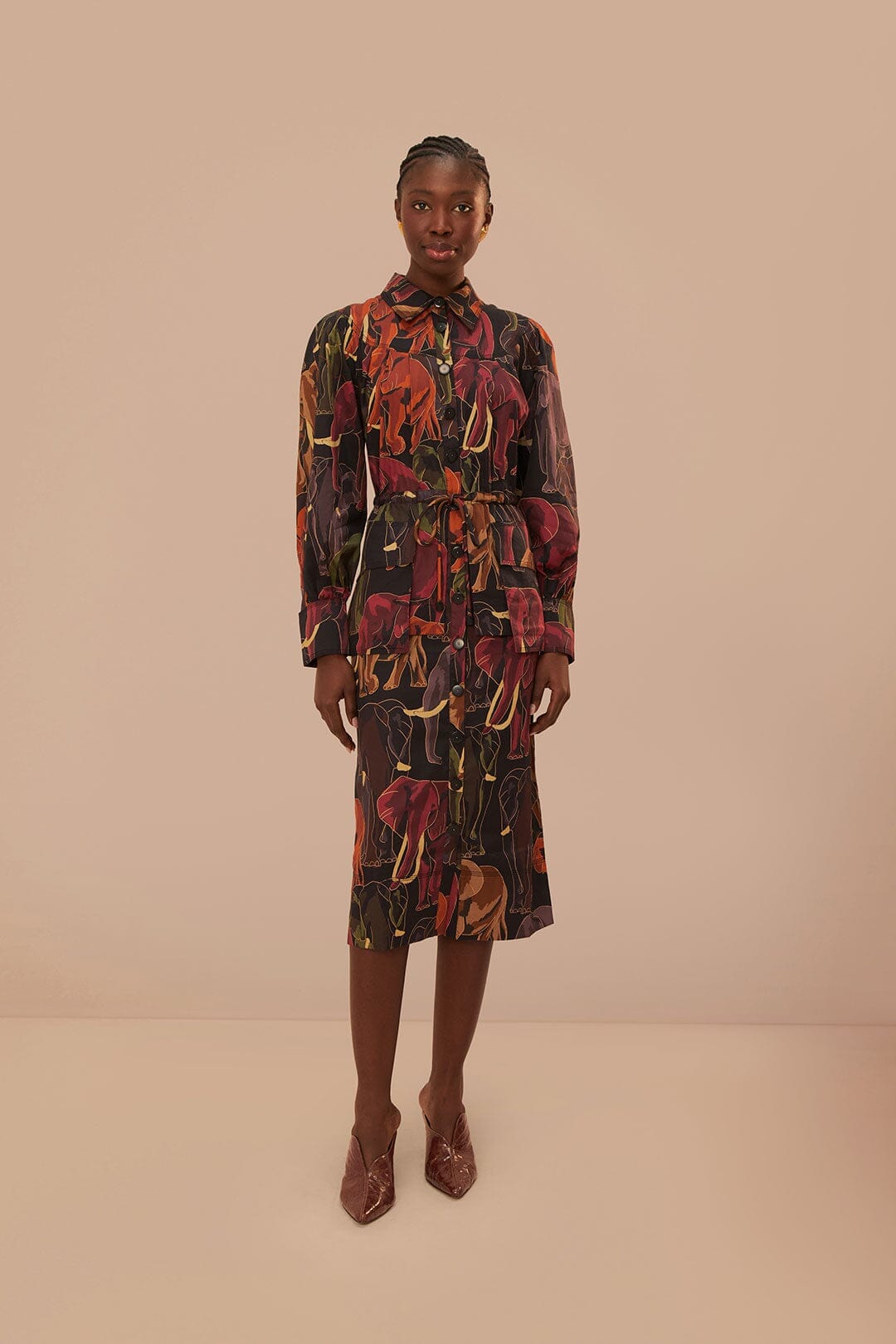 Adoptez une silhouette envoûtante avec la robe mi-longue à manches longues Elephants Brown, qui dégage un air d'élégance fantaisiste. Le collage captivant d'éléphants majestueux sur un fond marron riche offre un motif distinctif qui évoque l'esprit d'aventure. Son décolleté flatteur et sa taille cintrée avec une ceinture à nouer mettent en valeur la silhouette, tandis que les manches longues fluides ajoutent une touche de mouvement gracieux. Cette pièce promet d'être le cœur de votre garde-robe, parfaite pour créer des impressions durables.