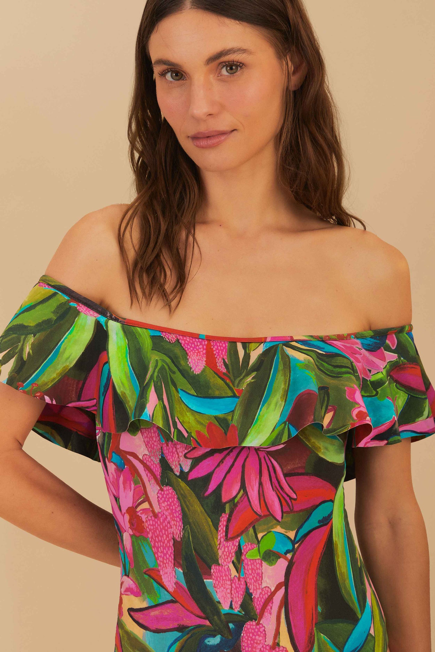 Adoptez le charme des tropiques avec le maillot une-pièce à volants Jardin De Reve. Cet ensemble enchanteur présente une explosion de plantes vibrantes dans des tons roses, verts et bleus vifs qui semblent danser sur votre peau. Le volant à épaules dénudées ajoute une touche de romantisme, mettant en valeur la silhouette ludique mais sophistiquée de la pièce, un choix exquis pour ces escapades ensoleillées ou ces journées tranquilles au bord de la piscine.