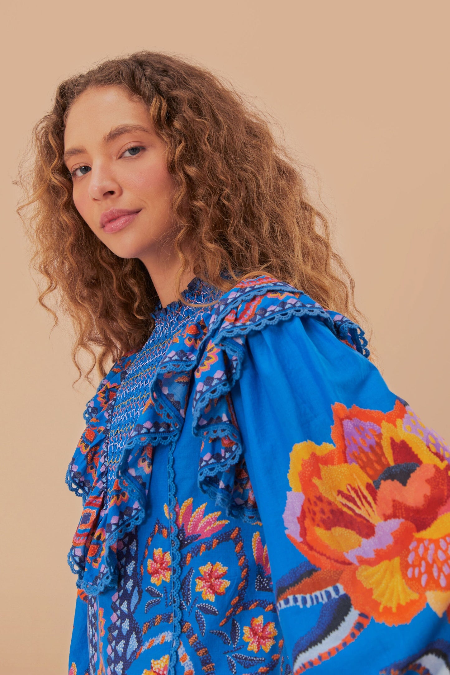 « Adoptez l'essence vibrante du chemisier à tapisserie florale Blue Lucy. Un chef-d'œuvre de motifs de tapisserie complexes dans un kaléidoscope de bleus, d'oranges et de roses crée une symphonie visuelle qui célèbre le style brésilien. L'encolure haute et les détails à volants ajoutent une touche de sophistication, tandis que les manches volumineuses apportent une touche ludique et fantaisiste à la silhouette. Chaque élément se combine pour créer un vêtement enchanteur qui murmure des histoires d'aventures tropicales et d'escapades joyeuses.