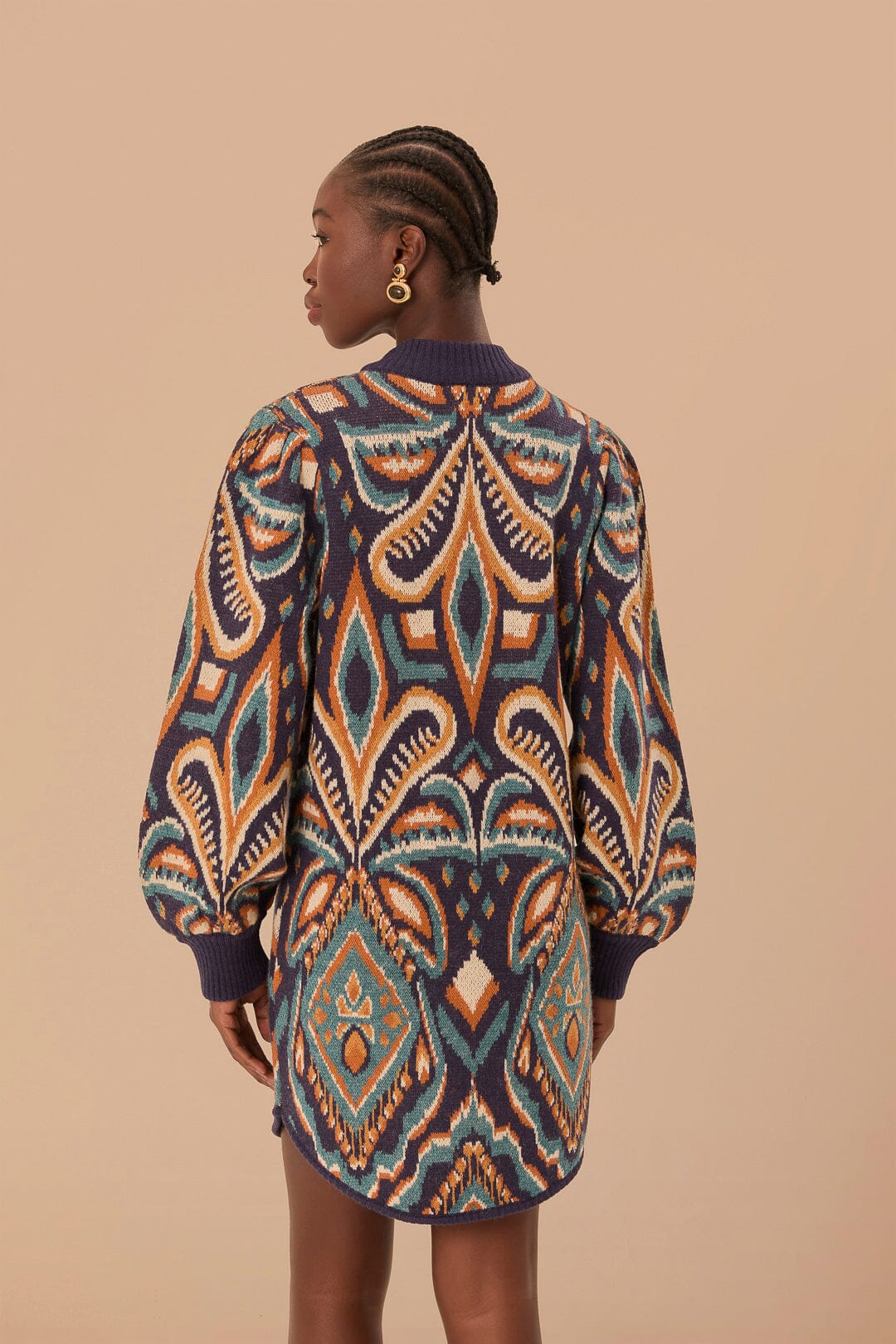 Plongez dans la chaleur vibrante de la robe pull Ikat Blue Pineapple. Son encolure haute enchanteresse et ses poignets côtelés douillets vous entraînent dans une danse complexe de tons azur et terre, où chaque point raconte une histoire. La broderie de motifs d'ananas tisse des murmures tropicaux dans votre garde-robe, tandis que le motif Ikat capture une essence mondiale. Cette pièce est un mélange parfait de confort et d'art folklorique, un trésor pour les soirées fraîches et les journées venteuses.
