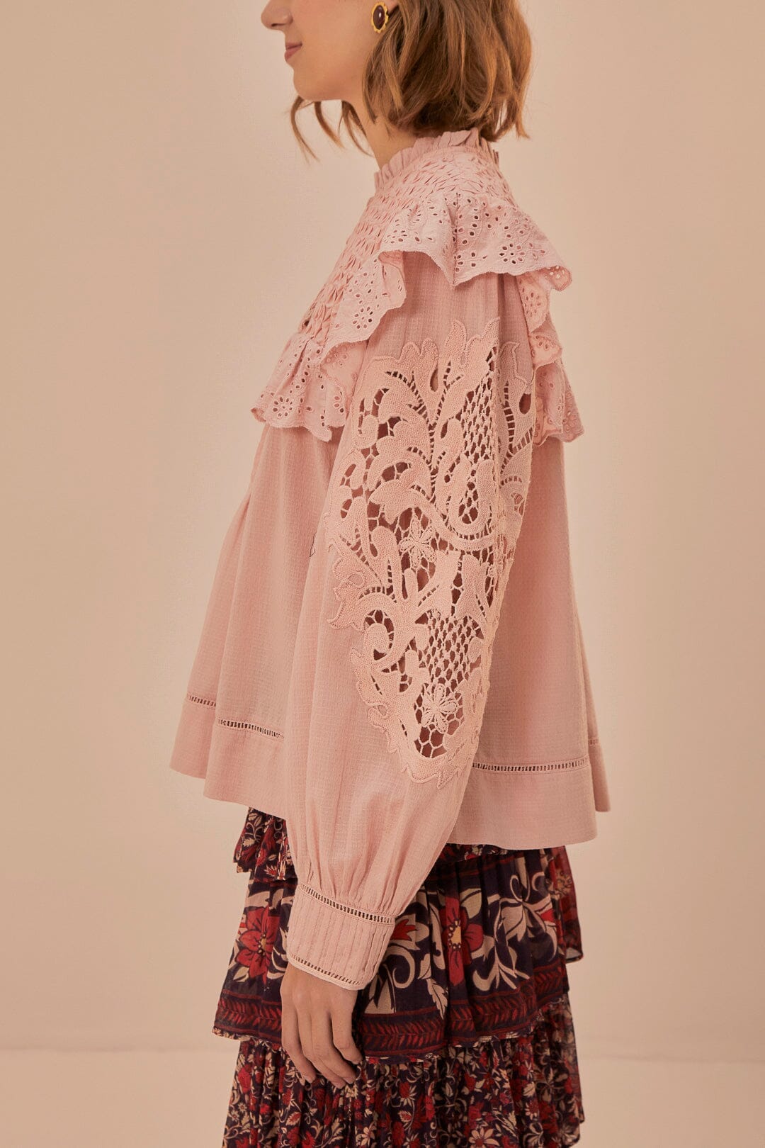 Enveloppez-vous du charme romantique du chemisier nid d'abeille Rose, doté d'un col haut et de manches en dentelle nid d'abeille astucieuses qui fleurissent avec des motifs complexes. La douce teinte rose évoque des promenades de rêve dans le jardin, tandis que les volants délicats ajoutent une touche de grâce féminine, créant une silhouette éthérée qui danse à chaque mouvement. Parfait pour rehausser n'importe quelle occasion avec son élégance poétique.
