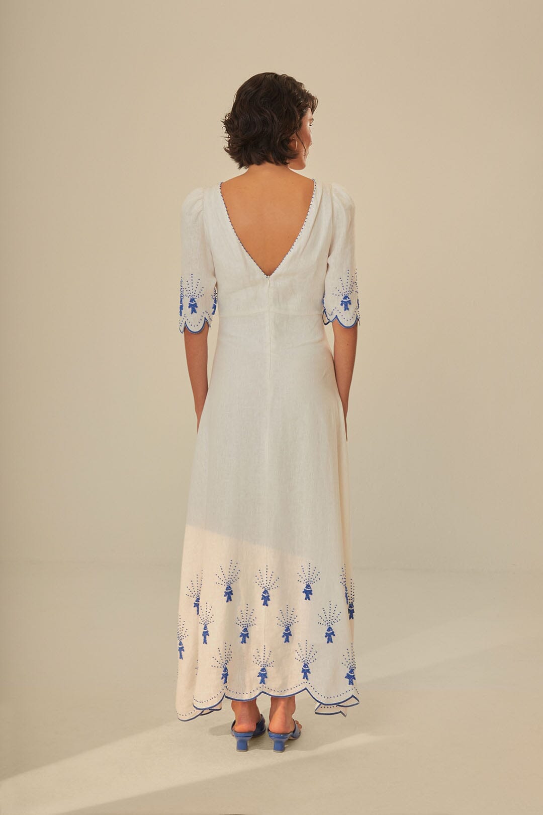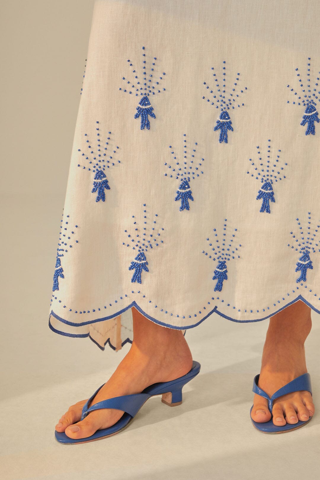 Plongez dans l’essence du charme côtier avec la robe midi brodée Off-White Sea Of Fish. Méticuleusement confectionnée avec une broderie délicate, cette pièce présente un motif enchanteur de mer de poissons dans des teintes bleues tranquilles, dansant le long de l'ourlet et des manches. Les découpes uniques et les bords festonnés font écho avec grâce à la fluidité de l'océan. Nichée dans des tissus doux provenant de sources responsables, sa silhouette aérienne offre une étreinte invitante, faisant de chaque instant une invitation à se détendre dans une élégance légère.