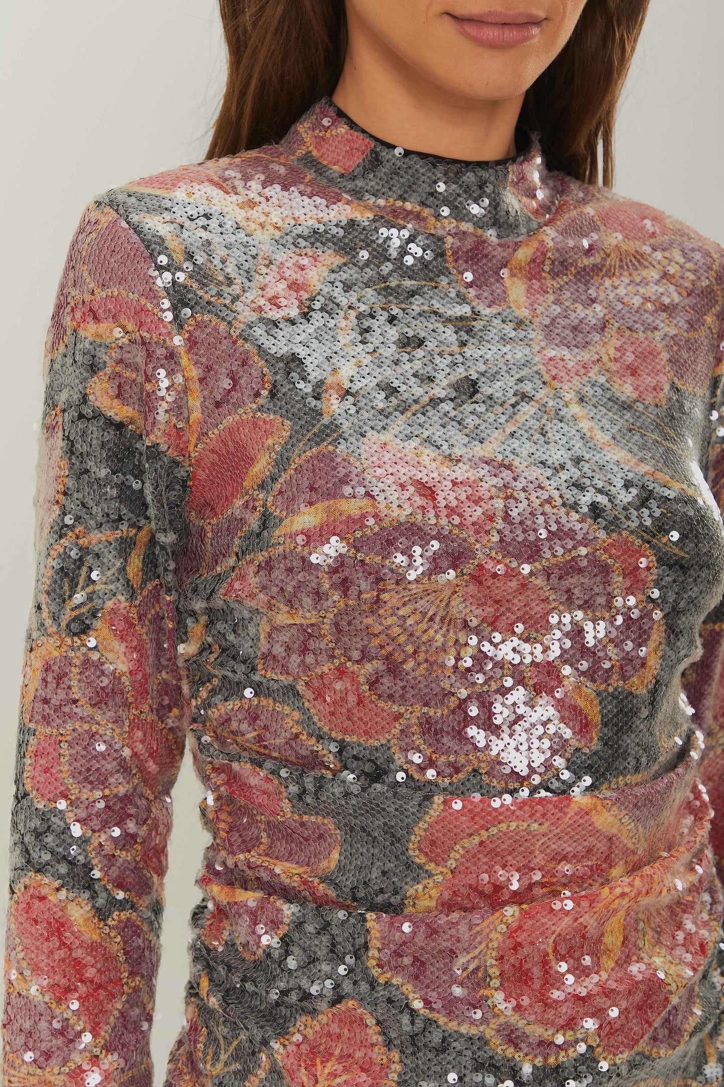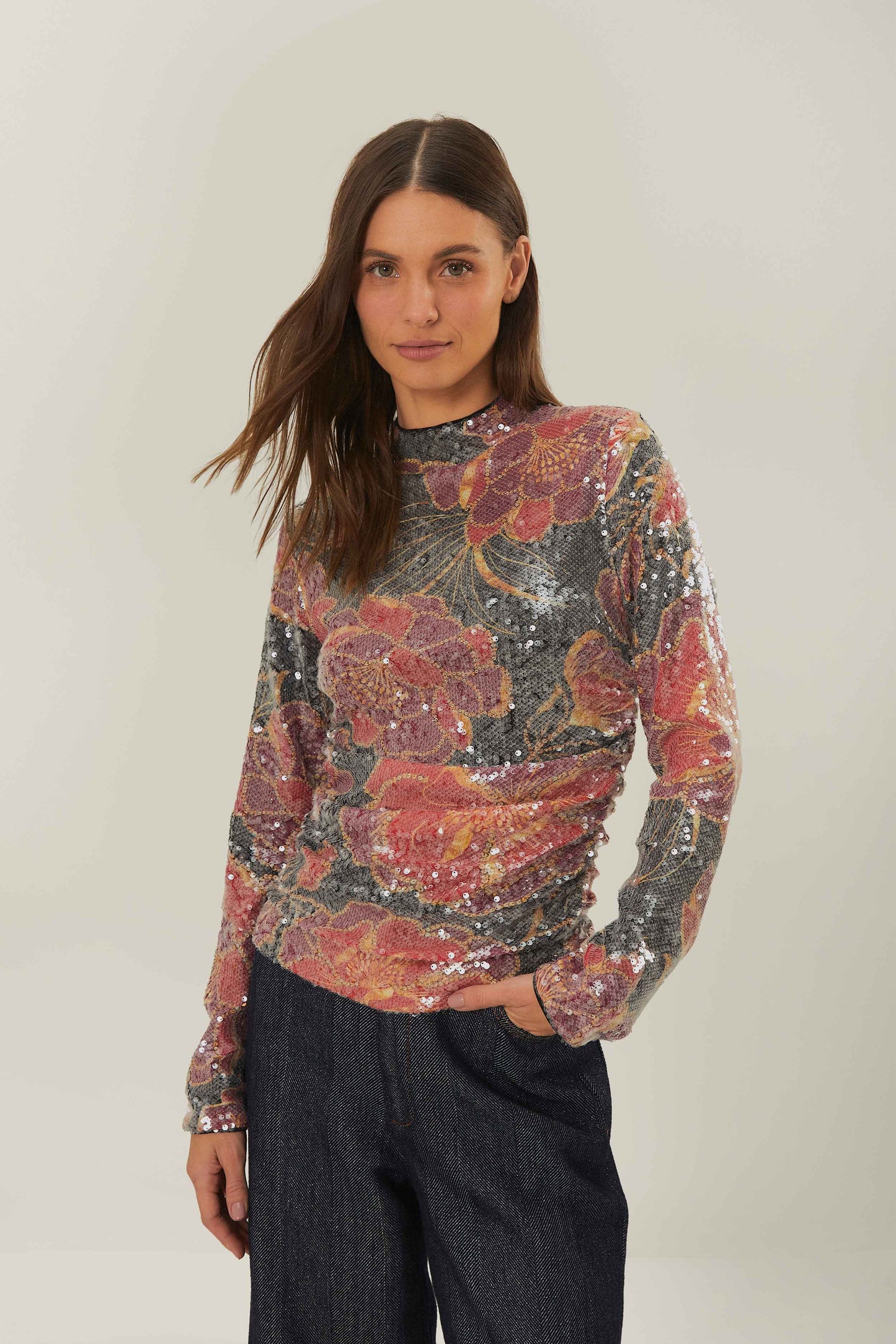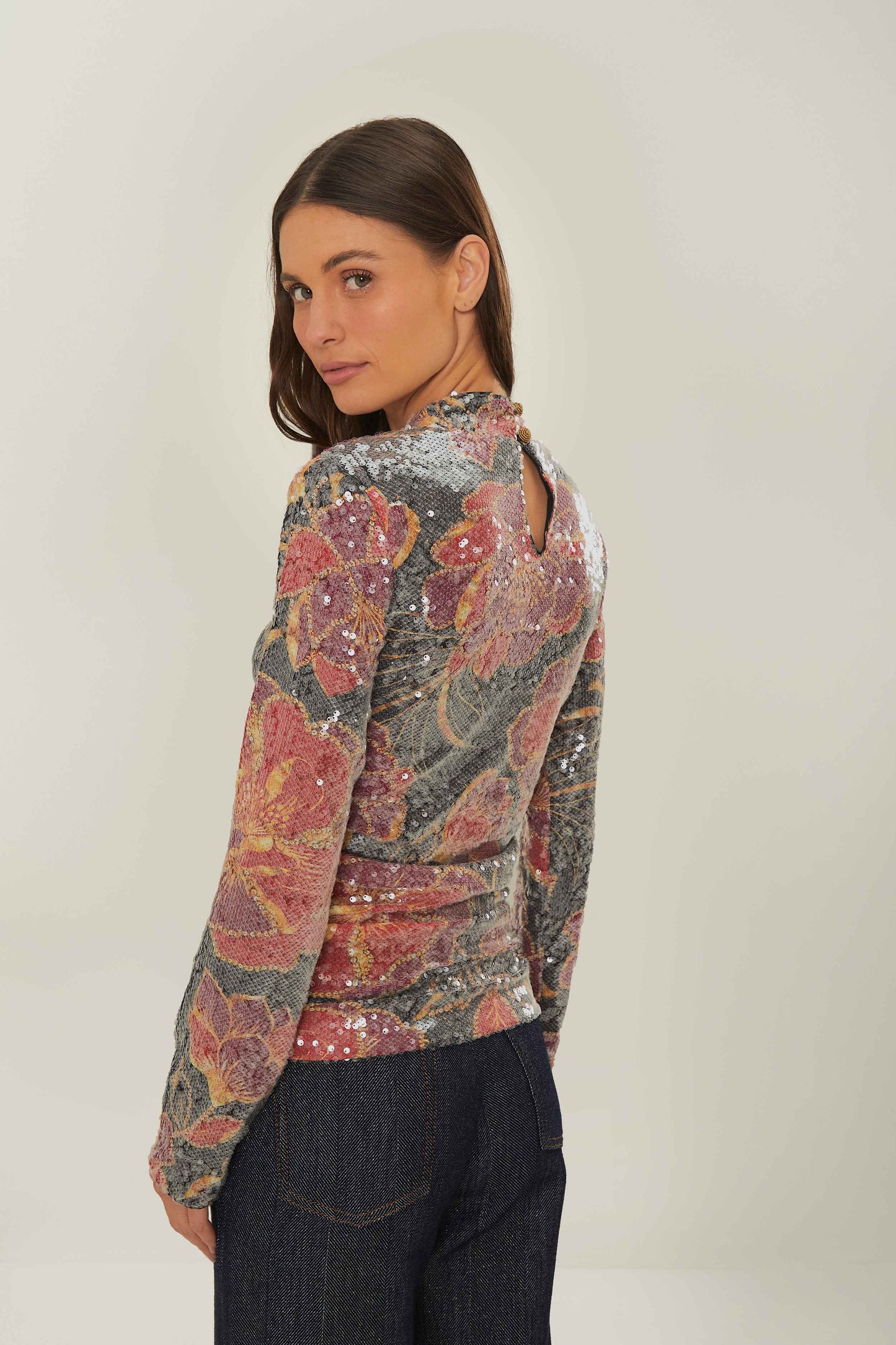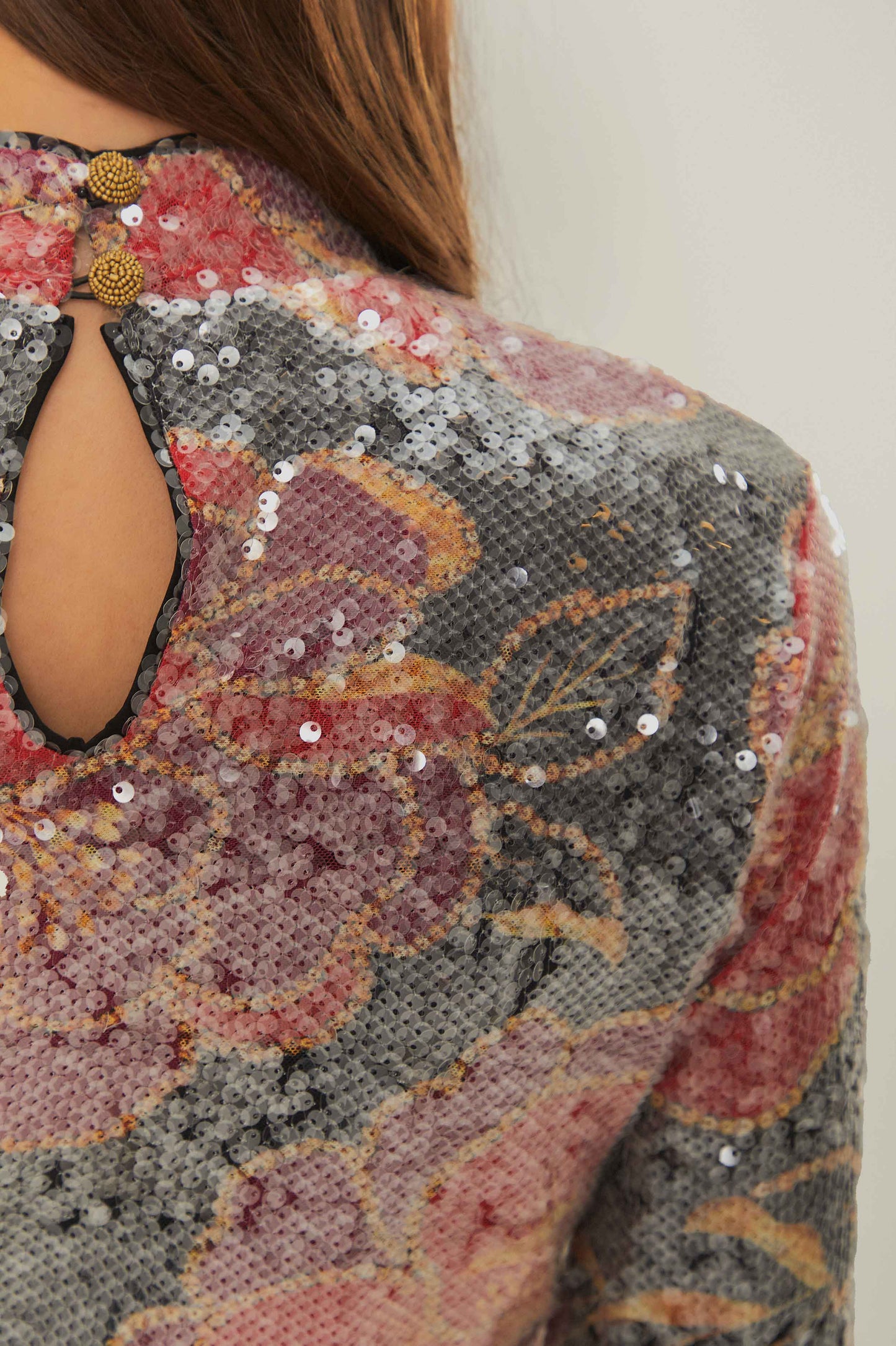 Adoptez l'éclat et l'élégance unique du chemisier en tulle noir à paillettes Shiny Chita, une pièce qui éblouit par son décolleté asymétrique et son motif floral audacieux. Les paillettes fabriquées à la main captent chaque scintillement de lumière, célébrant la joie du mouvement et de la fête. Ce chemisier présente des manches longues sophistiquées et un délicieux jeu de transparence avec son tissu en tulle délicat, vous invitant à exprimer votre esprit dynamique et votre style distinct avec une touche de charme brésilien.