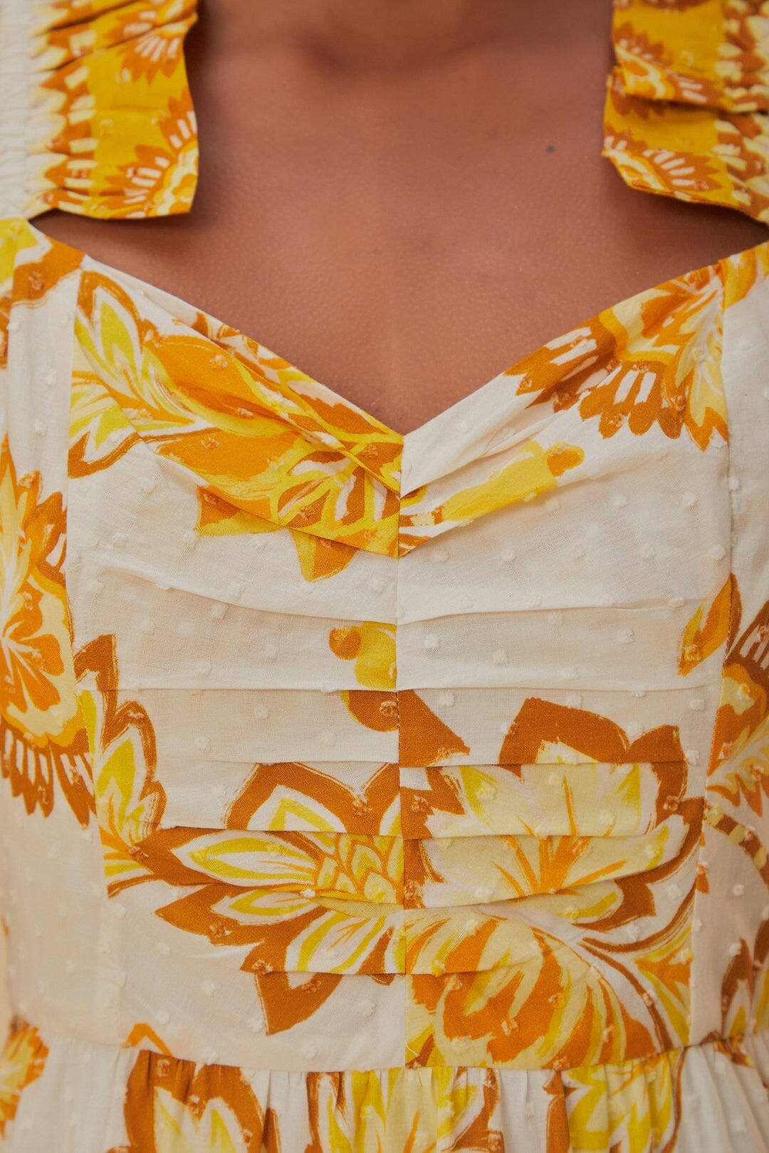 Sink into the tropical reverie of the Off-White Aura Floral Midi Dress by FARM Rio. This captivating piece draws the eye with its vivid yellow floral patterns blooming across an off-white canvas. The dress, adorned with playful ruffles, boasts a square neckline that complements the tiered skirt, crafting an effortlessly chic silhouette. A delicate confluence of charm and whimsy, it's a dress designed to celebrate the spirit of summer all year round.