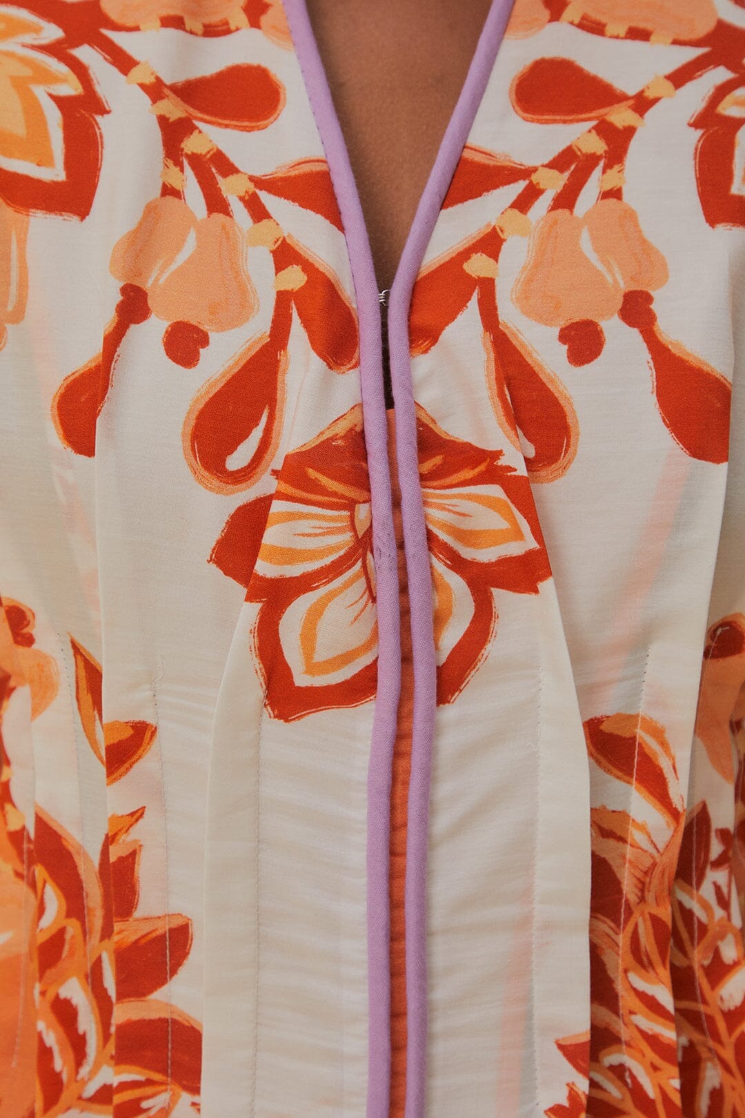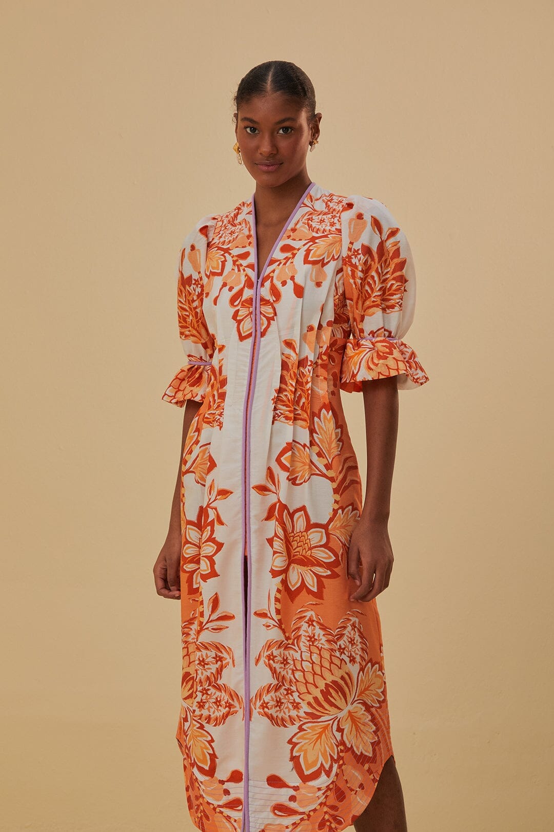 Embrace the vibrancy of summer with the Orange Aura V Neck Midi Dress, a delightful fusion of color and comfort. Its flowing silhouette is adorned with a spellbinding orange botanical pattern that dances across a crisp white canvas. The elegant V neckline leads to a graceful midi length, while the gently ruffled sleeves add a touch of whimsical charm. This piece is a celebration of warm hues and playful sophistication, perfect for any sun-kissed adventure.