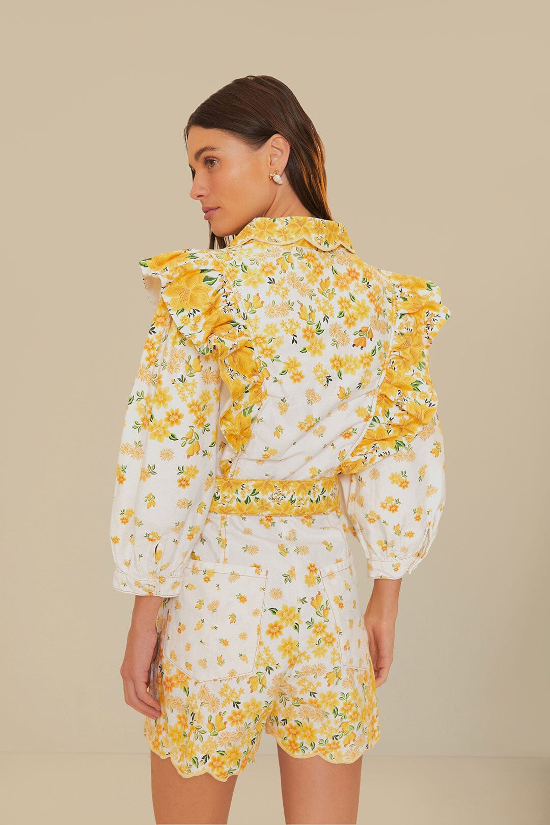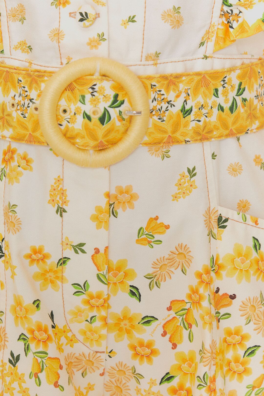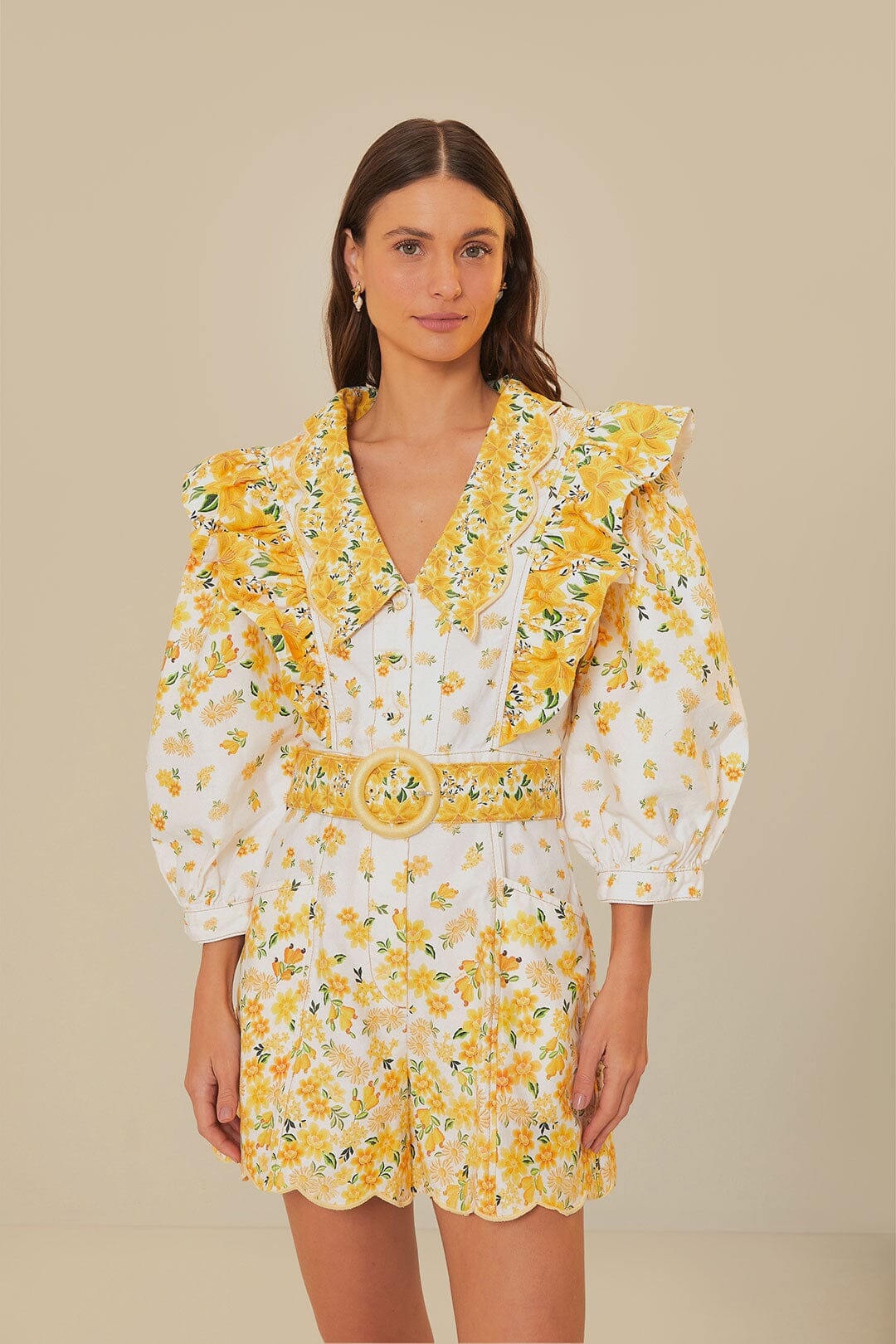 Embrace the vibrant allure of the Azaleia Shorts Romper, a charming collision of color and comfort. Adorn your silhouette in a cascade of sunshine yellows and soft whites, brought to life with a lush, floral pattern. Delicate ruffles dance along the collar neckline and sleeves, while a bold circle belt cinches at the waist, creating a figure-flattering shape. This romper, crafted with an eye for whimsical detail, captures the essence of playful sophistication.