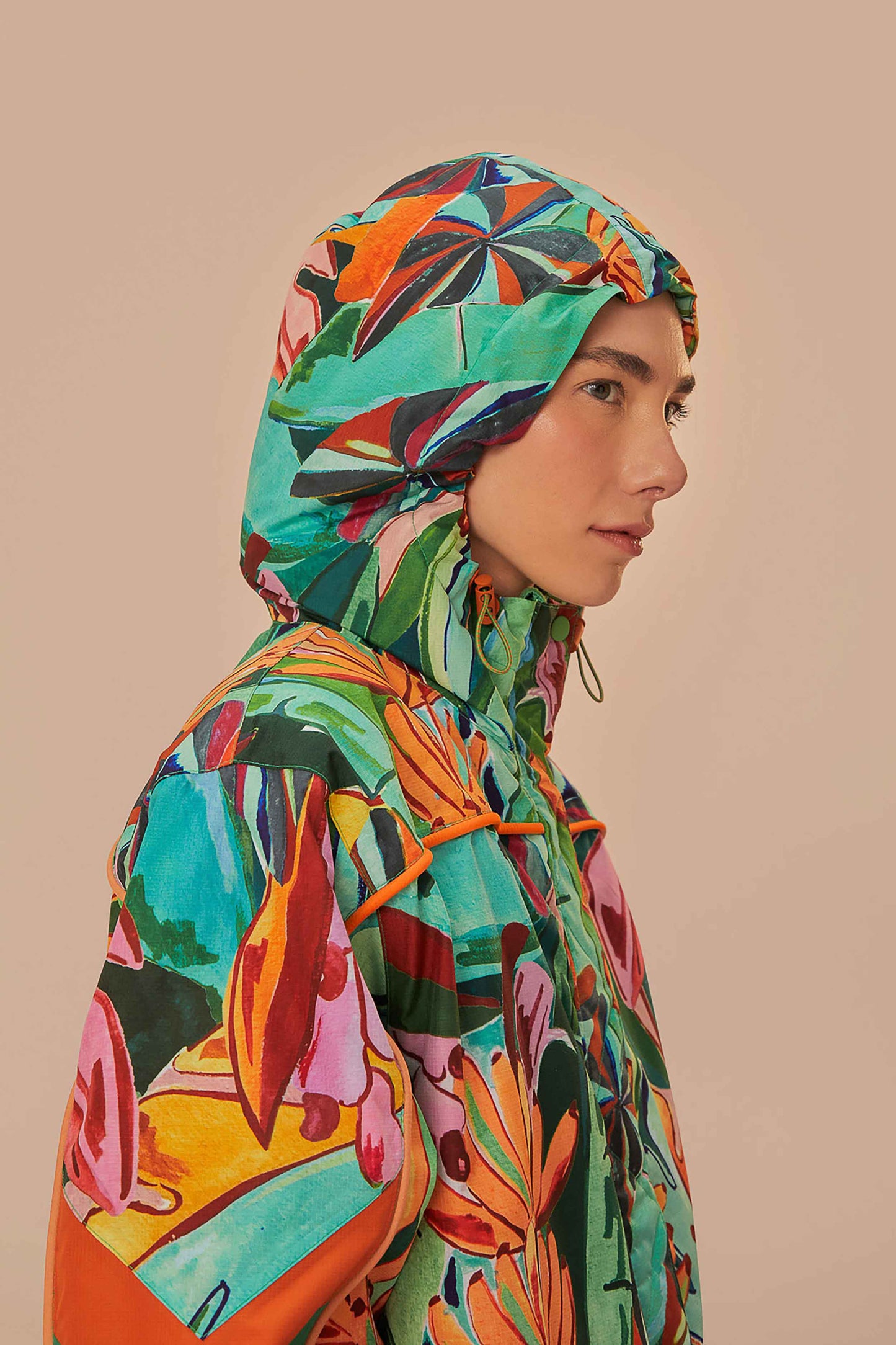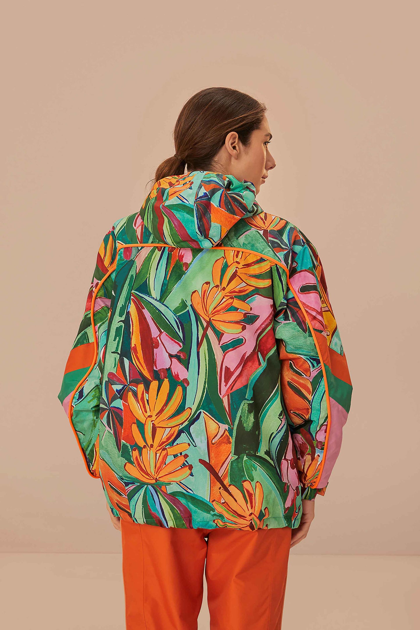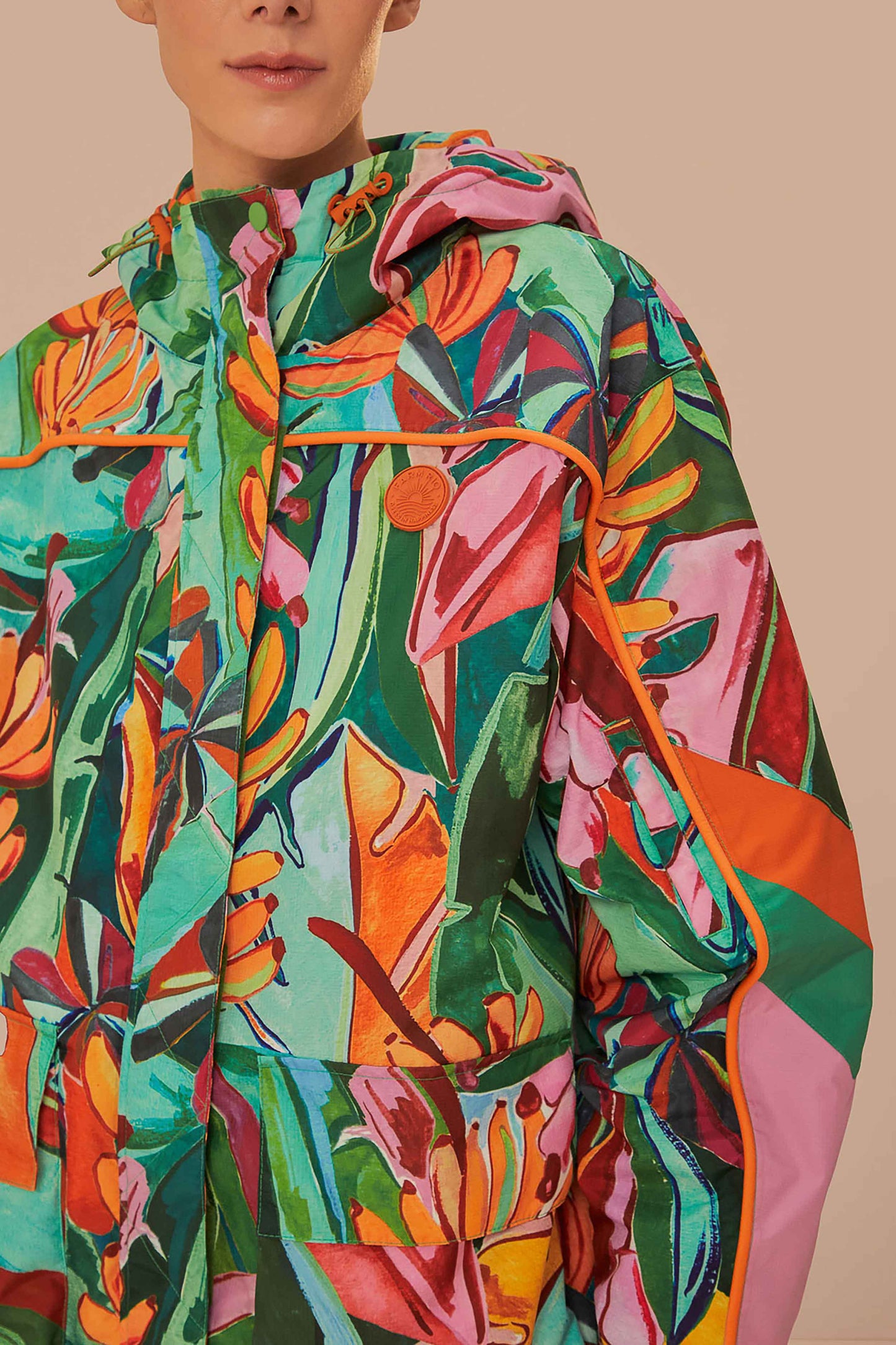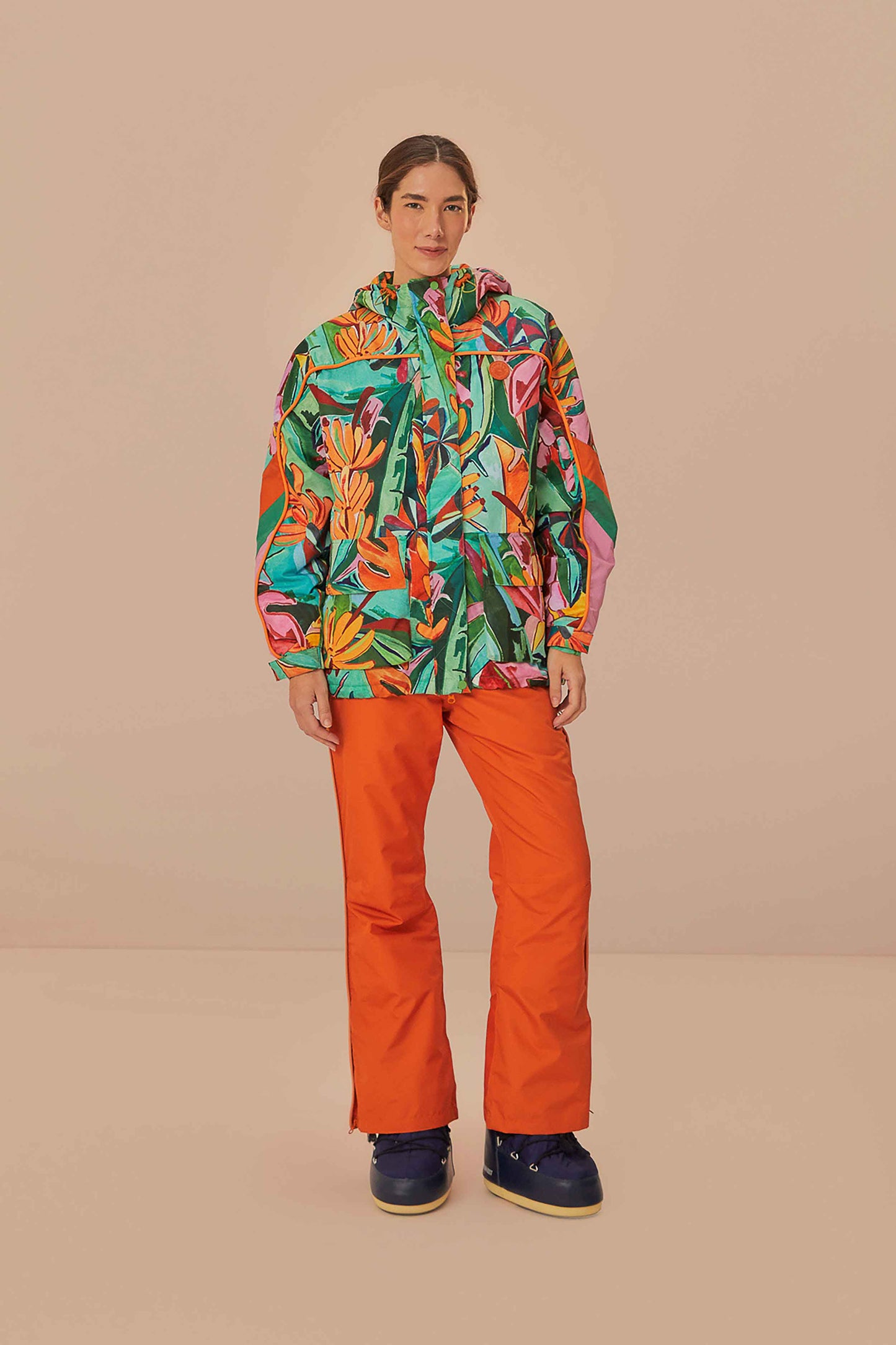Stay cozy and chic in the FARM Rio Multicolor Banana Leaves Ski Jacket. This high-neckline jacket is a playful addition to your winter wardrobe with its vibrant array of tropical banana leaves pattern. The unique silhouette with subtle ruffles and intricate embroidery adds a touch of whimsy, while the eyelet fabrics provide texture and depth. Perfect for keeping warm while making a fashionable statement on the slopes or the city streets.