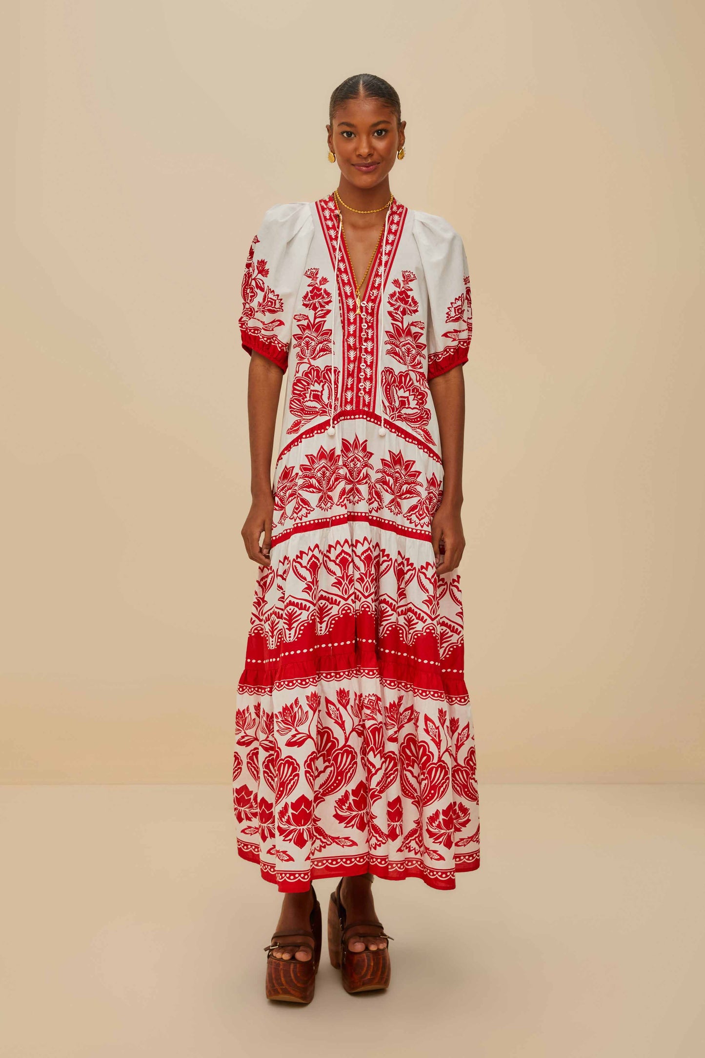 Embrace bohemian charm with the off-white boho garden short sleeve midi dress from FARM Rio. Adorned with vibrant red floral patterns, this dress features a graceful V neckline and playful puffed sleeves, creating a harmonious blend of elegance and whimsy. The flowing silhouette and intricate embroidery evoke a sense of wanderlust, making it a perfect choice for sunlit strolls and dreamy gatherings.