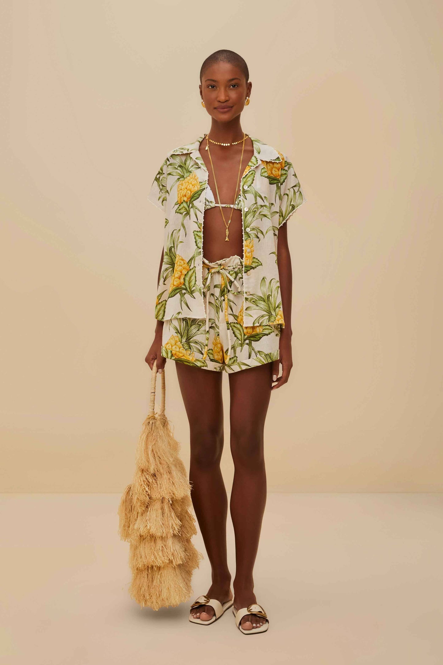 Embrace a playful spirit with the Off-White Delicate Pineapple Shirt from FARM Rio. This piece features a vibrant pineapple pattern set against a soft, off-white background, exuding tropical charm. Its relaxed silhouette is perfectly complemented by a high neckline, enhancing its casual elegance. The shirt's airy design invites a breezy feel, making it an ideal choice for sunny adventures and leisurely strolls.