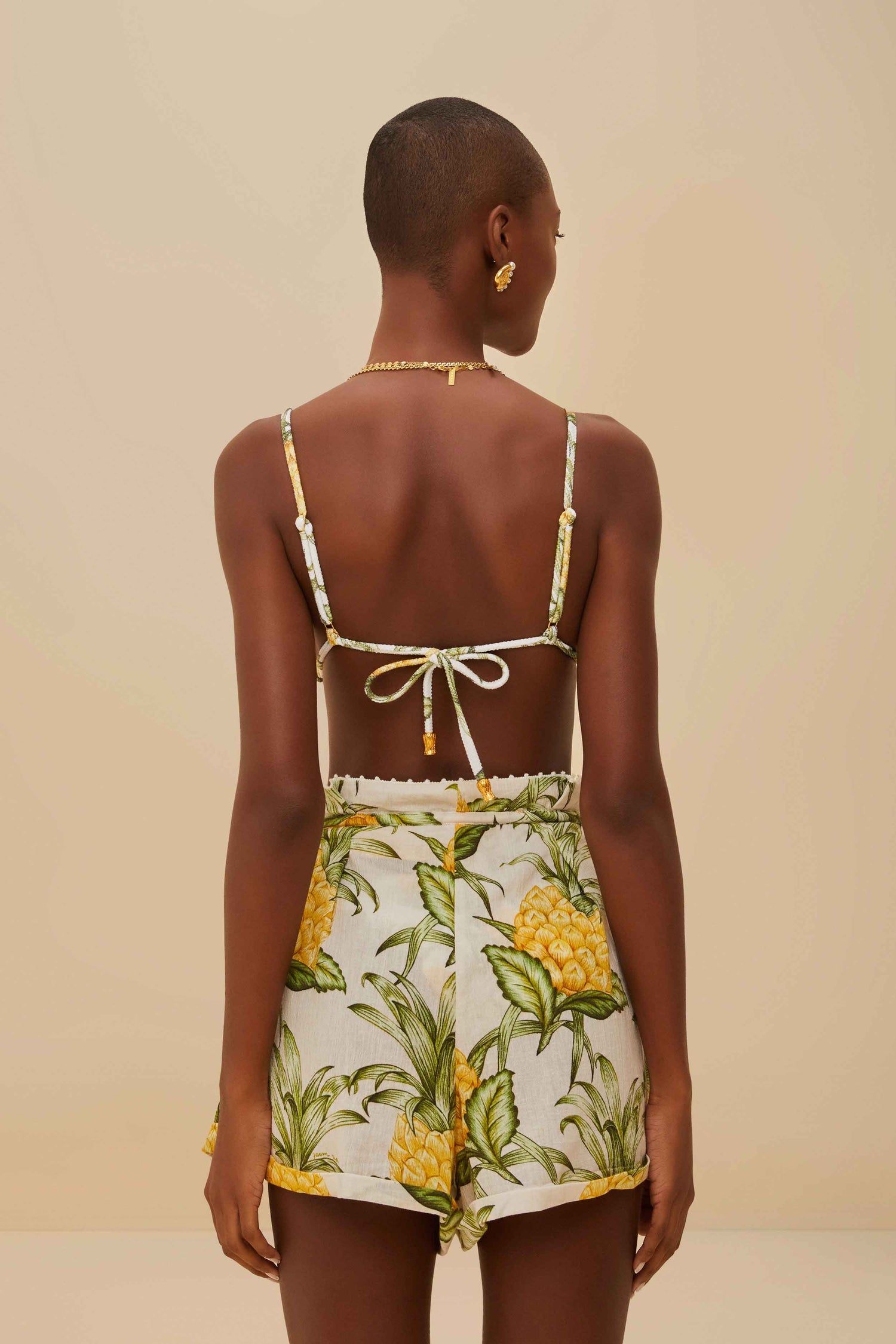 Experience the playful elegance of the Off-White Delicate Pineapple Short. This charming piece showcases a vibrant pineapple pattern that dances across a soft off-white backdrop. The shorts feature a delightful ruffle detail at the waist, bringing a touch of whimsy to your wardrobe. With a relaxed fit and tropical flair, these shorts embody the carefree spirit of FARM Rio, inviting warmth and joy into every step.