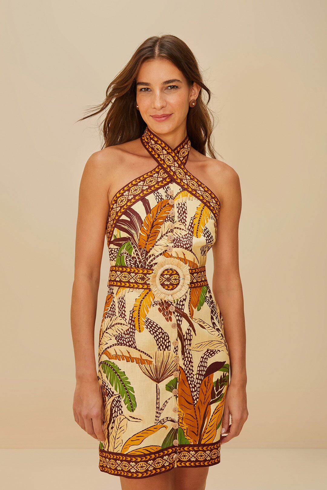 Embrace summer's warmth with the Sand Foliage Sketch Euroflax™ Premium Linen Mini Dress. This enchanting piece features an elegant halter neckline that beautifully frames your shoulders. The vibrant foliage pattern, awash in rich earthy tones, dances across high-quality linen, crafted from responsible materials. A detailed belt with a textured clasp cinches the waist, creating a playful silhouette that's both fresh and timeless. Ideal for sunlit strolls and spirited gatherings.