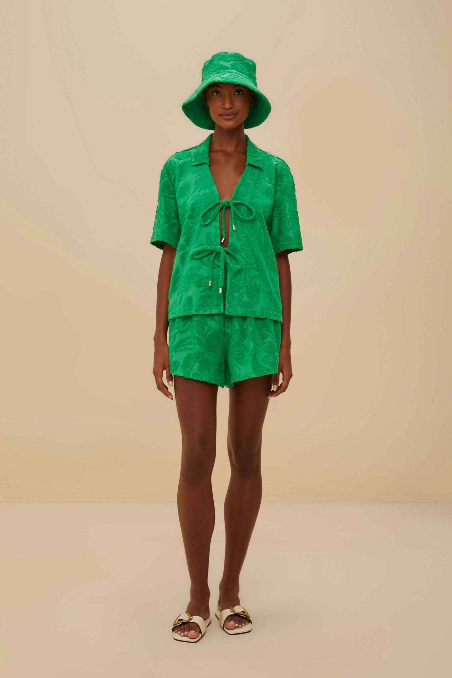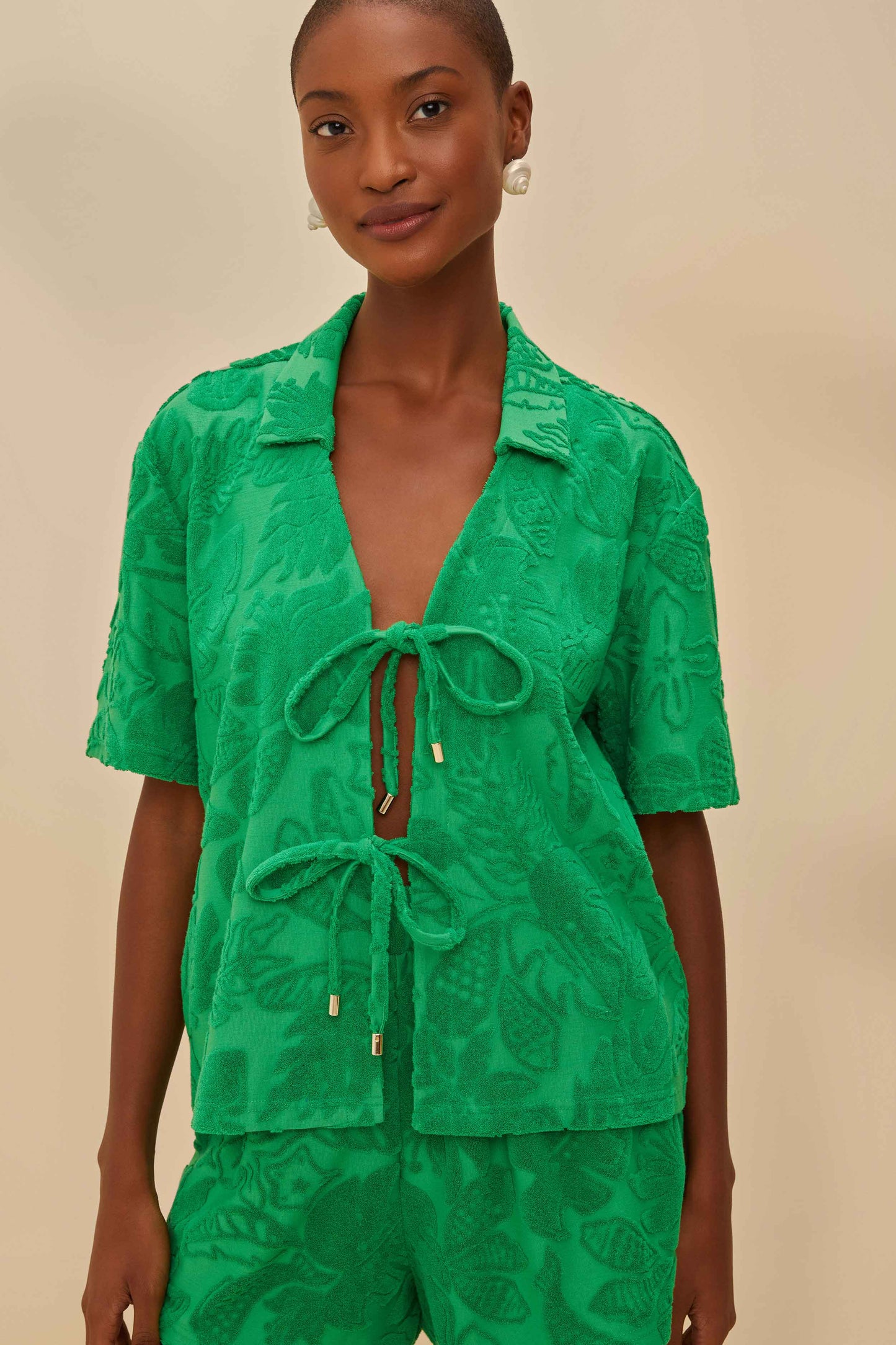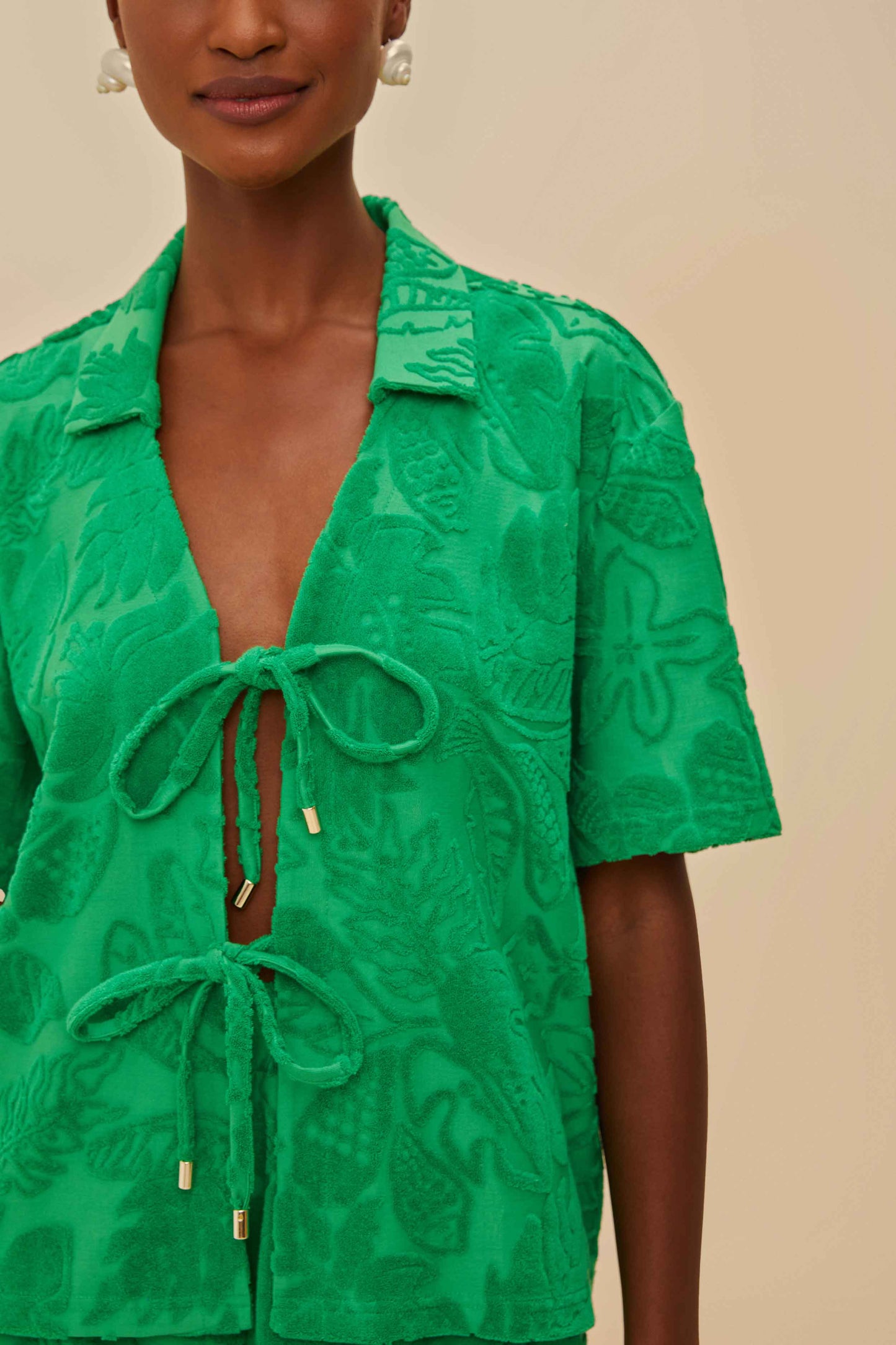 Dive into the lush vibrancy of the Green River Nature Towel Shirt by FARM Rio. This piece enchants with its enchanting tropical patterns, weaving emerald foliage over a rich green fabric. The relaxed collar neckline is complemented by playful tie details, adding a touch of whimsy. Its breezy silhouette invites warmth and adventure, making it a joyful choice for any sunlit escapade.