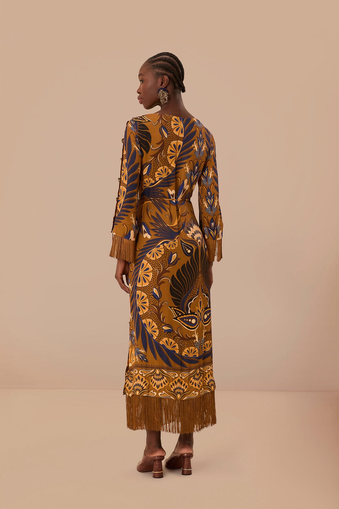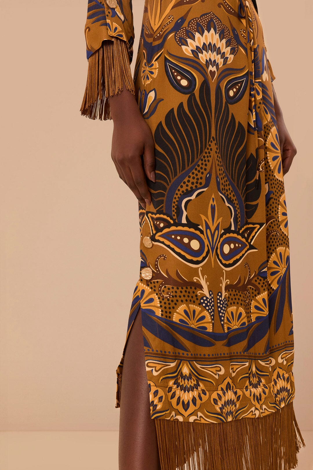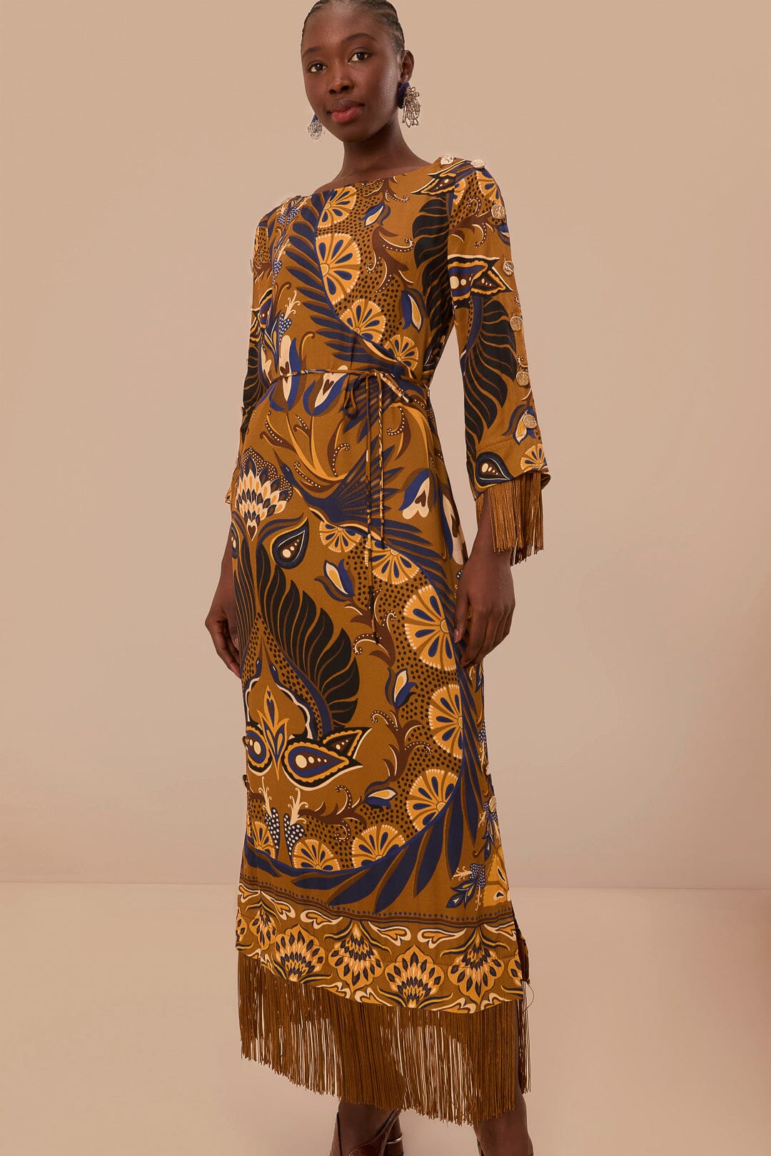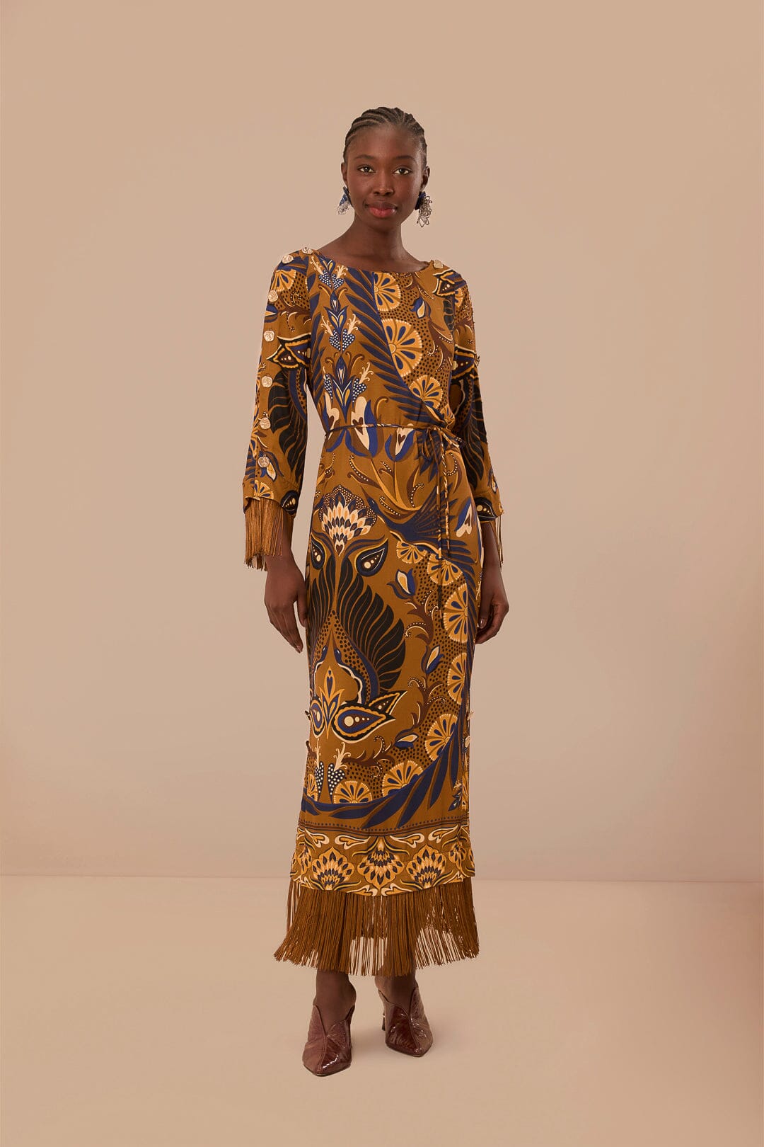 Embrace the essence of the tropics with the Gold Heart Forest LENZING™ ECOVERO™ Viscose Maxi Dress. This captivating piece features a harmonious blend of rich ochre and deep navy hues, adorned with an enchanting heart-infused forest print. Crafted from fluid LENZING™ ECOVERO™ viscose, the dress creates a graceful silhouette with its round neckline, gently puffed sleeves, and playful fringed hemline. A timeless creation that marries elegance with eco-conscious fabric choices for a truly heartwarming addition to your wardrobe.