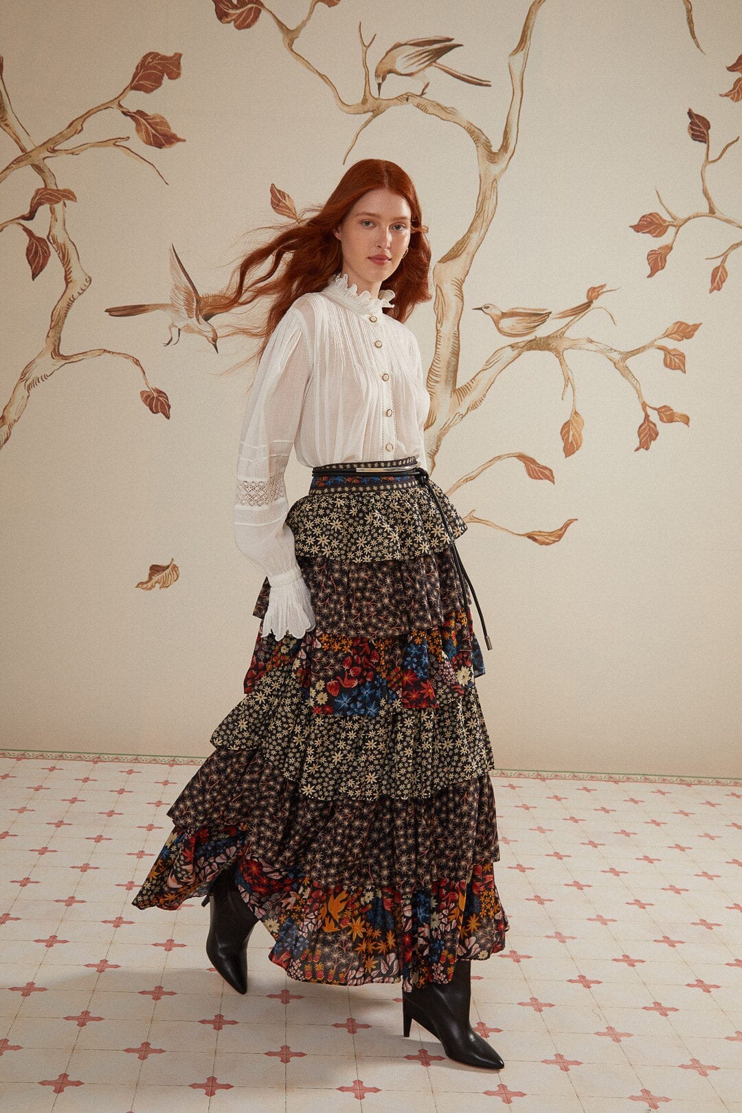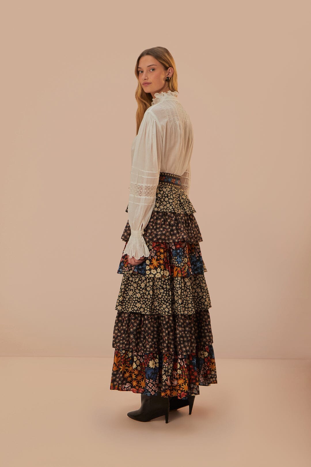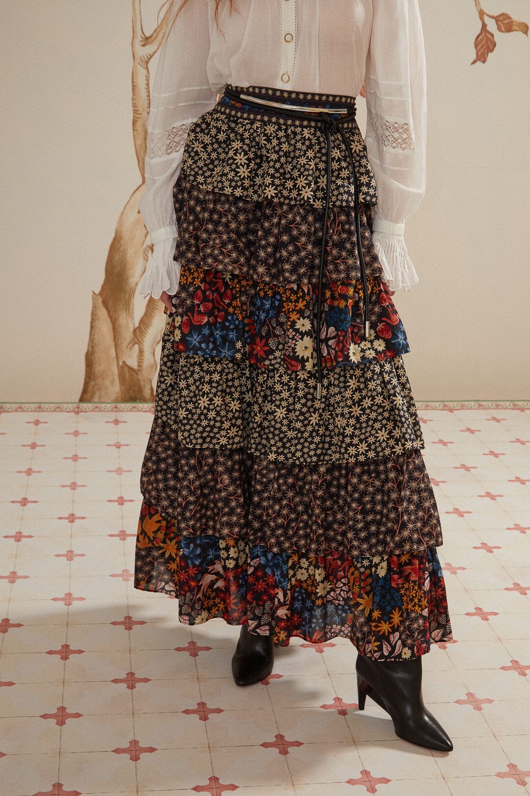 Wrap yourself in the enchanting charm of the Black Jujus Garden Midi Skirt, where vibrant bursts of florals bloom against an alluring black backdrop. Tiered ruffles dance gracefully at each step, crafting a silhouette that speaks to the free spirit. The fluid movement and captivating pattern make this piece a poetic addition to your wardrobe, invoking the lush elegance of a midnight garden stroll. Embrace this unique blend of whimsy and sophistication for your next cherished outing.