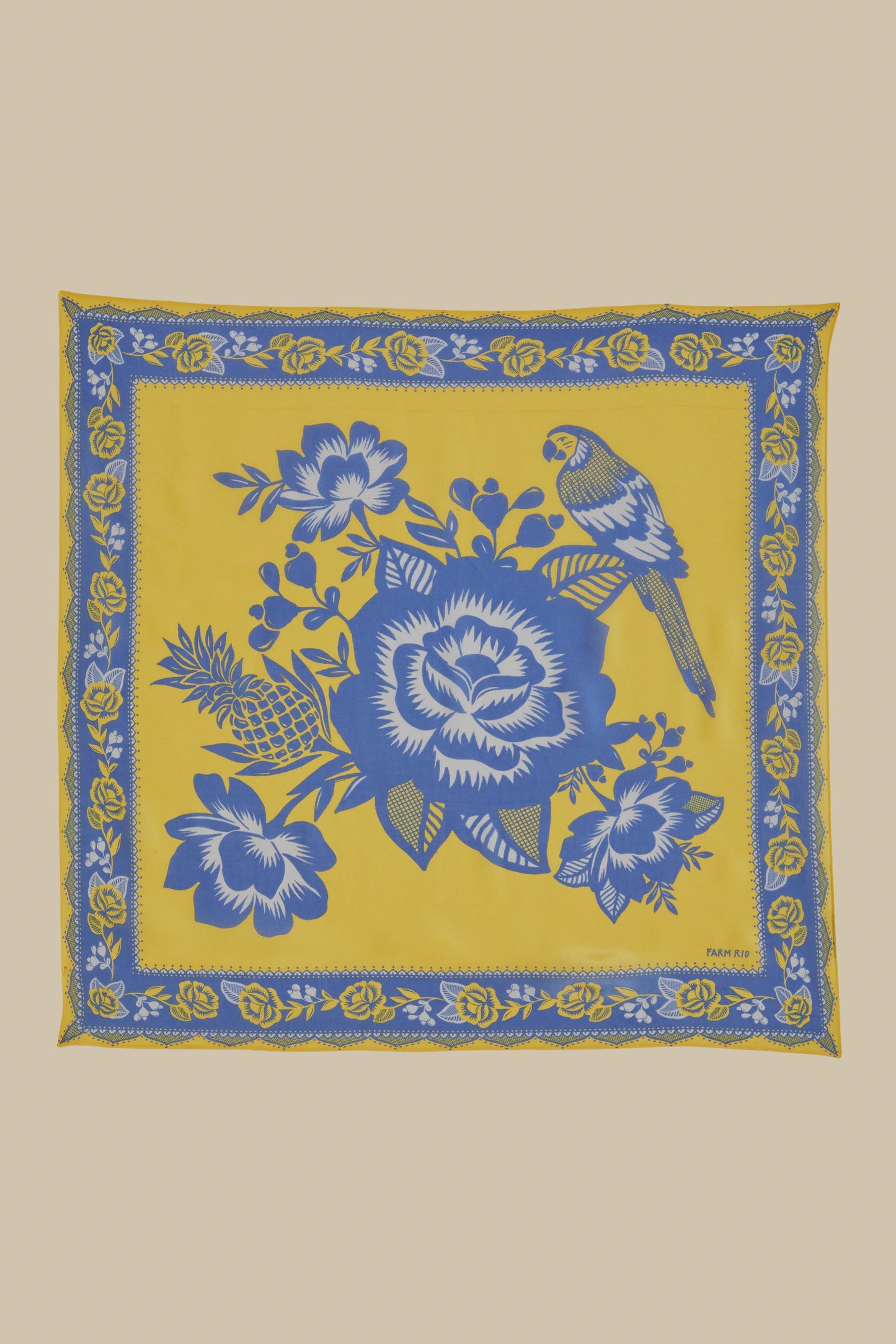 Embrace the vibrant essence of Brazilian style with the Lace Garden Yellow Scarf from FARM Rio. A canvas of cheerful yellow is adorned with striking blue floral motifs and playful birds, creating a tapestry of nature’s whimsy. The intricate lace-like border adds an extra touch of elegance to this soft, flowing piece. Wrap yourself in a burst of color and a hint of tropical charm, perfect for brightening any ensemble.