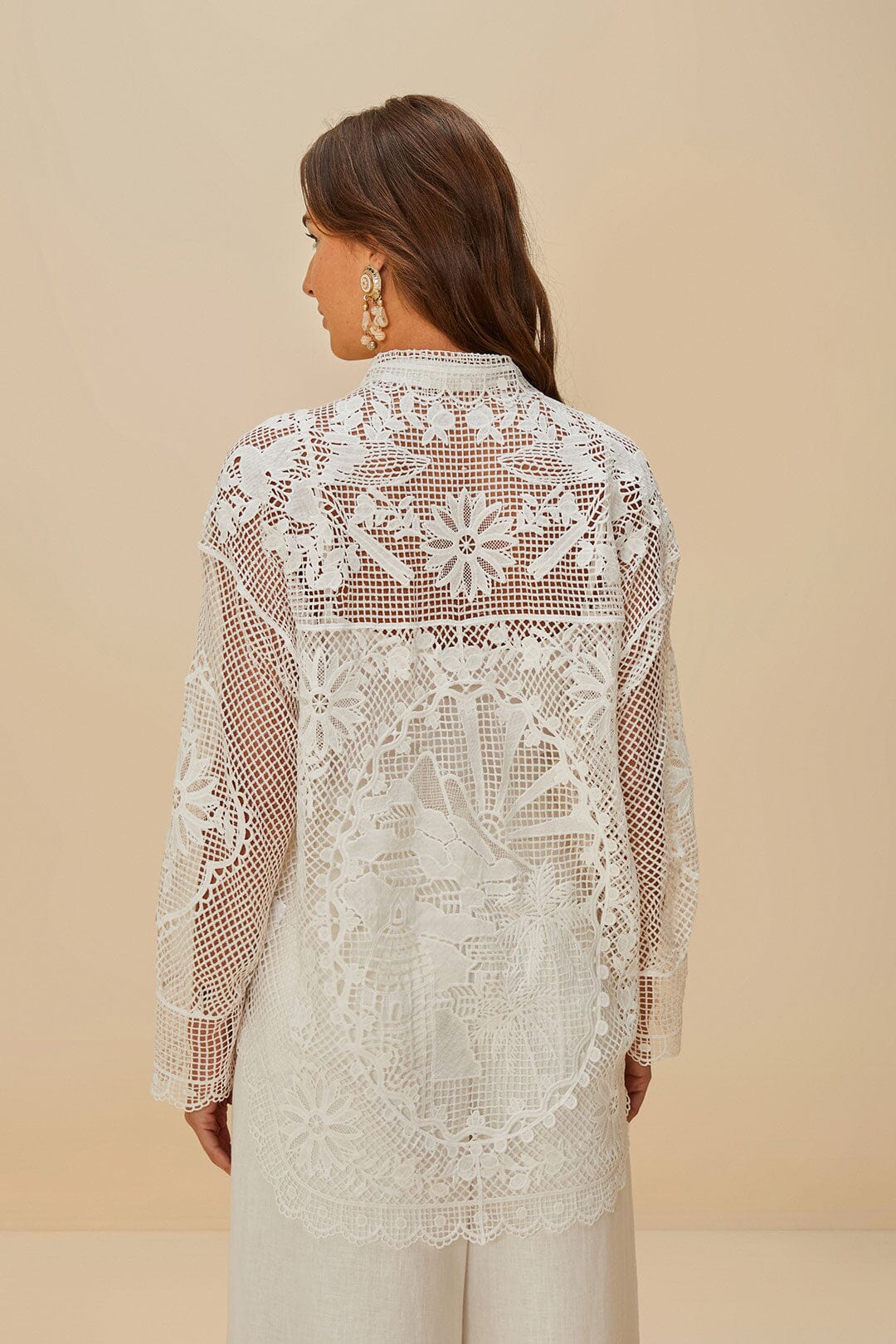 Elevate your wardrobe with the off-white landscape guipure shirt by FARM Rio. This elegant piece features intricate guipure lace patterns that depict a serene landscape, offering a touch of nature's artistry. The delicately crafted collar neckline adds sophistication, while the lightweight lace promises airy comfort. Perfectly blending warmth and playfulness, this shirt invites softness and style to any outing, making it a versatile addition to your ensemble.