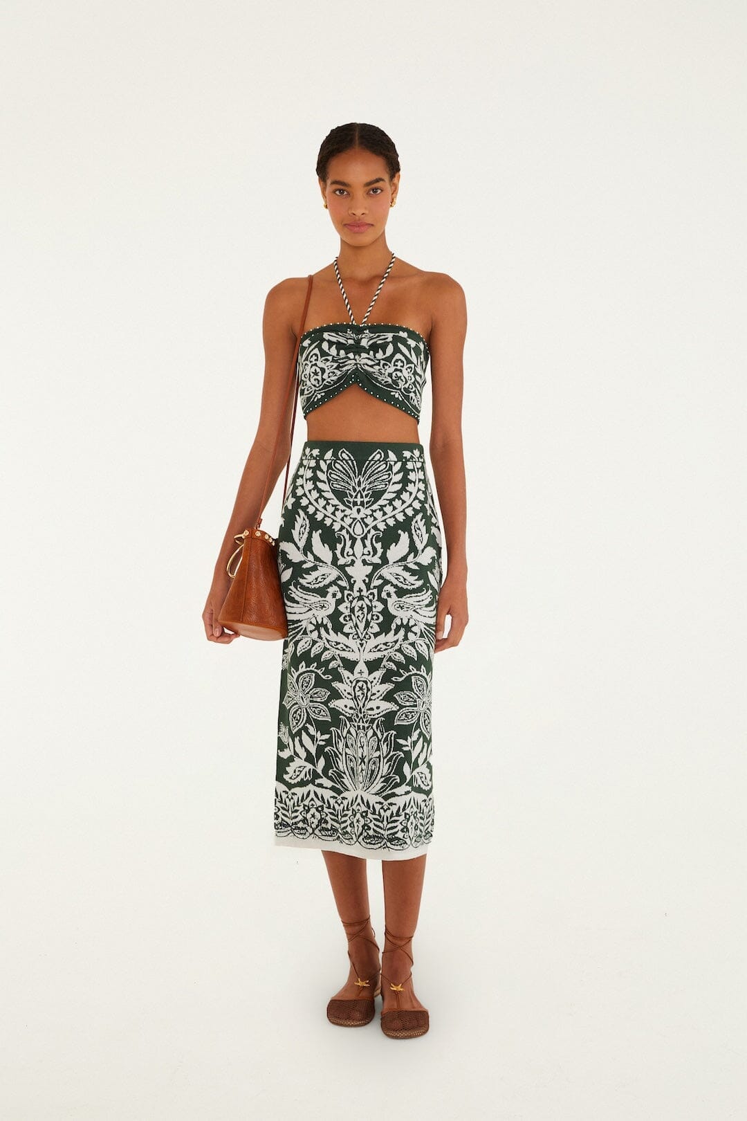 Wrap yourself in the vibrant spirit of FARM Rio with the Dark Green Miranda Beaded Knit Top. This playful knitwear piece features a rich emerald hue that dances with intricate beadwork, adding texture and subtle shimmer. The halter neckline beautifully frames the shoulders, while the soft, breathable fabric caresses the skin for effortless comfort. Its relaxed yet flattering silhouette invites easy movement, making it a joyful expression of Brazilian warmth and free-spirited style.