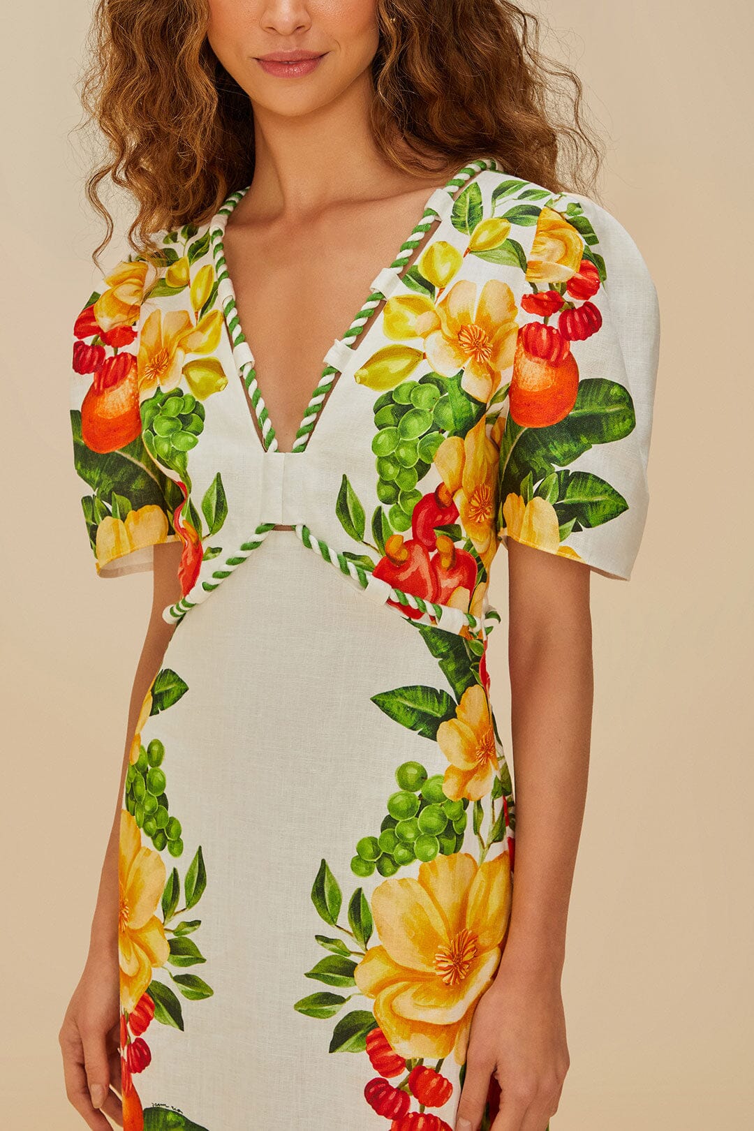The Off-White Picnic Flowers Euroflax™ Premium Linen Maxi Dress embraces you with vibrant floral patterns that dance across its soft off-white canvas. Crafted from responsible materials, its V neckline meets playful puffed sleeves, exuding a delightful charm. The fitted silhouette flows into a relaxed maxi length, perfect for sunlit strolls. This dress is a celebration of color and carefree elegance, making every moment feel like a blooming escape.