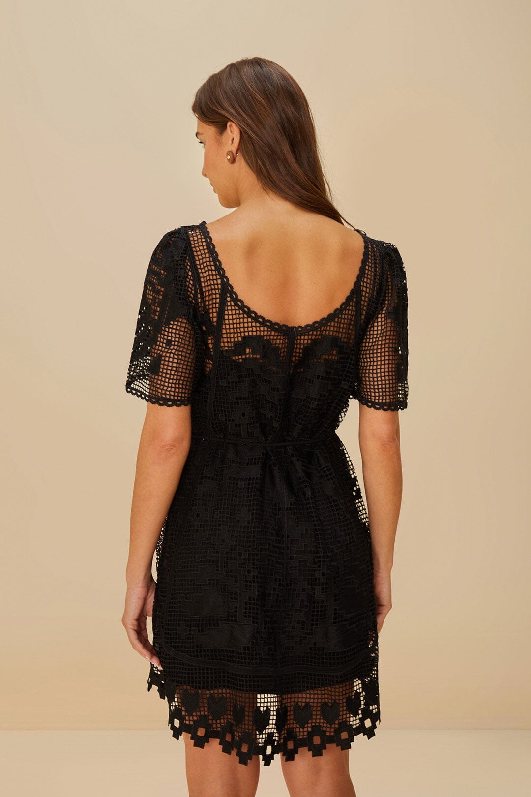 Slip into the Black Pineapple Guipure Mini Dress, a delightful fusion of elegance and playfulness. Its intricate guipure lace boasts a charming pineapple pattern, offering a whimsical touch to your wardrobe. The round neckline frames your neckline gracefully while the relaxed silhouette flares gently. Playful sleeves add a breezy feel, and the scalloped hem exudes a touch of romance. Embrace a blissful style that's both unique and inviting.