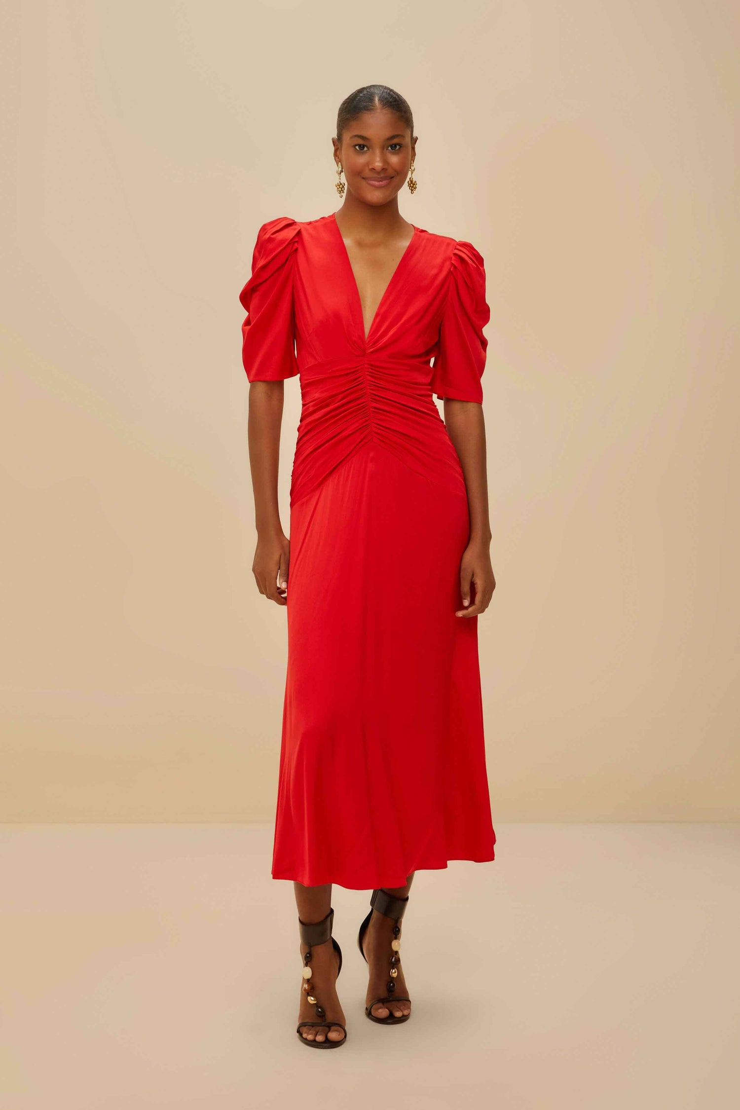 red gathered midi dress