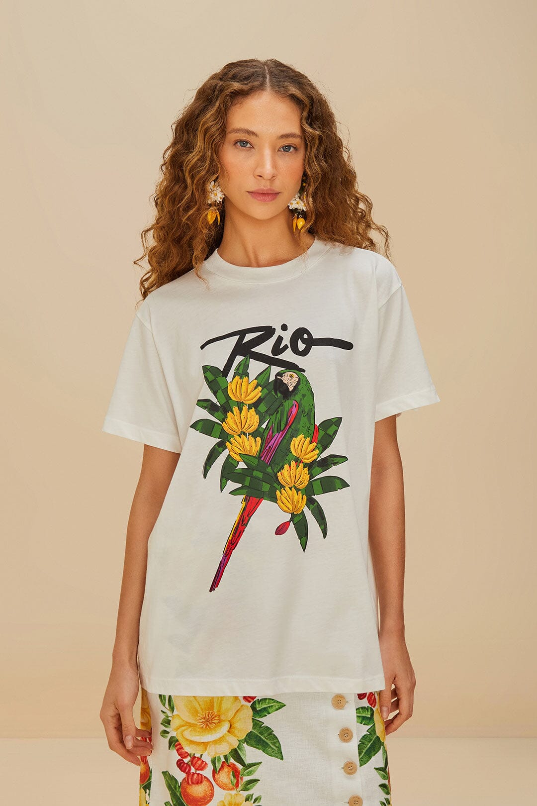 Embrace the vibrant spirit of nature with the Off-White Rio Macaw Organic Cotton T-Shirt. Crafted from responsible materials, this tee features a lively macaw perched amidst lush tropical flora, set against a soft off-white backdrop. The playful round neckline enhances its relaxed, breezy silhouette, perfect for sunny days. Let the vivid colors and artistic design transport you to a world of tropical wonder and warmth.