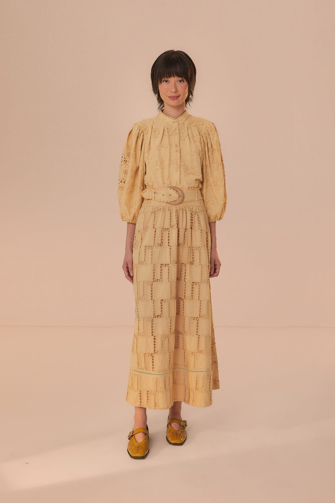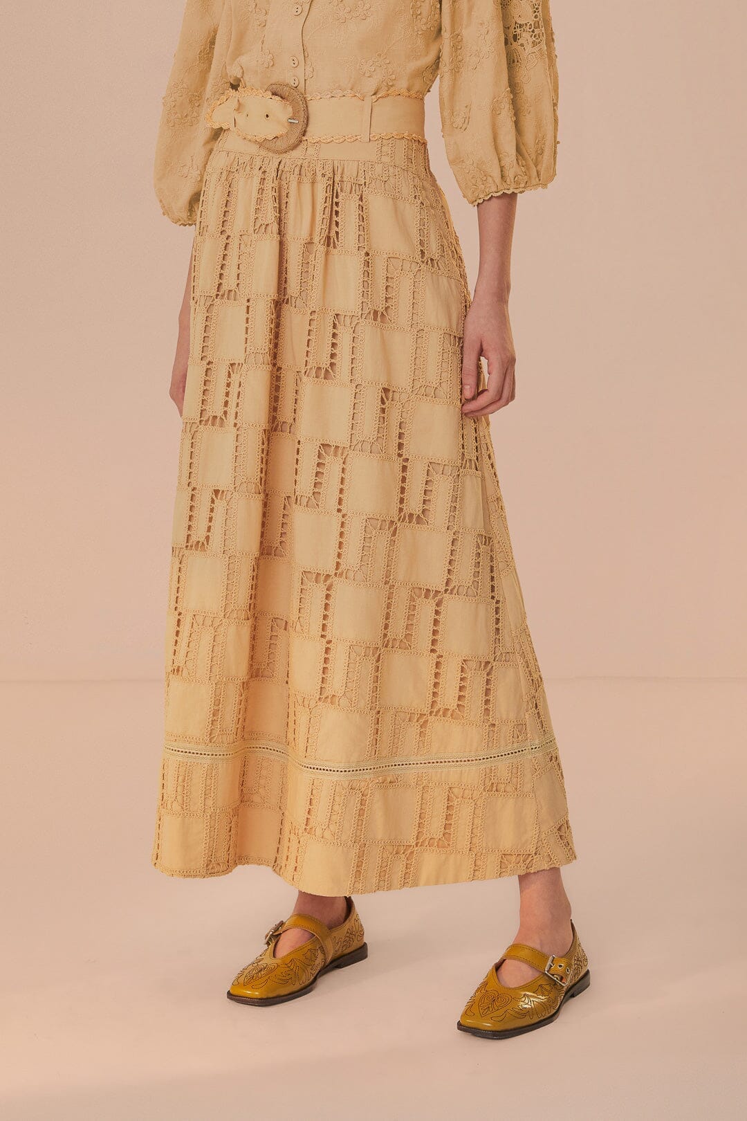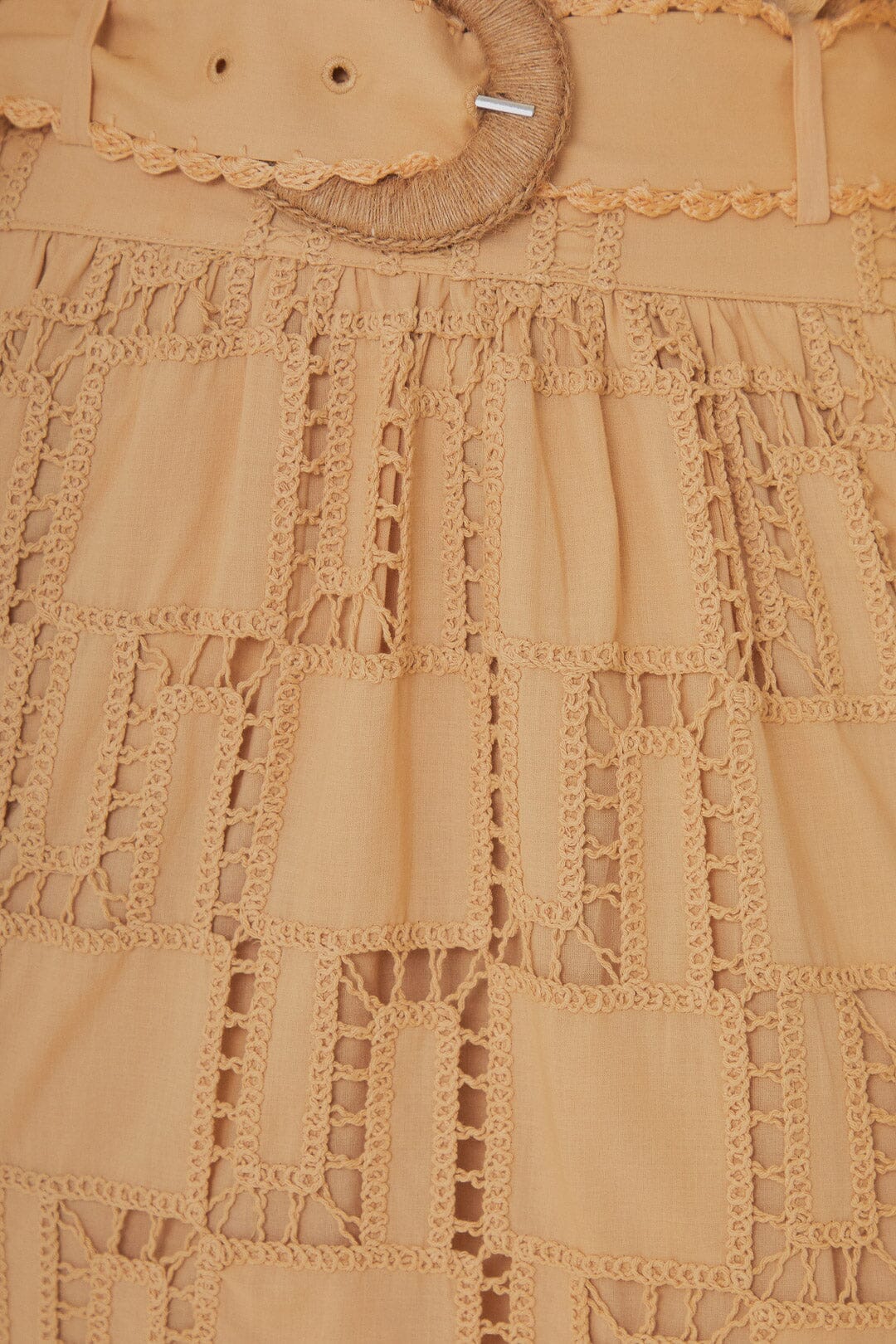 Embrace the art of crochet with the Sand Crochet Midi Skirt by FARM Rio. This enchanting piece not only offers a touch of bohemian elegance but also showcases meticulous embroidery that adds depth and intricacy to its design. Crafted from materials chosen with care for our world, the skirt features a warm sand hue interwoven with a complex pattern, lending an exquisite texture to this versatile midi silhouette. Perfect for a sun-drenched day or an elevated evening affair, it's a garment that embodies the joyful spirit of the brand.