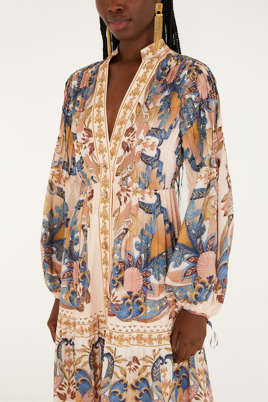 Genießen Sie tropischen Charme mit dem plissierten Midikleid „Sea Garden“ von FARM Rio in zartem Rosa. Dieses traumhafte Kleid besticht durch einen sanften V-Ausschnitt, der das Schlüsselbein wunderschön umspielt, während feine Plissees eine fließende, dynamische Silhouette erzeugen. Verziert mit zarten Korallen- und Meeresmotiven, vereint das Kleid verspielte Leichtigkeit mit müheloser Eleganz und fängt die Wärme und Lebendigkeit eines sonnenbeschienenen Gartens am Meer perfekt ein.