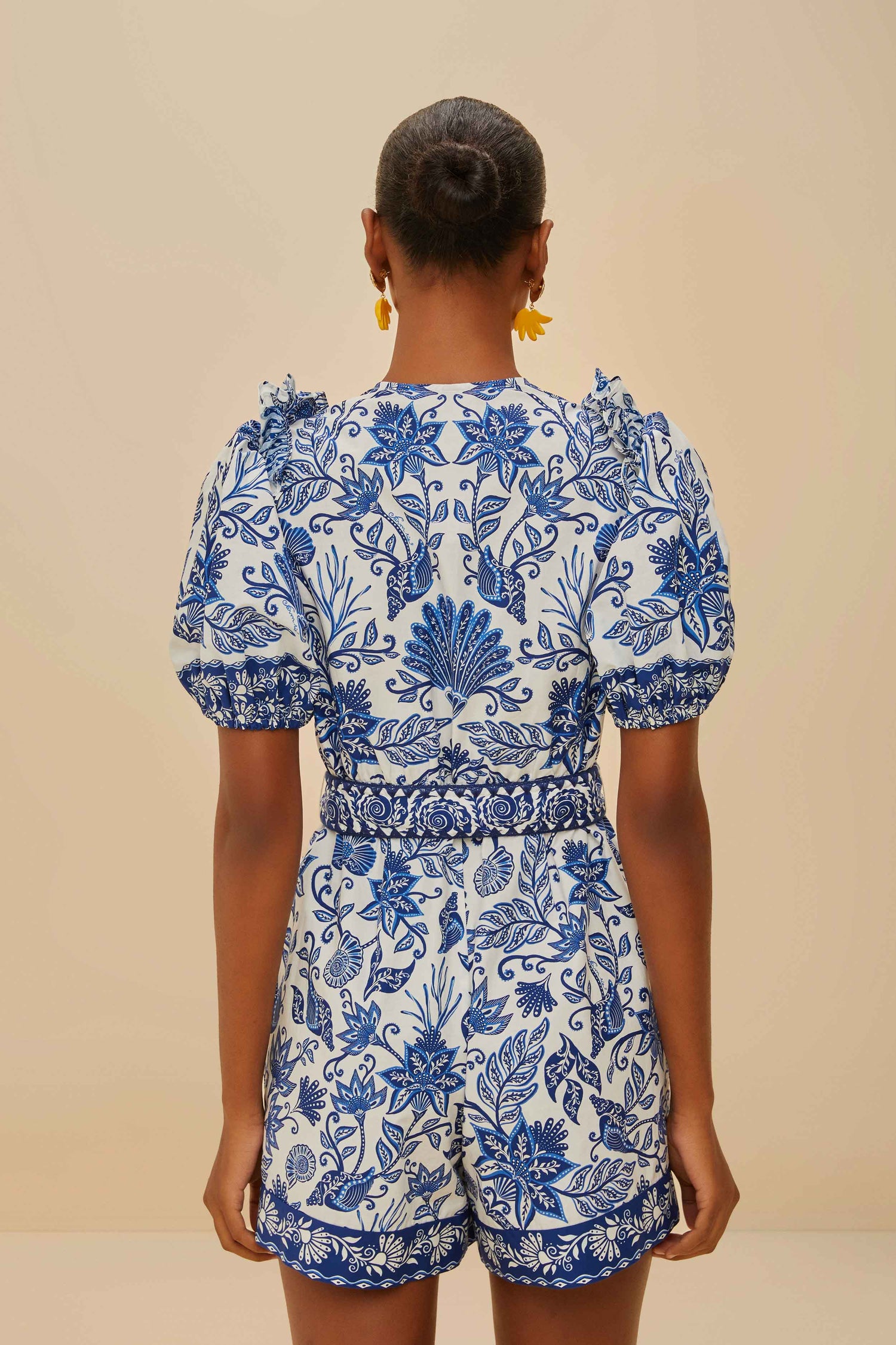 Embrace the playful elegance of the off-white shell garden organic cotton romper. This piece showcases a delightful blend of tropical florals and airy silhouettes, accentuated by its flattering V neckline. Crafted from responsible materials, the romper’s soft fabric and eye-catching pattern make it a perfect addition to any wardrobe. With its relaxed fit and distinctive design, this romper brings a touch of the exotic to everyday style.