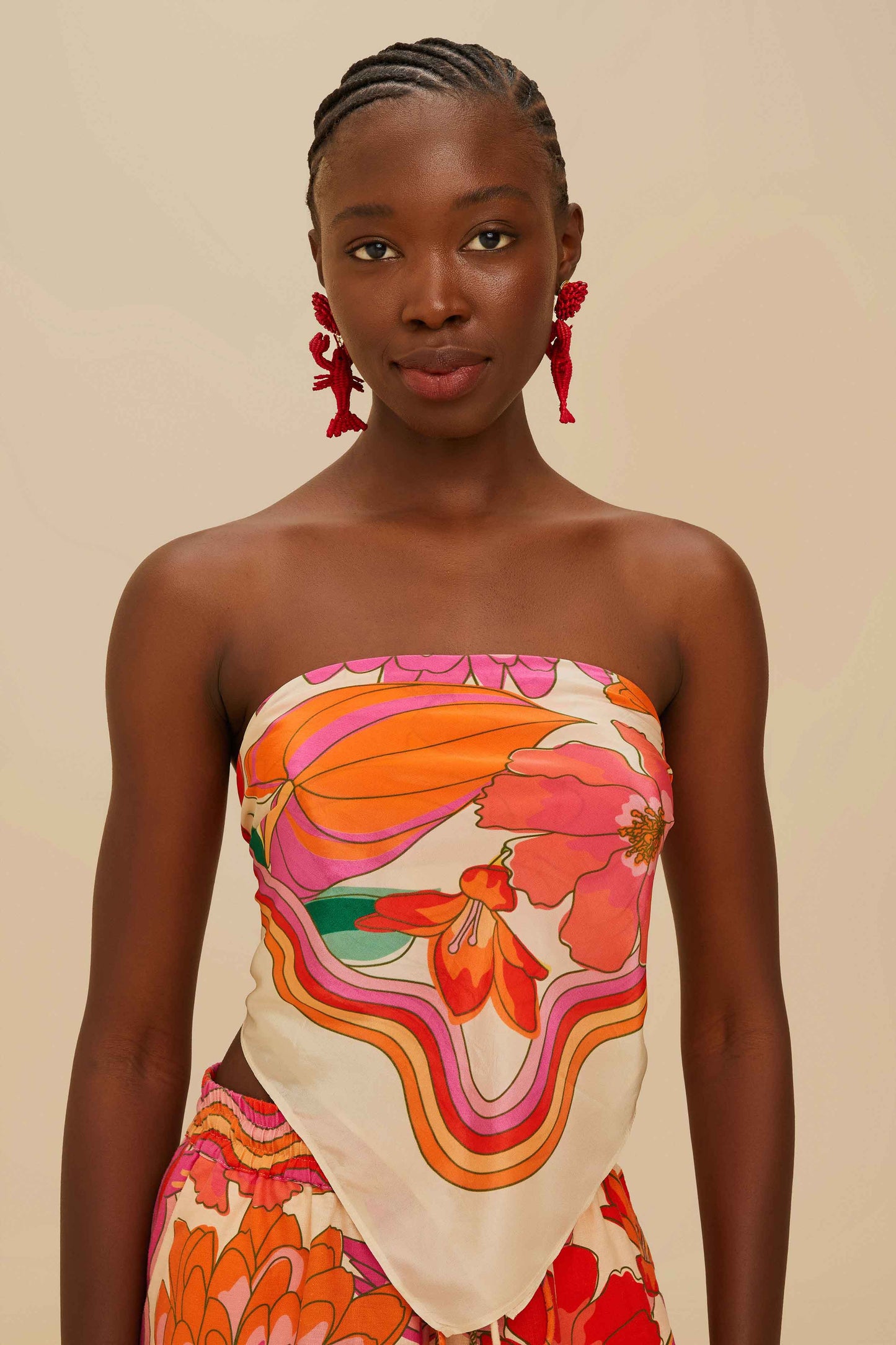 Wrap yourself in the Beige Spring Affair Scarf by FARM Rio, a celebration of vibrant blooms and undulating waves in shades of orange, pink, and cream. This playful accessory delights with its soft, luxurious fabric, perfect for adding a touch of tropical charm to any ensemble. Let its lively patterns and warm colors dance around you, creating an effortlessly chic statement that captures the essence of carefree elegance.