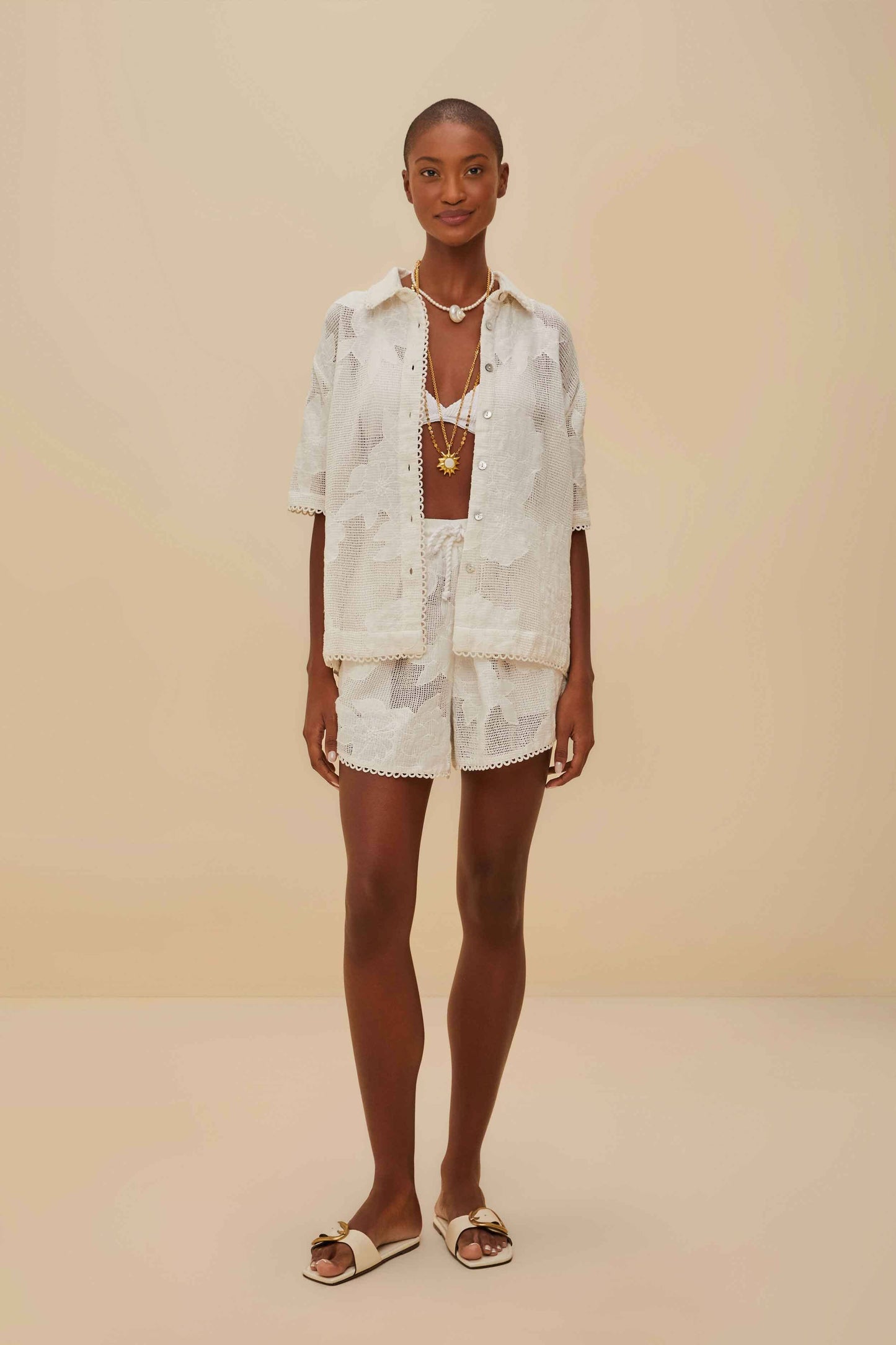 Embrace elegance with the White Flower Shirt by FARM Rio. This charming piece features an intricate floral pattern woven into a delicate, airy fabric, highlighted by a playful collar neckline. The relaxed fit and breezy silhouette create a sense of effortless grace. Accentuated with subtle scalloped edges, this shirt evokes the warmth of sunny days, inviting a feeling of carefree joy into your wardrobe.