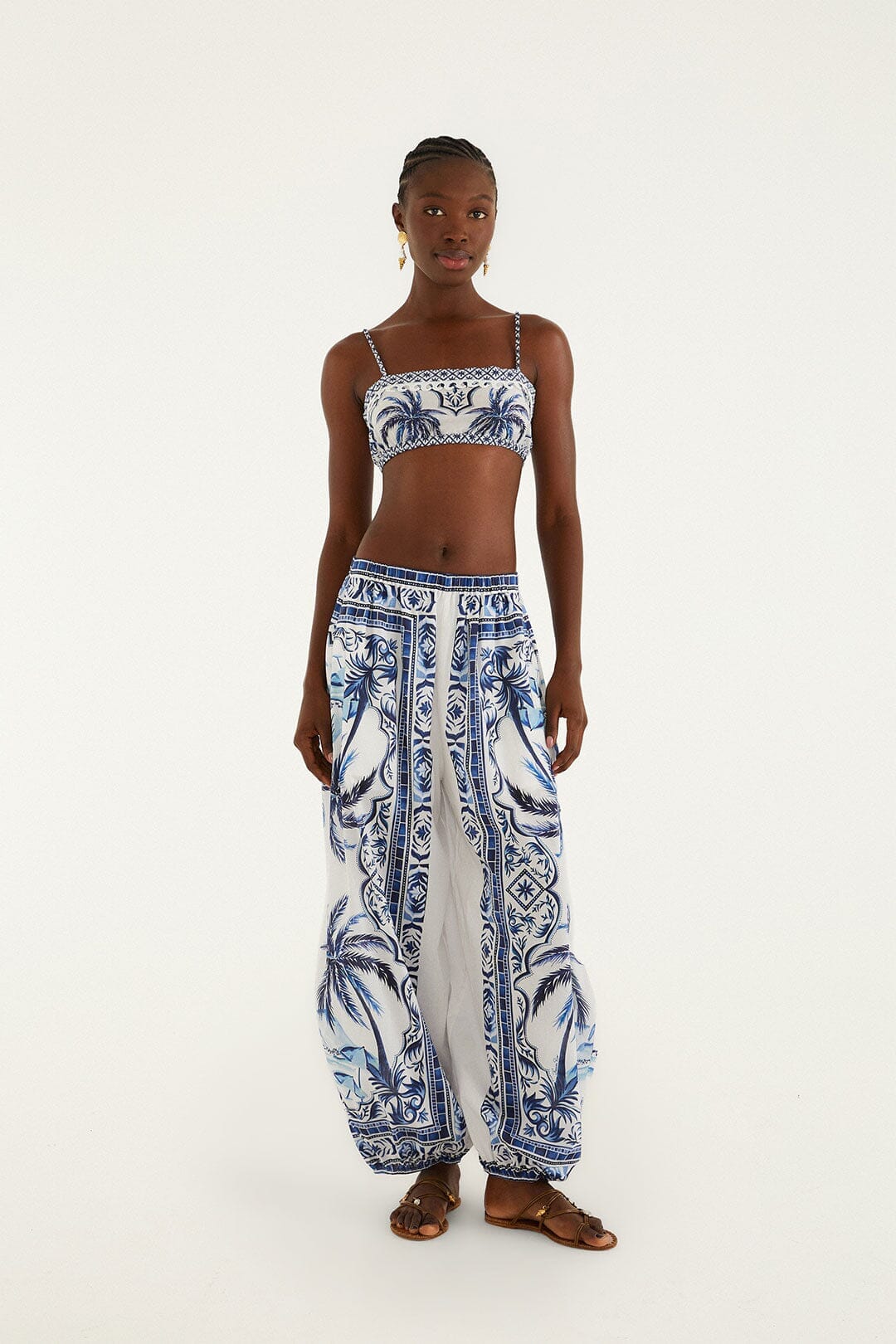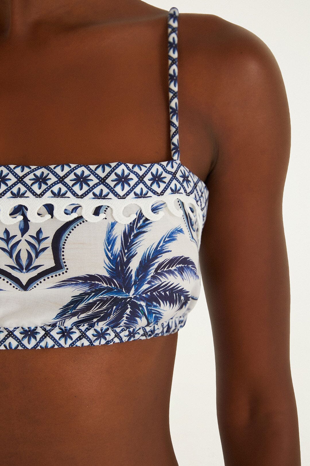 Embrace breezy charm with the Off-White Wonderful City Organic Cotton Crop Top, featuring a gentle square neckline and delicate straps that celebrate simplicity. Crafted from GOTS-certified organic cotton, this off-white treasure is adorned with intricate blue palm and tile-inspired patterns, adding a playful, artistic touch. A unique embroidered scalloped border graces the bust, offering a soft, handcrafted appeal to this eco-friendly, sun-kissed silhouette perfect for warm adventures.