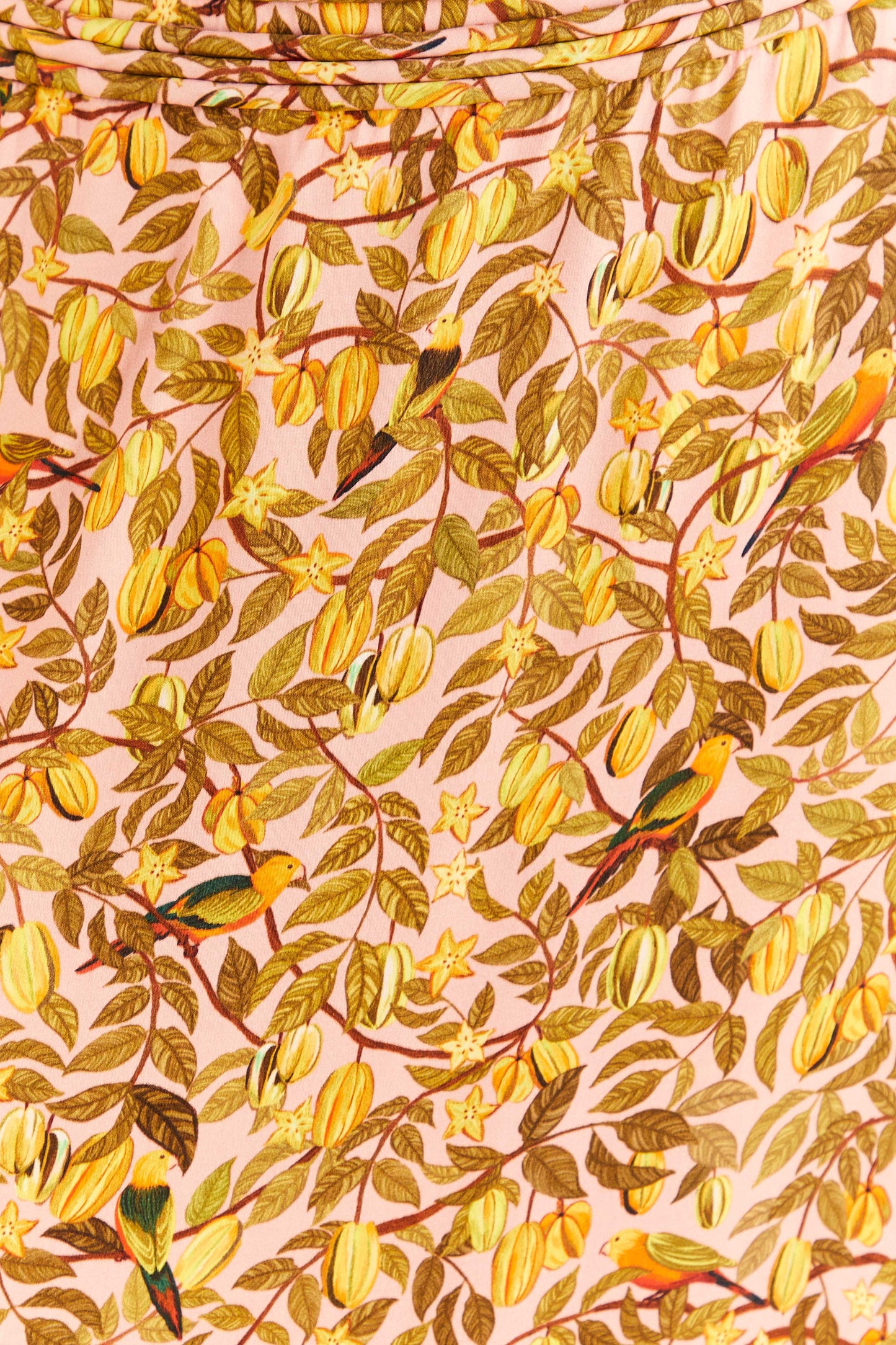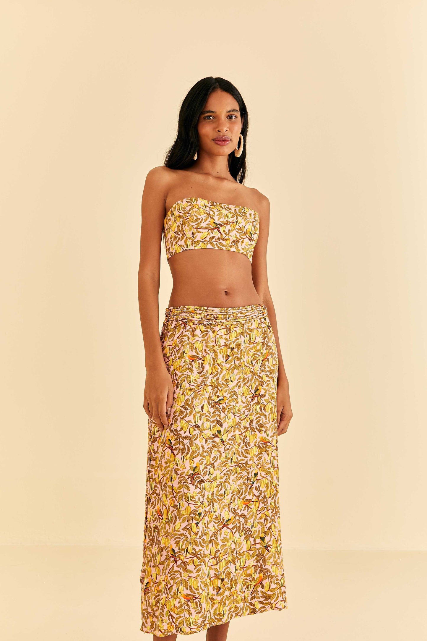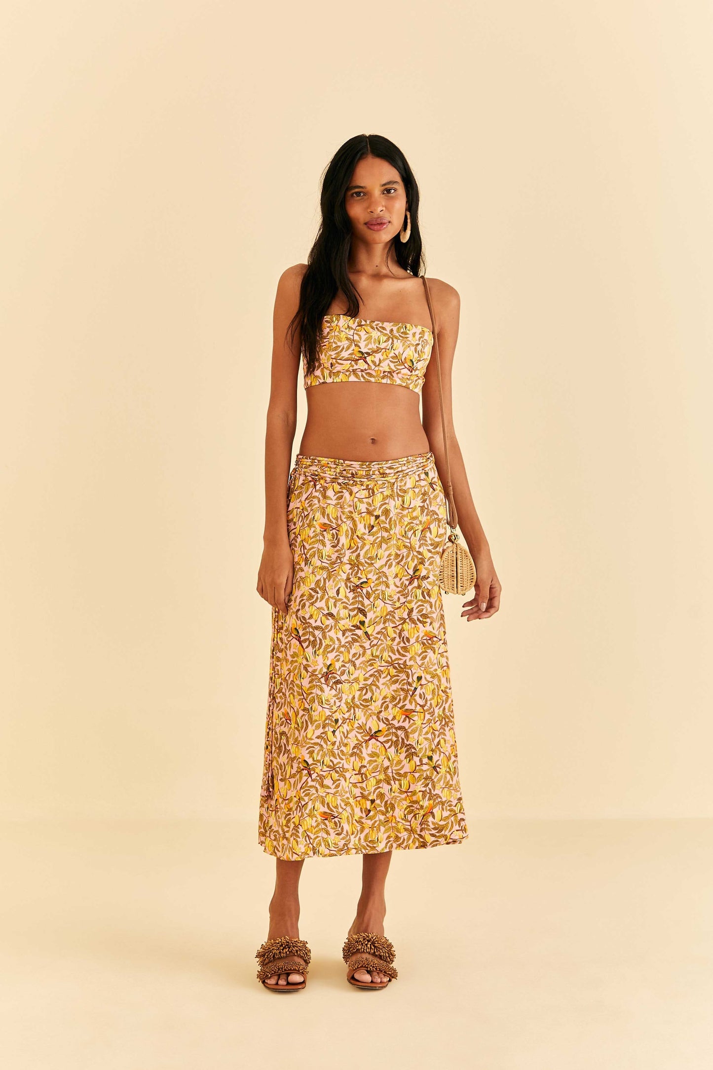 Flower through the season with the Light Pink Star Fruit Midi Skirt. This versatile bottom piece features beaded ties at the waistline, allowing you to adjust the style to however you feel. The delicate print has the best of Brazil's nature elements to give your look a tropical twist. Match it with anything, from fresh crop tops to classic tailored shirts, invite your favorite FARM Rio shoes, and get ready to make spring happen anytime you want.