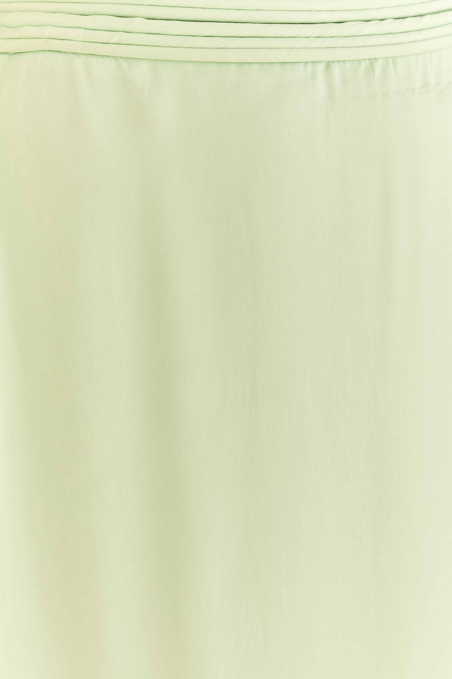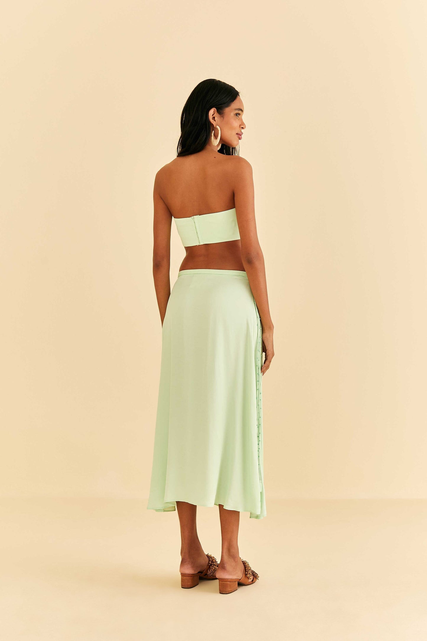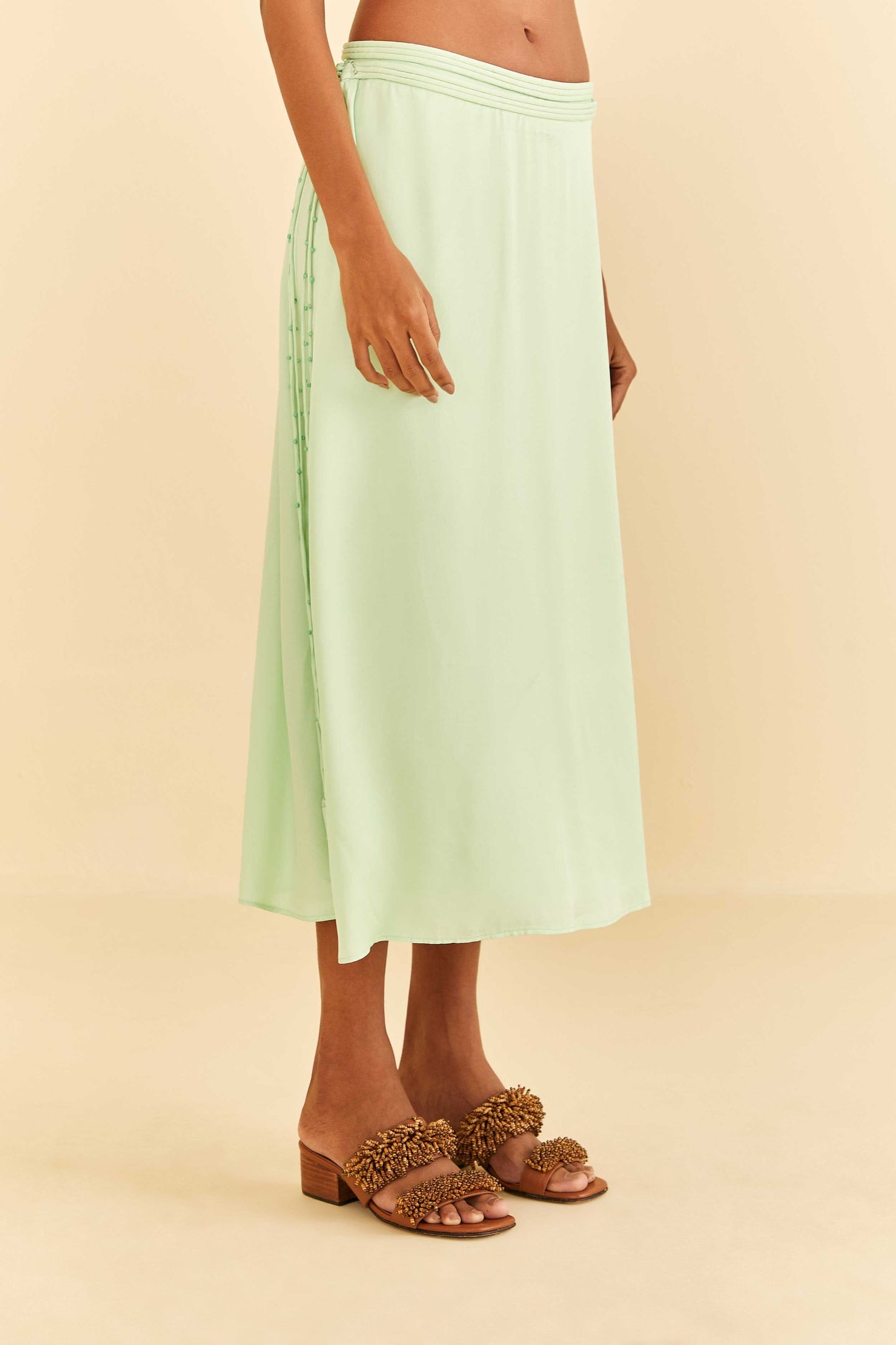 If you are looking for a new timeless staple for the mid-season and beyond, the Mint Midi Skirt is here to help you. This green solid-color piece offers infinite possibilities with its adjustable ties on the waistline. The beaded detailing brings some fun to the look while keeping it versatile to match all your plans. Invite your comfiest top and shoes to complete the look and flow your way through the day.